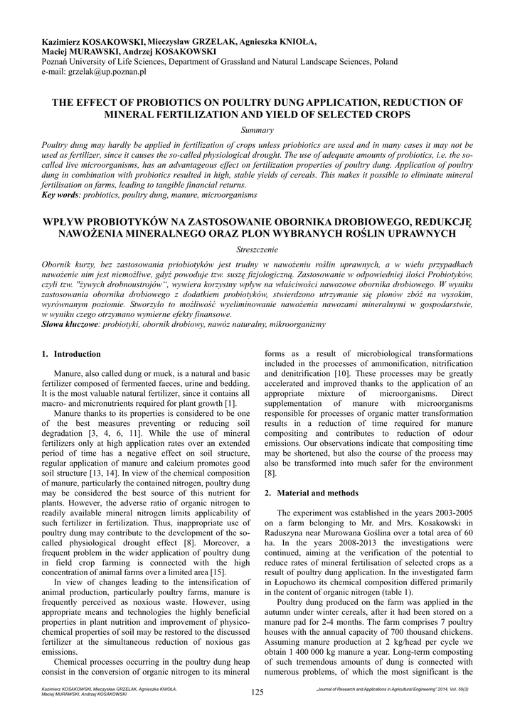 Kazimierz KOSAKOWSKI, Mieczysław GRZELAK, Agnieszka KNIOŁA, Maciej MURAWSKI, Andrzej KOSAKOWSKI Poznań University of Life Sciences, Department of Grassland and Natural Landscape Sciences, Poland e-mail: [email protected] THE EFFECT OF PROBIOTICS ON POULTRY DUNG APPLICATION, REDUCTION OF MINERAL FERTILIZATION AND YIELD OF SELECTED CROPS Summary Poultry dung may hardly be applied in fertilization of crops unless priobiotics are used and in many cases it may not be used as fertilizer, since it causes the so-called physiological drought. The use of adequate amounts of probiotics, i.e. the socalled live microorganisms, has an advantageous effect on fertilization properties of poultry dung. Application of poultry dung in combination with probiotics resulted in high, stable yields of cereals. This makes it possible to eliminate mineral fertilisation on farms, leading to tangible financial returns. Key words: probiotics, poultry dung, manure, microorganisms WPŁYW PROBIOTYKÓW NA ZASTOSOWANIE OBORNIKA DROBIOWEGO, REDUKCJĘ NAWOŻENIA MINERALNEGO ORAZ PLON WYBRANYCH ROŚLIN UPRAWNYCH Streszczenie Obornik kurzy, bez zastosowania priobiotyków jest trudny w nawożeniu roślin uprawnych, a w wielu przypadkach nawożenie nim jest niemożliwe, gdyż powoduje tzw. suszę fizjologiczną. Zastosowanie w odpowiedniej ilości Probiotyków, czyli tzw. "żywych drobnoustrojów“, wywiera korzystny wpływ na właściwości nawozowe obornika drobiowego. W wyniku zastosowania obornika drobiowego z dodatkiem probiotyków, stwierdzono utrzymanie się plonów zbóż na wysokim, wyrównanym poziomie. Stworzyło to możliwość wyeliminowanie nawożenia nawozami mineralnymi w gospodarstwie, w wyniku czego otrzymano wymierne efekty finansowe. Słowa kluczowe: probiotyki, obornik drobiowy, nawóz naturalny, mikroorganizmy forms as a result of microbiological transformations included in the processes of ammonification, nitrification and denitrification [10]. These processes may be greatly accelerated and improved thanks to the application of an appropriate mixture of microorganisms. Direct supplementation of manure with microorganisms responsible for processes of organic matter transformation results in a reduction of time required for manure compositing and contributes to reduction of odour emissions. Our observations indicate that compositing time may be shortened, but also the course of the process may also be transformed into much safer for the environment [8]. 1. Introduction Manure, also called dung or muck, is a natural and basic fertilizer composed of fermented faeces, urine and bedding. It is the most valuable natural fertilizer, since it contains all macro- and micronutrients required for plant growth [1]. Manure thanks to its properties is considered to be one of the best measures preventing or reducing soil degradation [3, 4, 6, 11]. While the use of mineral fertilizers only at high application rates over an extended period of time has a negative effect on soil structure, regular application of manure and calcium promotes good soil structure [13, 14]. In view of the chemical composition of manure, particularly the contained nitrogen, poultry dung may be considered the best source of this nutrient for plants. However, the adverse ratio of organic nitrogen to readily available mineral nitrogen limits applicability of such fertilizer in fertilization. Thus, inappropriate use of poultry dung may contribute to the development of the socalled physiological drought effect [8]. Moreover, a frequent problem in the wider application of poultry dung in field crop farming is connected with the high concentration of animal farms over a limited area [15]. In view of changes leading to the intensification of animal production, particularly poultry farms, manure is frequently perceived as noxious waste. However, using appropriate means and technologies the highly beneficial properties in plant nutrition and improvement of physicochemical properties of soil may be restored to the discussed fertilizer at the simultaneous reduction of noxious gas emissions. Chemical processes occurring in the poultry dung heap consist in the conversion of organic nitrogen to its mineral Kazimierz KOSAKOWSKI, Mieczysław GRZELAK, Agnieszka KNIOŁA, Maciej MURAWSKI, Andrzej KOSAKOWSKI 2. Material and methods The experiment was established in the years 2003-2005 on a farm belonging to Mr. and Mrs. Kosakowski in Raduszyna near Murowana Goślina over a total area of 60 ha. In the years 2008-2013 the investigations were continued, aiming at the verification of the potential to reduce rates of mineral fertilisation of selected crops as a result of poultry dung application. In the investigated farm in Łopuchowo its chemical composition differed primarily in the content of organic nitrogen (table 1). Poultry dung produced on the farm was applied in the autumn under winter cereals, after it had been stored on a manure pad for 2-4 months. The farm comprises 7 poultry houses with the annual capacity of 700 thousand chickens. Assuming manure production at 2 kg/head per cycle we obtain 1 400 000 kg manure a year. Long-term composting of such tremendous amounts of dung is connected with numerous problems, of which the most significant is the 125 „Journal of Research and Applications in Agricultural Engineering” 2014, Vol. 59(3) Table 2 presents results of analyses on natural fertilizers conducted in the years 2003-2005 as well as 2010-2011 and 2011-2012. It results from the conducted analyses that at the chicken droppings moisture content of 51.93% the weighted mean of nitrogen content is 2.36% (23.6 kg N·t-1 manure) on a fresh mass basis. At a moisture content of 54 % and 47% the level of nitrogen in manure dry matter was 3.3% and 4.63% nitrogen, respectively. This practically means that at the application of a ton of manure 17.82 kg or 21.76 kg nitrogen are supplied, respectively. In turn, at a 52.5% moisture content of droppings the result was 