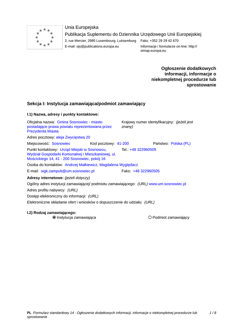 Unia Europejska Publikacja Suplementu do Dziennika Urzędowego Unii Europejskiej 2, rue Mercier, 2985 Luxembourg, Luksemburg Faks: +352 29 29 42 670 E-mail: [email protected] Informacje i formularze on-line: http:// simap.europa.eu Ogłoszenie dodatkowych informacji, informacje o niekompletnej procedurze lub sprostowanie Sekcja I: Instytucja zamawiająca/podmiot zamawiający I.1) Nazwa, adresy i punkty kontaktowe: Oficjalna nazwa: Gmina Sosnowiec - miasto posiadające prawa powiatu reprezentowana przez Prezydenta Miasta Krajowy numer identyfikacyjny: (jeżeli jest znany) _____ Adres pocztowy: aleja Zwycięstwa 20 Miejscowość: Sosnowiec Kod pocztowy: 41-200 Punkt kontaktowy: Urząd Miejski w Sosnowcu, Wydział Gospodarki Komunalnej i Mieszkaniowej, ul. Mościckiego 14, 41 - 200 Sosnowiec, pokój 16 Państwo: Polska (PL) Tel.: +48 322960505 Osoba do kontaktów: Andrzej Małkiewicz, Magdalena Wyględacz E-mail: [email protected] Faks: +48 322960505 Adresy internetowe: (jeżeli dotyczy) Ogólny adres instytucji zamawiającej/ podmiotu zamawiającego: (URL) www.um.sosnowiec.pl Adres profilu nabywcy: (URL) _____ Dostęp elektroniczny do informacji: (URL) _____ Elektroniczne składanie ofert i wniosków o dopuszczenie do udziału: (URL) _____ I.2) Rodzaj zamawiającego: Instytucja zamawiająca Podmiot zamawiający PL Formularz standardowy 14 - Ogłoszenie dodatkowych informacji, informacje o niekompletnej procedurze lub sprostowanie 1/8 Sekcja II: Przedmiot zamówienia II.1.1) Nazwa nadana zamówieniu: Zarządzanie energią w obiektach dydaktyczno – oświatowych miasta Sosnowca. II.1.2) Krótki opis zamówienia lub zakupu:(podano w pierwotnym ogłoszeniu) Przedmiotem zamówienia jest usługa zarządzania energią w budynkach edukacyjno-oświatowych miasta Sosnowca, wymienionych w załączniku nr 1. Zakres usługi obejmuje wszystkie działania efektywne ekonomicznie, zmierzające do obniżenia zużycia ciepła, energii elektrycznej, gazu i wody, poprzez wprowadzenie zintegrowanego systemu zarządzania energią w budynkach, umożliwiającego: monitoring pracy systemu zużycia energii oraz mediów technicznych, optymalizację parametrów pracy systemu energetycznego, eksploatację instalacji pobierających energię i media techniczne. Zamówienie ma na celu wyłonienie Wykonawcy, który po zapoznaniu się z aktualnym stanem technicznym i funkcjonalnym instalacji wewnętrznych budynków oraz bieżącymi wskaźnikami zużycia energii i mediów technicznych wykona i sfinansuje: dokumentację projektową i wykonawczą modernizacji węzłów cieplnych i/lub węzłów rozdziału ciepła oraz instalacji wewnętrznych odbierających ciepła, montaż urządzeń służących do monitorowania, sterowania oraz transmisji danych pomiarowych, które przez okres trwania umowy stanowić będą własność Wykonawcy, z opcją ich wykupu za 0,01% wartości początkowej po zakończeniu umowy, wdroży zintegrowany system optymalnego zarządzania gospodarką energetyczną i mediami technicznymi oraz utrzyma należyte jego działanie przez cały okres objęty umową, udzieli gwarancji uzyskania oszczędności w zużyciu ciepła i energii elektrycznej, przy zachowaniu komfortu cieplnego oraz oświetleniowego, zgodnie z obowiązującymi przepisami, sprawować będzie ciągły nadzór nad należytym funkcjonowaniem systemu zarządzania energią, w celu osiągnięcia gwarantowanych wskaźników energetycznych i efektów ekonomicznych przedsięwzięcia. Wykonawca na podstawie swojej wiedzy i doświadczenia oraz w oparciu o aktualną charakterystykę energetyczną obiektów, wymienionych w załączniku nr 1, określi gwarantowane wskaźniki zużycia energii. Przedmiot zamówienia zostanie doprecyzowany i uzupełniony na etapie prowadzenia negocjacji/ dialogu z Wykonawcami. Zamawiający oczekuje, że w trakcie negocjacji Wykonawcy – po zapoznaniu się z obiektami zaproponują najbardziej optymalne rozwiązania, służące realizacji przedmiotu zamówienia, oraz gwarantowany stopień redukcji zużycia energii i mediów wynikający z przyjętych rozwiązań technicznych. Propozycje wskaźnika redukcji zużycia energii i mediów technicznych w poszczególnych obiektach posłużą do określenia w SIWZ gwarantowanego przez Wykonawców średniego wskaźnika redukcji, który będzie użyty w SIWZ jako wskaźnik minimalny, warunkujący dopuszczenie oferty do przetargu. Zamawiający oczekuje, że w wyniku realizacji przedmiotu zamówienia zostaną osiągnięte następujące wskaźniki: stopień redukcji poboru energii cieplnej wyniesie co najmniej 15 %, całkowita wartość świadczonej usługi nie przekroczy 70 % wartości zaoszczędzonej energii. Załacznik Nr 1 L.p. Nazwa jednostki organi zacyjnej/osoby prawnej Adres 1. Gmina Sosnowiec Zwycięstwa 20; 41-200 Sosnowiec 1. Zespół Szkół nr 1 Zamkowa 7 2. Zespół Szkół Ogólnokształcących nr 1 Staszica 62 3. Zespół Szkół Ogólnokształcących nr 2 Czeladzka 58 4. Zespół Szkół Ogólnokształcących nr 3 Piłsudskiego 114 PL Formularz standardowy 14 - Ogłoszenie dodatkowych informacji, informacje o niekompletnej procedurze lub sprostowanie 2/8 5. Zespół Szkół Ogólnokształcących nr 5 Bohaterów Monte Cassino 46 6. Zespół Szkół Ogólnokształcących nr 7 Gwiezdna 2 7. Zespół Szkół Ogólnokształcących nr 8 Hutnicza 6 8. Zespół Szkół Ogólnokształcących nr 9 Jedności 7 9. Zespół Szkół Ogólnokształcących nr 10 Czołgistów 12 10. Zespół Szkół Ogólnokształcących nr 13 Baczyńskiego 14 11. Zespół Szkół Ogólnokształcących nr 14 Kisielewskiego 4b 12. Zespół Szkół Ogólnokształcących nr 15 Zillingera 1 13. Szkoła Podstawowa nr 1 im. Stanisława Konarskiego Niepodległości 11 14. Szkoła Podstawowa nr 4 im. Juliana Tuwima Kościelna 18 15. Szkoła Podstawowa nr 6 im. Juliusza Słowackiego Wawel 13 16. Szkoła Podstawowa nr 8 im. Karola Wojtyły Teatralna 8 17. Szkoła Podstawowa nr 9 im. Marii Konopnickiej Mieroszewskich 