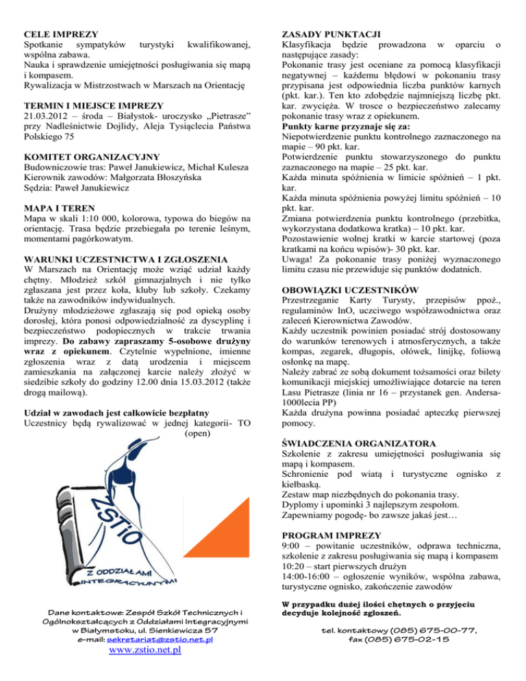 CELE IMPREZY Spotkanie sympatyków turystyki kwalifikowanej, wspólna zabawa. Nauka i sprawdzenie umiejętności posługiwania się mapą i kompasem. Rywalizacja w Mistrzostwach w Marszach na Orientację TERMIN I MIEJSCE IMPREZY 21.03.2012 – środa – Białystok- uroczysko „Pietrasze” przy Nadleśnictwie Dojlidy, Aleja Tysiąclecia Państwa Polskiego 75 KOMITET ORGANIZACYJNY Budowniczowie tras: Paweł Janukiewicz, Michał Kulesza Kierownik zawodów: Małgorzata Błoszyńska Sędzia: Paweł Janukiewicz MAPA I TEREN Mapa w skali 1:10 000, kolorowa, typowa do biegów na orientację. Trasa będzie przebiegała po terenie leśnym, momentami pagórkowatym. WARUNKI UCZESTNICTWA I ZGŁOSZENIA W Marszach na Orientację może wziąć udział każdy chętny. Młodzież szkół gimnazjalnych i nie tylko zgłaszana jest przez koła, kluby lub szkoły. Czekamy także na zawodników indywidualnych. Drużyny młodzieżowe zgłaszają się pod opieką osoby dorosłej, która ponosi odpowiedzialność za dyscyplinę i bezpieczeństwo podopiecznych w trakcie trwania imprezy. Do zabawy zapraszamy 5-osobowe drużyny wraz z opiekunem. Czytelnie wypełnione, imienne zgłoszenia wraz z datą urodzenia i miejscem zamieszkania na załączonej karcie należy złożyć w siedzibie szkoły do godziny 12.00 dnia 15.03.2012 (także drogą mailową). Udział w zawodach jest całkowicie bezpłatny Uczestnicy będą rywalizować w jednej kategorii- TO (open) ZASADY PUNKTACJI Klasyfikacja będzie prowadzona w oparciu o następujące zasady: Pokonanie trasy jest oceniane za pomocą klasyfikacji negatywnej – każdemu błędowi w pokonaniu trasy przypisana jest odpowiednia liczba punktów karnych (pkt. kar.). Ten kto zdobędzie najmniejszą liczbę pkt. kar. zwycięża. W trosce o bezpieczeństwo zalecamy pokonanie trasy wraz z opiekunem. Punkty karne przyznaje się za: Niepotwierdzenie punktu kontrolnego zaznaczonego na mapie – 90 pkt. kar. Potwierdzenie punktu stowarzyszonego do punktu zaznaczonego na mapie – 25 pkt. kar. Każda minuta spóźnienia w limicie spóźnień – 1 pkt. kar. Każda minuta spóźnienia powyżej limitu spóźnień – 10 pkt. kar. Zmiana potwierdzenia punktu kontrolnego (przebitka, wykorzystana dodatkowa kratka) – 10 pkt. kar. Pozostawienie wolnej kratki w karcie startowej (poza kratkami na końcu wpisów)- 30 pkt. kar. Uwaga! Za pokonanie trasy poniżej wyznaczonego limitu czasu nie przewiduje się punktów dodatnich. OBOWIĄZKI UCZESTNIKÓW Przestrzeganie Karty Turysty, przepisów ppoż., regulaminów InO, uczciwego współzawodnictwa oraz zaleceń Kierownictwa Zawodów. Każdy uczestnik powinien posiadać strój dostosowany do warunków terenowych i atmosferycznych, a także kompas, zegarek, długopis, ołówek, linijkę, foliową osłonkę na mapę. Należy zabrać ze sobą dokument tożsamości oraz bilety komunikacji miejskiej umożliwiające dotarcie na teren Lasu Pietrasze (linia nr 16 – przystanek gen. Andersa1000lecia PP) Każda drużyna powinna posiadać apteczkę pierwszej pomocy. ŚWIADCZENIA ORGANIZATORA Szkolenie z zakresu umiejętności posługiwania się mapą i kompasem. Schronienie pod wiatą i turystyczne ognisko z kiełbaską. Zestaw map niezbędnych do pokonania trasy. Dyplomy i upominki 3 najlepszym zespołom. Zapewniamy pogodę- bo zawsze jakaś jest… PROGRAM IMPREZY 9:00 – powitanie uczestników, odprawa techniczna, szkolenie z zakresu posługiwania się mapą i kompasem 10:20 – start pierwszych drużyn 14:00-16:00 – ogłoszenie wyników, wspólna zabawa, turystyczne ognisko, zakończenie zawodów W przypadku dużej ilości chętnych o przyjęciu decyduje kolejność zgłoszeń. www.zstio.net.pl ZESPÓŁ SZKÓŁ TECHNICZNYCH I OGÓLNOKSZTAŁCĄCYCH Z ODDZIAŁAMI INTEGRACYJNYMI IM. STANISŁAWA STASZICA W BIAŁYMSTOKU ORAZ NADLEŚNICTWO DOJLIDY ZAPRASZAJĄ NA WSPÓLNE OBCHODY DNIA WIOSNY I MISTRZOSTWA W MARSZACH NA ORIENTACJĘ Białystok, Las Pietrasze 21 marca 2012 SERDECZNIE ZAPRASZAMY