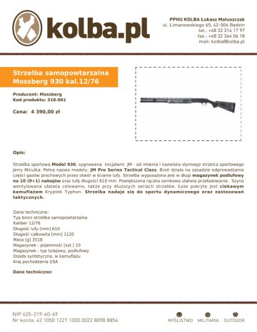 Strzelba samopowtarzalna Mossberg 930 kal.12/76 Producent: Mossberg Kod produktu: 318-001 Cena: 4 390,00 zł Opis: Strzelba sportowa Model 930, sygnowana inicjałami JM - od imienia i nazwiska słynnego strzelca sportowego Jerry Miculka. Pełna nazwa modelu: JM Pro Series Tactical Class. Broń działa na zasadzie odprowadzania części gazów prochowych przez otwór w ścianie lufy. Strzelba wyposażona jest w długi magazynek podlufowy na 10 (9+1) nabojów oraz lufę długości 610 mm. Powiększona rączka zamkowa ułatwia przeładowanie. Szyna wentylowana ułatwia celowanie, także przy dłuższych seriach strzałów. Łoże pokryte jest ciekawym kamuflażem Kryptek Typhon. Strzelba nadaje się do sportu dynamicznego oraz zastosowań taktycznych. Dane techniczne: Typ broni strzelba samopowtarzalna Kaliber 12/76 Długość lufy [mm] 610 Długość całkowita [mm] 1120 Masa [g] 3518 Magazynek - pojemność [szt.] 10 Magazynek - typ tulejowy, podlufowy Osada syntetyczna, w kamuflażu Kraj pochodzenia USA Dane techniczne: ● ● ● ● ● ● ● ● ● Typ broni: strzelba samopowtarzalna Kaliber: 12/76 Długość lufy [mm]: 610 Długość całkowita [mm]: 1120 Masa [g]: 3518 Magazynek - pojemność [szt.]: 10 (9+1) Magazynek - typ: tulejowy, podlufowy Osada: syntetyczna, w kamuflażu Kraj pochodzenia USA