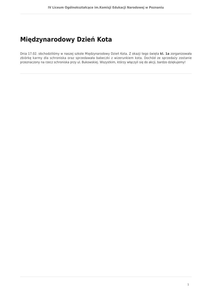 IV Liceum Ogólnokształcące im.Komisji Edukacji Narodowej w Poznaniu Międzynarodowy Dzień Kota Dnia 17.02. obchodziliśmy w naszej szkole Międzynarodowy Dzień Kota. Z okazji tego święta kl. 1a zorganizowała zbiórkę karmy dla schroniska oraz sprzedawała babeczki z wizerunkiem kota. Dochód ze sprzedaży zostanie przeznaczony na rzecz schroniska przy ul. Bukowskiej. Wszystkim, którzy włączyli się do akcji, bardzo dziękujemy! 1