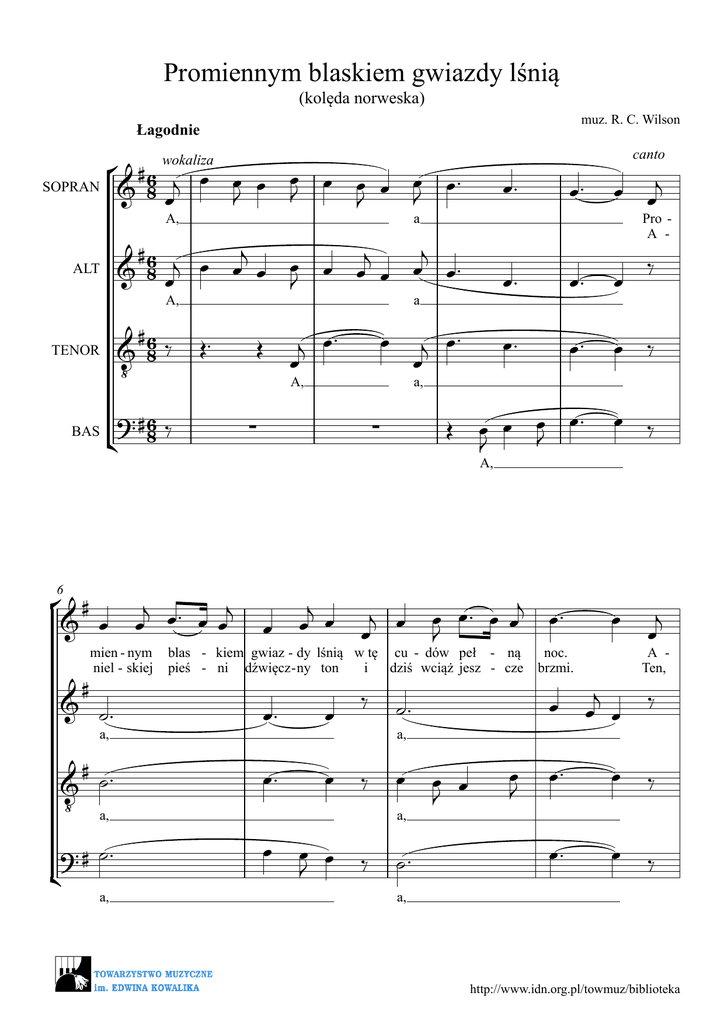 Promiennym blaskiem gwiazdy lśnią (kolęda norweska) muz. R. C. Wilson Łagodnie ° #6 & 8 œj œ œJ œ œJ œ œJ œ œJ œ ™ wokaliza SOPRAN A, A, TENOR #6 & 8‰ ‹ Œ™ ? #6 ‰ ¢ 8 ° # & œ 6 j j œ œ™ œ œ mien - nym niel - skiej # & ˙™ a, ¢ a #6 j j j j œ œ œ œ œ & 8œ œ J œ œ œ™ ALT BAS œ™ # ™ & ˙ ‹ a, ? # ˙™ a, Œ œ™ a j œ™ œ j œ™ œ œ A, œ™ œ œj œ™ œ œ™ œ™ canto Pro A - ‰ œ ‰ a, ∑ ∑ Œ œ œ œJ œ™ J œ ‰ A, œ j œ œ j œ œ j œ œ™ œ œ J blas - kiem gwiaz - dy lśnią w tę cu - dów peł - ną pieś - ni dźwięcz - ny ton i dziś wciąż jesz - cze œ™ œ œ™ œ ‰ œ a, œ œ œ J ‰ ˙™ noc. brzmi. œ ˙™ a, ‰ œ™ œ œ J œ J œ™ œ™ œ j œ œ j œ A Ten, ‰ œ ‰ œ ‰ a, http://www.idn.org.pl/towmuz/biblioteka ° # & œ 2 j j œ œ™ œ œ œ j U œ œ j œ & ˙™ œ U j œ œ ‰ # & ˙™ ‹ a, œ™ U œ 10 # niel - skie pie co zo - sta - nia słod - ko brzmią, zwia - stu - ją Bo - żą - wił w nie - bie tron, dla cie - bie w żłób - ku a, ¢ j j œ œ™ œ œ œ ™ œ ? # ˙™ a œ™ ‰ œ™ a U œ œ™ œ™ œ™ ˙™ ‰ a, a ° # ™ f œ™ & ™ œj 14 Niech Niech f brzmią, brzmi, Niech Niech f brzmią, brzmi, # ™ & ™ œj œ™ œ j œ™ œ œ j œ œ™ j œ œ niech niech œ niech niech brzmią, brzmi, brzmią, brzmi, j œ niech niech niech niech œ™ œ brzmią, brzmi, œ™ œ™ œ œ™ œ œ™ œ j œ œ œ j œ J œ niech gło - szą cud, bo niech brzmi ta pieśń, w tę œ brzmią, brzmi, moc. śpi. j j j œ œ œ œ œ niech gło - szą cud, bo niech brzmi ta pieśń, w tę # œ™ œ œ & ™™ œj œ œJ J ‹ Niech roz-brzmie-wa - ją u - ro - czys - ty pie - nia chwał, mi - łoś - ci gło - szą go - dów czas niech brzmi i na - sza œ œ œ™ œ œ J J cud, pieśń, Niech roz - brzmie - wa - ją W ten u - ro - czys - ty pie - nia chwał, mi - łoś - ci gło - szą go - dów czas niech brzmi i na - sza cud, pieśń, ? # ™™ œ ¢ J W ten f œ œ œ™ œ œ J J œ œ œ j J œ œ œ œ œ J J œ œ œ œ™ œ œ J J œ™ œ™ œ œ J bo w tę œ œ J bo w tę http://www.idn.org.pl/towmuz/biblioteka ° # & œ 19 # ¢ U j œ œ j œ œ U j œ œ Bóg nam z nie - ba Sy - na dał, cu - dów noc od - daj - my wraz & œ # j j œ œ™ œ œ œ Bóg nam z nie cu - dów noc & œ ‹ Bóg - j œ œ ba Sy - na dał, od - daj - my wraz œ œ™ œ œ J J œ U j œ œ œ j U œ œ nam z nie - ba Sy - na dał, cu - dów noc od - daj - my wraz ?# œ œ œ J Bóg nam z nie cu - dów noc - œ J ba Sy - na dał, od - daj - my wraz j œ œ j j œ œ™ œ œ j œ œ j œ œ œ J œ œ J by zba - wić Kró - lo - wi grzesz - ny kró - lów j œ by zba - wić grzes - zny Kró - lo - wi kró - lów œ j œ œ™ lud. cześć. œ œ J œ J œ ™™ ™™ œ™ œ œ™ œ ™™ œ™ œ ™™ lud. cześć. by zba - wić grze - szny lud. Kró - lo - wi kró - lów cześć. j œ œ 3 by zba - wić grze - szny lud. Kró - lo - wi kró - lów cześć. http://www.idn.org.pl/towmuz/biblioteka