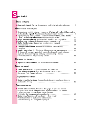 S pis treści Słowo wstępne ! Sławomir Jacek Żurek, Romantyzm na lekcjach języka polskiego . . . Głosy 5 wokół romantyzmu ! Romantyzm po 200 latach – rozmowa Wacława Pyczka i Sławomira Jacka Żurka z prof. Marianem Maciejewskim (KUL) . . . . . . . . . . 8 ! Z perspektywy pozytywizmu – rozmowa Sławomira Jacka Żurka z prof. Józefem Bachórzem (Uniwersytet Gdański) . . . . . . . . . . . . . . 17 ! Alina Kowalczykowa, Kobiety dwóch polskich romantyków . . . . . . 25 ! Małgorzata Łukaszuk, Romantyzm czy romantyzmy? . . . . . . . . . . . . . 32 ! Rafał Rutkowski, Najnowsza poezja wobec tradycji romantycznej . . . . . . . . . . . . . . . . . . . . . . . . . . . . . . . . . . . . . . . . . . . . . . . 37 ! Grzegorz Olszański, Telefon do Norwida, czyli analogi i analogie . . . . . . . . . . . . . . . . . . . . . . . . . . . . . . . . . . . . . . . . . . . . . . . . . . 44 ! Maciej Zaremba, Gry fabularne i komputerowe a romantyzm . . . . . 49 ! O ciemnych mocach, patosie i wzniosłości oraz Europie ojczyzn, czyli jak dziś odczytujemy tradycję romantyczną – debata o romantyzmie we współczesnej szkole . . . . . . . . . . . . . . . . . . . . . . . . 53 Od stażu do dyplomu ! Agnieszka Wojnowska, Co wolno Mickiewiczowi? . . . . . . . . . . . . . . . 63 C zas na wiersz! ! Jacek Brzozowski, Lozański urywek Mickiewicza . . . . . . . . . . . . . . . . 69 ! Ewa Obara-Grączewska, Mit romantycznego artysty. O wierszu Poeta Andrzeja Bursy . . . . . . . . . . . . . . . . . . . . . . . . . . . . . . . . . 73 Językoznawcze strony ! Katarzyna Bocheńska, Komunikacja interpersonalna w Zemście Aleksandra Fredry . . . . . . . . . . . . . . . . . . . . . . . . . . . . . . . . . . . . . . . . . . . . 80 B ombowe lekcje ! Iwona Otulakowska, Od erosa do agape. O potędze miłości na podstawie Pieśni nad pieśniami, Hymnu o miłości św. Pawła i przypowieści o miłosiernym Samarytaninie. Cykl zajęć dla klas ponadgimnazjalnych . . . . . . . . . . . . . . . . . . . . . . . . . . 85 ! Katarzyna Wrembel, Dwa obrazy – dwa światy. Wokół zaślubin w malarstwie i literaturze. Scenariusz lekcji dla klas gimnazjalnych . . . . . . . . . . . . . . . . . . . . . . . . . . 93 ! Katarzyna Michałek, Życie z Bogiem, „życie bez boga”. Scenariusz lekcji dla klas ponadgimnazjalnych . . . . . . . . . . . . . . . . . . . . 100 ! Natalia Hoffmann, Agnieszka Kasprzycka, Katarzyna Łęk, Metodą biograficzną o korzeniach twórczości Tolkiena. Scenariusz lekcji dla klas ponadgimnazjalnych . . . . . . . . . . . . . . . . . . . . 108 ! Ilona Bujnowicz-Szewczyk, Psychologiczne mechanizmy oddziaływania reklamy telewizyjnej. Scenariusz lekcji dla klas ponadgimnazjalnych . . . . . . . . . . . . . . . . . . . . . . . . . . . . . . . . . . . 117 M etodycy radzą ! Stanisław Bortnowski, Kordian teatralny . . . . . . . . . . . . . . . . . . . . . . . . 124 ! Aleksander Nawarecki, Dorota Siwicka, Kultura romantyczna dzisiaj . . . . . . . . . . . . . . . . . . . . . . . . . . . . . . . . . . . . . . . . . . . . . . . . . . . . . 129 C zytamy ze zrozumieniem ! Beata Jesionek-Biskupska, Elżbieta Żurek, Gombrowicz i romantyzm. Ćwiczenia dla klas maturalnych . . . . . . . . 137 ! Propozycje odpowiedzi na pytania z działu Ćwiczymy czytanie ze zrozumieniem podręcznika Ewy Paczoskiej Przeszłość to dziś klasa II, cz. II . . . . . . . . . . . . . . . . . . . . . . . . . . . . . . . . . . . . . . . . . . . . . . . 142 Uwaga! Filozofia w szkole! ! Jacek Wojtysiak, Kaspar Traussig czyta Kanta . . . . . . . . . . . . . . . . . . . . 147 P rzekrój edukacyjny ! Klemens Stróżyński, Kształcenie pozornie humanistyczne a droga do Unii Europejskiej . . . . . . . . . . . . . . . . . . . . . . . . . . . . . . . . . . . 152 ! Marta Jedliczko-Malik, Czy istnieją dwie wersje Janka Muzykanta? Sienkiewicz kontra ściągi . . . . . . . . . . . . . . . . . . . . . . . . . . . . . . . . . . . . . 157 ! Mateusz Stróżyński, Gwiezdna Ewangelia według George’a Lucasa . . . . . . . . . . . . . . . . . . . . . . . . . . . . . . . . . . . . . . . . . . . . . 161 P ółka wydawnicza ! Gertruda Wichary, Rzecz o potrzebie pielęgnowania narodowej godności i tożsamości . . . . . . . . . . . . . . . . . . . . . . . . . . . . . . . . . . . . . . . . 168 P rawo oświatowe (poradnik) ! Sebastian Ignaszczak, Rozwiązanie z nauczycielem stosunku pracy z przyczyn leżących po stronie pracodawcy oraz stan nieczynny . . . . . 174