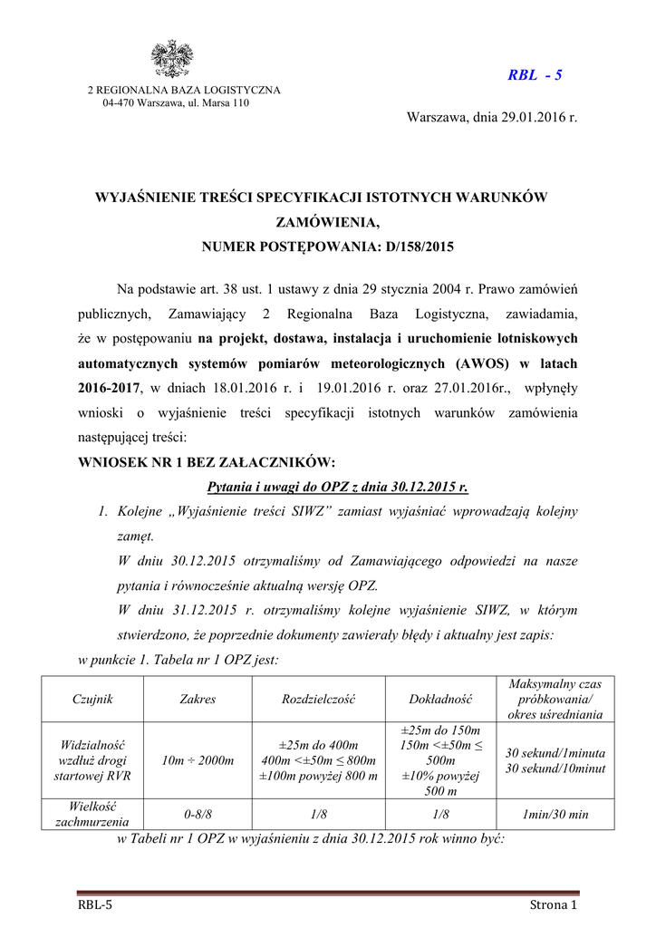 RBL - 5 2 REGIONALNA BAZA LOGISTYCZNA 04-470 470 Warszawa, ul. Marsa 110 Warszawa, dnia 29.01.2016 r. WYJAŚNIENIE TREŚCI ŚCI CI SPECYFIKACJI ISTOTNYCH WARUNKÓW ZAMÓWIENIA, NUMER POSTĘPOWANIA: POST D/158/2015 Na podstawie art. 38 ust. 1 ustawy z dnia 29 stycznia 2004 r. Prawo zamówień zamówie publicznych, Zamawiający ący 2 Regionalna Baza Logistyczna Logistyczna, zawiadamia, że w postępowaniu na projekt, dostawa, instalacja i uruchomienie lotniskowych automatycznych systemów pomiarów meteorologicznych (AWOS) w latach 2016-2017, w dniach 18.01.2016 18.01. r. i 19.01.2016 r. oraz 27.01.2016r., 27.01.2016r. wpłynęły wnioski o wyjaśnienie nienie treści tre ci specyfikacji istotnych warunków zamówienia następującej treści: WNIOSEK NR 1 BEZ ZAŁACZNIKÓW: Pytania i uwagi do OPZ z dnia 30.12.2015 r. 1. Kolejne „Wyjaśnienie nienie tre treści SIWZ” zamiast wyjaśniać wprowadzaj wprowadzają kolejny zamęt. W dniu 30.12.2015 otrzymaliśmy od Zamawiającego cego odpowiedzi na nasze pytania i równocześnie śnie aktualną aktualn wersję OPZ. W dniu 31.12.2015 r. otrzymaliśmy otrzymali kolejne wyjaśnienie nienie SIWZ, w którym stwierdzono, żee poprzednie dokumenty zawierały błędy i aktualny jest zapis: zapis w punkcie 1. Tabela nr 1 OPZ jest: Czujnik Zakres Rozdzielczość Dokładność Maksymalny czas próbkowania/ okres uśredniania 30 sekund/1minuta 30 sekund/10minut 1min/30 min Widzialność wzdłuż drogi startowej RVR 10m ÷ 2000m ±25m do 400m 400m <±50m ≤ 800m ±100m powyżej 800 m ±25m do 150m 150m <±50m ≤ 500m ±10% powyżej żej 500 m Wielkość zachmurzenia 0-8/8 1/8 1/8 w Tabeli nr 1 OPZ w wyjaśnieniu wyja nieniu z dnia 30.12.2015 rok winno być: by RBL-5 Strona 1 Zakres Rozdzielczość Dokładność Maksymalny czas próbkowania/ okres uśredniania Widzialność wzdłuż drogi startowej RVR* 10m ÷ 2000m ±25m do 400m 400m <±50m ≤ 800m ±100m powyżej 800 m ±25m do 150m 150m <±50m ≤ 500m ±10% powyżej 500 m 30 sekund/1minuta 30 sekund/10minut Wielkość zachmurzenia* 0-8/8 1/8 1/8 1min/30 min Czujnik (Parametr*) Na czym polega ta zmiana? Co oznacza zapis „Czujnik Parametr*”? Wszak cała Tabela nr 1. Zawiera „Minimalne wartości parametrów czujników meteorologicznych ……..”. Zamawiający uparcie określa wymagania parametrów nie istniejących fizycznie czujników RVR i zachmurzenia. Zwracaliśmy uwagę na to wielokrotnie. 2. W OPZ z 30.12.2015 r. ust. 2) pkt e) ppkt 7) zapisano: „W ramach oprogramowania systemu AWOS powinien posiadać zdefiniowane co najmniej poniższe kryteria wraz z komunikatami dźwiękowymi, ….. Po raz kolejny stwierdzamy, że nie jest to stosowane w żadnych znanych systemach AWOS na świecie. Zamawiający poinformował, że wykorzystuje takie rozwiązanie na trzech lotniskach wojskowych. Na naszą prośbę o udostępnienie dokumentacji lub umożliwienie zapoznania się z działaniem tego rozwiązania otrzymaliśmy odpowiedź: „Zamawiający nie ma obowiązku udostępniać specyfikacji rozwiązań stosowanych w wykorzystywanych systemach pomiarowych”. Zamawiający ma jednak obowiązek stosować w zamówieniach publicznych Prawo Zamówień Publicznych (PZP). Art. 29.1. Przedmiot zamówienia opisuje się w sposób jednoznaczny i wyczerpujący, za pomocą dostatecznie dokładnych i zrozumiałych określeń, uwzględniając wszystkie wymagania i okoliczności mogące mieć wpływ na sporządzenie oferty. 2. Przedmiotu zamówienia nie można opisywać w sposób, który mógłby utrudniać uczciwą konkurencję. Biorąc pod uwagę powyższe poprosiliśmy o wyjaśnienie brzmienia komunikatów na przykładzie: 6. Kiedy zanikł poryw wiatru: RBL-5 Strona 2 W naszym rozumieniu tego kryterium komunikat powinien zawierać czas zaniku porywu np: poryw wiatru zanikł o godzinie piętnastej czterdzieści dziewięć i trzydzieści dziewięć sekund. Tymczasem Zamawiający wymaga aby komunikat do tego kryterium zmieniono na: 6. Kiedy zanikł poryw wiatru (gdy w czasie ostatnich 10 minut nie zarejestrowano porywu): Brzmiał: „KONIEC PORYWU”. Pomijając fakt, że zmienione kryterium jest jeszcze bardziej niezrozumiałe, widać jak diametralnie różne mogą być interpretacje. Ponieważ dotyczyło to tylko jednego przykładowego kryterium wnosimy o podanie pełnej listy komunikatów, wymaganych w ich dosłownym brzmieniu dla wszystkich kryteriów wymienionych w OPZ ust. 2) pkt e) ppkt7) pkt 1 do 18. 3. Wielu Wykonawców zwracało uwagę, że wymagania na sprzęt komputerowy są znacznie nadmierne w stosunku do potrzeb systemów AWOS. Znamy twierdzenie twórców SIWZ, że są zobligowani Decyzją nr 207/MON z dnia 25 czerwca 2009 r. Jest to prawda z tym, że decyzja dopuszcza stosowanie sprzętu o parametrach odbiegających od zapisów Wykazu (patrz zał. Nr 1 i 2). Wymagałoby to jednak od twórców SIWZ myślenia i dostatecznej znajomości współczesnych systemów AWOS i ich potrzeb w zakresie sprzętu komputerowego. Znacznie prościej zastosować metodę „kopiuj – wklej”. Skutkuje to tym, że sprzęt komputerowy wymagany przez Zamawiającego na jedno lotnisko wojskowe jest wielokrotnie droższy (wg ofert dostawców) od sprzętu zainstalowanego na międzynarodowym lotnisku im. F. Chopina w Warszawie. Lotnisko w Warszawie ma dwa pasy startowe i kilkanaście terminali użytkowników. Moce obliczeniowe zainstalowanych tam serwerów i stacji roboczych wykorzystywane są w kilku procentach a pojemności pamięci wystarczą na zapisanie wszystkich danych z systemu przez kilkadziesiąt lat a nie wymagane 90 dni. RBL-5 Strona 3 Czy zamiarem Zamawiającego jest nieuzasadnione napychanie kieszenie dostawców sprzętu komputerowego kwotą rzędu kilkuset tysięcy złotych tylko w tym postępowaniu? Uważamy to za skrajną niegospodarność tym bardziej rażąca, że Zamawiający nie dysponuje własnymi prywatnymi lecz naszymi podatników. Z pewnością będzie to przedmiotem dociekań przez właściwe służb