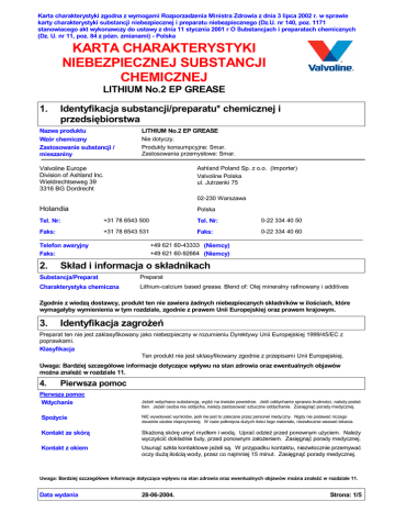 Karta charakterystyki zgodna z wymogami Rozporzadzenia Ministra Zdrowia z dnia 3 lipca 2002 r. w sprawie karty charakterystyki substancji niebezpiecznej i preparatu niebezpiecznego (Dz.U. nr 140, poz. 1171 stanowiacego akt wykonawczy do ustawy z dnia 11 stycznia 2001 r O Substancjach i preparatach chemicznych (Dz. U. nr 11, poz. 84 z pózn. zmianami) - Polska KARTA CHARAKTERYSTYKI NIEBEZPIECZNEJ SUBSTANCJI CHEMICZNEJ LITHIUM No.2 EP GREASE 1. Identyfikacja substancji/preparatu* chemicznej i przedsiębiorstwa Nazwa produktu Wzór chemiczny Zastosowanie substancji / mieszaniny LITHIUM No.2 EP GREASE Nie dotyczy. Produkty konsumpcyjne: Smar. Zastosowania przemysł owe: Smar. Ashland Poland Sp. z o.o. (Importer) Valvoline Polska ul. Jutrzenki 75 Valvoline Europe Division of Ashland Inc. Wieldrechtseweg 39 3316 BG Dordrecht 02-230 Warszawa Holandia Polska Tel. Nr: +31 78 6543 500 Tel. Nr: 0-22 334 40 50 Faks: +31 78 6543 531 Faks: 0-22 334 40 60 Telefon awaryjny Faks: 2. +49 621 60-43333 (Niemcy) +49 621 60-92664 (Niemcy) Skł ad i informacja o skł adnikach Substancja/Preparat Preparat Charakterystyka chemiczna Lithium-calcium based grease. Blend of: Olej mineralny rafinowany i additives Zgodnie z wiedządostawcy, produkt ten nie zawiera ż adnych niebezpiecznych skł adników w ilościach, które wymagał yby wymienienia w tym rozdziale, zgodnie z prawem Unii Europejskiej oraz prawem krajowym. 3. Identyfikacja zagroż eń Preparat ten nie jest zaklasyfikowany jako niebezpieczny w rozumieniu Dyrektywy Unii Europejskiej 1999/45/EC z poprawkami. Klasyfikacja Ten produkt nie jest sklasyfikowany zgodnie z przepisami Unii Europejskiej. Uwaga: Bardziej szczegół owe informacje dotyczące wpł ywu na stan zdrowia oraz ewentualnych objawów moż na znaleź ćw rozdziale 11. 4. Pierwsza pomoc Pierwsza pomoc Wdychanie Jeż eli wdychano substancję, wyjśćna śwież e powietrze. Jeśli oddychanie sprawia trudności, należ y podać tlen. Jeż eli osoba nie oddycha, należ y zastosowaćsztuczne oddychanie. Zasięgnąćporady medycznej. Spoż ycie NIE wywoł ywaćwymiotów, jeś li nie jest to zalecane przez personel medyczny. Nigdy nie podawaćniczego doustnie osobie nieprzytomnej. W razie poł knięcia duż ych iloś ci tego materiał u, niezwł ocznie wezwaćlekarza. Kontakt ze skórą Skaż onąskóręumyćmydł em i wodą. Upraćodzieżprzed ponownym uż yciem. Należ y wyczyś cićdokł adnie buty, przed ponownym zał oż eniem. Zasięgnąćporady medycznej. Kontakt z okiem Usunąćszkł a kontaktowe jeż eli są. W przypadku kontaktu, niezwł ocznie przemywać oczy duż ąiloś ciąwody, przez co najmniej 15 minut. Zasięgnąćporady medycznej. Uwaga: Bardziej szczegół owe informacje dotyczące wpł ywu na stan zdrowia oraz ewentualnych objawów moż na znaleź ćw rozdziale 11. Data wydania 28-06-2004. Strona: 1/5 LITHIUM No.2 EP GREASE 5. Postępowanie w przypadku poż aru Środki gaśnicze MAŁY POŻAR: Uż yćproszku gaś niczego lub CO2. DUŻY POŻAR: Uż ywaćzraszania wodą, mgł y lub piany. Nie uż ywaćstrumienia wody. Szczególne ryzyko naraż enia Bez szczególnego niebezpieczeństwa. Niebezpieczne produkty rozkł adu termicznego Ochrona straż aków Produkty te, to tlenki węgla (CO, CO2) i woda. Niektóre tlenki metali. Straż acy powinni nosićaparaty oddechowe izolacyjne (SCBA) i funkcjonalną odzież(peł nąodzieżochronną). Specjalne wyposaż enie ochronne Nie dotyczy. dla straż aków 6. Postępowanie w przypadku niezamierzonego uwolnienia do środowiska Osobiste środki ostroż ności Buty (wysokie). Rękawice. Zabezpieczenia środowiskowe Uż yćnarzędzia do zebrania materiał u w stanie stał ym lub zaabsorbowanego i umieś cićgo w odpowiednio oznaczonym pojemniku na odpadki. Jeż eli personel sł uż b ratowniczych jest niedostępny, należ y odessaćlub zebrać Metody usuwania rozlany materiał i umieś cićwe wł aś ciwym pojemniku przeznaczonym do usunięcia. Unikaćtworzenia warunków, w których następuje pylenie i zapobiegać roznoszeniu przez wiatr. Uwaga: Patrz Sekcja 8 - osobiste wyposaż enie ochronne, oraz Sekcja 13 - usuwanie odpadków. 7. Postępowanie z substancją/preparatem* i jej/jego* magazynowanie Posł ugiwanie się Przechowywanie Nie poddawaćpojemników dział aniu ciś nienia, nie ciąć , nie spawać , nie lutować , nie wiercić , nie szlifować , chronićprzed ciepł em oraz ź ródł ami zapł onu. Trzymać z dala od niekompatybilnych materiał ów, takich jak silnymi utleniaczami. Przechowywaćpojemnik szczelnie zamknięty. Pojemnik należ y przechowywaćw chł odnym, dobrze wietrzonym miejscu. Materiałopakowaniowy Zaleca się 8. Kontrola naraż enia i środki ochrony indywidualnej Wartości graniczne ekspozycji Kontrole ekspozycji Środki inż ynierskie Środki zachowania higieny Ochrona dróg oddechowych Ochrona rąk Ochrona oczu Ochrona skóry 9. Stosowaćoryginalny pojemnik. Niedostępne. Jeś li w wyniku czynnoś ci uż ytkownika powstaje pył , wyziewy lub mgł a, należ y uż yć wentylacji; w celu zachowania dawki substancji szkodliwej /(wych) w powietrzu poniż ej limitu. Po pracy ze związkami i przed jedzeniem, paleniem, korzystaniem z ustępu/toalety oraz przed pójś ciem spać , Należ y Myćręce. Nie dotyczy. Nie dotyczy. Nie dotyczy. Fartuch. Wł aściwości fizykochemiczne Stan fizyczny Kolor Zapach Temperatura wrzenia Temperatura topnienia Gęstośćwzględna Ciał o stał e. (Ciał o stał e w formie pasty.) Brązowy. (Jasno.) Łagodny. Data wydania 28-06-2004. 371°C (700°F) 190°C (374°F) 0.95 g/cm3 (15.6°C / 60.1°F) Strona: 2/5 LITHIUM No.2 EP GREASE pH Temperatura zapł onu Szybkośćparowania Limity eksplozji Pręznośćpary Rozpuszczalność Kwasowy. Tygiel zamknięty: >221°C (429.8°F). 0.01 w porównaniu z Octan butylu Niedostępne. <0.013 kPa (<0.1 mm Hg) (w 20°C) Nierozpuszczalny w zimnej wodzie. 10. Stabilnośći reaktywność Stabilność Warunki, których należ y unikać Produkt jest trwał y. Do 