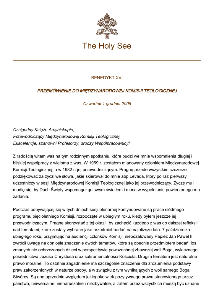 The Holy See BENEDYKT XVI PRZEMÓWIENIE DO MIĘDZYNARODOWEJ KOMISJI TEOLOGICZNEJ Czwartek 1 grudnia 2005 Czcigodny Księże Arcybiskupie, Przewodniczący Międzynarodowej Komisji Teologicznej, Ekscelencje, szanowni Profesorzy, drodzy Współpracownicy! Z radością witam was na tym rodzinnym spotkaniu, które budzi we mnie wspomnienia długiej i bliskiej współpracy z wieloma z was. W 1969 r. zostałem mianowany członkiem Międzynarodowej Komisji Teologicznej, a w 1982 r. jej przewodniczącym. Pragnę przede wszystkim szczerze podziękować za życzliwe słowa, jakie skierował do mnie abp Levada, który po raz pierwszy uczestniczy w sesji Międzynarodowej Komisji Teologicznej jako jej przewodniczący. Życzę mu i modlę się, by Duch Święty wspomagał go swym światłem i mocą w wypełnianiu powierzonego mu zadania. Podczas odbywającej się w tych dniach sesji plenarnej kontynuowane są prace siódmego programu pięcioletniego Komisji, rozpoczęte w ubiegłym roku, kiedy byłem jeszcze jej przewodniczącym. Pragnę skorzystać z tej okazji, by zachęcić każdego z was do dalszej refleksji nad tematami, które zostały wybrane jako przedmiot badań na najbliższe lata. 7 października ubiegłego roku, przyjmując na audiencji członków Komisji, nieodżałowany Papież Jan Paweł II zwrócił uwagę na doniosłe znaczenie dwóch tematów, które są obecnie przedmiotem badań: los zmarłych nie ochrzczonych dzieci w perspektywie powszechnej zbawczej woli Boga, wyłącznego pośrednictwa Jezusa Chrystusa oraz sakramentalności Kościoła. Drugim tematem jest naturalne prawo moralne. To ostatnie zagadnienie ma szczególne znaczenie dla zrozumienia podstawy praw zakorzenionych w naturze osoby, a w związku z tym wynikających z woli samego Boga Stwórcy. Są one uprzednie względem jakiegokolwiek pozytywnego prawa stanowionego przez państwa, uniwersalne, nienaruszalne i niezbywalne, a zatem przez wszystkich muszą być uznane 2 jako takie, zwłaszcza przez władze polityczne, których zadaniem jest ich szerzenie i zagwarantowanie ich przestrzegania. Choć wydaje się, że w dzisiejszej kulturze pojęcie «natury ludzkiej» zanikło, pozostaje faktem, że prawa człowieka są niezrozumiałe, jeśli się nie założy, że człowiek w samej swej istocie jest nośnikiem wartości i norm, które trzeba odkryć i potwierdzić, a nie wymyślać czy narzucać w sposób subiektywny i arbitralny. Bardzo ważny pod tym względem jest dialog z przedstawicielami świata laickiego. Musi stać się oczywiste, że negowanie ontologicznego fundamentu istotnych wartości życia ludzkiego prowadzi nieuchronnie do pozytywizmu i uzależnia prawa od prądów myślowych, dominujących w danym społeczeństwie; w ten sposób wypacza się prawo, czyniąc je narzędziem władzy, zamiast władzę podporządkować prawu. Nie mniejsze znaczenie ma trzeci temat, ustalony na ubiegłorocznej sesji plenarnej, mianowicie status i metodologia teologii katolickiej. Teologia nie może być uprawiana inaczej, jak tylko w posłuszeństwie natchnieniu prawdy i miłości, która pragnie coraz lepiej poznawać tego, kogo kocha, w tym wypadku samego Boga, którego dobroć uznaliśmy w akcie wiary (por. Donum veritatis, n. 7). Znamy Boga, ponieważ On w swej nieskończonej dobroci dał się nam poznać w stworzeniu, a przede wszystkim w swym Jednorodzonym Synu, który dla nas stał się człowiekiem, umarł i zmartwychwstał dla naszego zbawienia. Dlatego też objawienie Chrystusa jest podstawową zasadą normatywną teologii. Uprawia się ją zawsze w Kościele i dla Kościoła, Ciała Chrystusa, stanowiącego jedno z Chrystusem, a tym samym także w wierności Tradycji apostolskiej. Dlatego teolog musi prowadzić swe prace w jedności z żywym głosem Kościoła, czyli z żywym Magisterium Kościoła, uznając jego władzę. Traktowanie teologii jako prywatnej sprawy teologa oznacza niezrozumienie samej jej istoty. Jedynie wewnątrz wspólnoty kościelnej, w jedności z prawowitymi pasterzami Kościoła praca teologa ma sens. Wymaga ona oczywiście kompetencji naukowych, ale także, w nie mniejszym stopniu, ducha wiary i pokory właściwego temu, kto wie, że Bóg żywy i prawdziwy, będący przedmiotem jego refleksji, nieskończenie przekracza ludzkie możliwości percepcji. Jedynie przez modlitwę i kontemplację można wyrobić w sobie poczucie Boga i uległość wobec działania Ducha Świętego, dzięki czemu dociekania teologiczne zaowocują dobrem dla całego Kościoła i, powiedziałbym, również ludzkości. Ktoś mógłby wysunąć zastrzeżenie: ale czy tak zdefiniowana teologia jest jeszcze nauką, czy jest zgodna z naszym rozumem i z jego wolnością? Owszem — racjonalność, naukowość i myślenie w jedności z Kościołem nie tylko się nie wykluczają, ale są ze sobą zgodne. Duch Święty prowadzi Kościół do pełni prawdy (por. J 16, 13), Kościół służy prawdzie, a jego przewodnictwo jest wychowaniem do prawdy. Życzę wam, aby wasze dni, które poświęcacie badaniom, ożywiał duch braterskiej jedności w poszukiwaniu Prawdy, którą Kościół chce głosić wszystkim ludziom. Proszę Najświętszą Maryję Pannę, Stolicę Mądrości, aby kierowała waszymi krokami w radości i nadziei chrześcijańskiej. Jeszcze raz zapewniam was wszystkich o moim uznaniu i zaufaniu i w tym duchu udzielam wam z serca Apostolskiego Błogosławieństwa. 3 © Copyright 2005 - Libreria Editrice Vaticana © Copyright - Libreria Editrice Vaticana