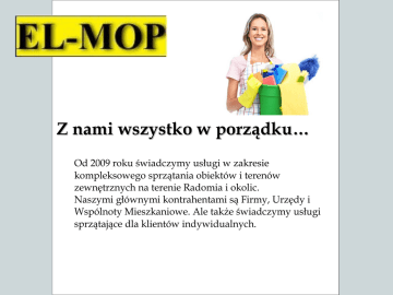 Z nami wszystko w porządku… Od 2009 roku świadczymy usługi w zakresie kompleksowego sprzątania obiektów i terenów zewnętrznych na terenie Radomia i okolic. Naszymi głównymi kontrahentami są Firmy, Urzędy i Wspólnoty Mieszkaniowe. Ale także świadczymy usługi sprzątające dla klientów indywidualnych. DEWIZA FIRMY to dbanie o czystość i porządek oraz ZOBOWIĄZANIE do wykonania pracy z należytą starannością i dokładnością. KORZYŚCI Najważniejsza korzyść współpracy z naszą firmą to gwarancja czystości i porządku. Nasza opieka nad obiektem to przede wszystkim: - nasi profesjonalni pracownicy - nasz sprzęt i środki czystości - nasze maszyny czyszczące OFERTA Świadczymy usługi w zakresie: -sprzątanie powierzchni biurowych -sprzątanie obiektów -sprzątanie poremontowe -mycie okien i witryn -mycie parowe i ciśnieniowe -czyszczenie, pranie dywanów wykładzin -pranie dywanów i tapicerek -sprzątanie terenów zewnętrznych -koszenie i pielęgnacja trawników -odśnieżanie -usługi konserwatorsko -naprawcze Nawet najlepszy pracownik nie zdziałałby wiele bez odpowiedniego zaplecza technicznego. Posiadamy oraz inwestujemy w najlepszy sprzęt renomowanych producentów, a przede wszystkim w sprzęt firmy KARCHER KONTAKT TEL 601340339 TEL.726340339 TEL.483608204 [email protected] www.elmopradom.xn.pl EL-MOP SERWIS SPRZĄTAJĄCY ELŻBIETA BUDZOWSKA Ul. Kielecka 105 lok. 1 26-600 Radom