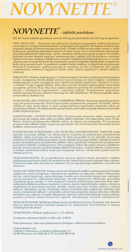 NO NOllY!VETTr -tabletki powlekane SKŁAD: Każda tabletka powlekana zawiera 0,02 mg etinylestradiolu oraz 0,15 mg dezogestrelu. OPIS DZIAŁANIA: Novynette jest złożonym doustnym preparatem antykoncepcyjnym zawierającym estrogen (etinyJoestradiol) i progestagen (dezogestrel). Mechanizm działania tego preparatu polega na hamowaniu jajeczkowania. Ponadto środek ten powoduje zmiany w śluzie szyjkowym, utrudniając plemnikom dotarcie do jamy macicy oraz w endometrium, znmiejszając prawdopodobiel1stwo implantacji. Oprócz działania antykoncepcyjnego preparat ovynette, podobnie jak inne doustne preparaty antykoncepcyjne, reguluje cykl miesiączkowy, zmniejsza obfitość krwawiell, zmniejsza dolegliwości związane z napięciem przedmiesiączkowym; w wyrliku zahamowania owulacji obserwuje się znmiejszenie ryzyka wystąpienia torbielijajnika, znuuejszenie liczby ciąż pozamacicznych. Na podstawie wyników badail wiadomo, że długotrwale przyjmowanie doustnych preparatów antykoncepcyjnych zmniejsza ryzyko wystąpienia raka jajnika i endometrium, niektórych łagodnych chorób sutka, stanów zapalnych w obrębie miedlucy mniejszej. WSKAZANIA:Doustna antykoncepcja. U kobiet stosujących doustną antykoncepcję hormonalną ryzyko wystąpienia chorób ukladu sercowo-naczyniowego jest nieco większe. Czynnikiem zwiększającym ryzyko wystąpienia tych chorób jest palenie papierosów. Ryzyko to wzrasta z wiekiem. Z tego względu kobiety, które chcą stosować doustną antykoncepcję hormonalną szczególnie powyżej 35-go roku życia i palące papierosy powinny być poinformowane przez lekarza o istniejących zagrożeniach i zaprzestać palenia. Przyjmowanie preparatów antykoncepcyjnych może znlieniać tolerancję na szkla kontaktowe. W takim przypadku zaleca się konsultację okulistyczną· STOSOWANIE LEKU PODCZAS CIĄŻYI KARMIENIAPIERSIĄ:Stosowmue preparatu podczas ciąży jest przeciwwskazane. Przed rozpoczęciem przyjmowania preparatu Novynette, należy wykluczyć ciążę. Jeżeli zajście w ciążę nastąpi podczas przyjmowania preparatu, należy go natychnliast odstawić. Nie należy karmić piersią dziecka, jeśli matka przyjmuje doustne hormonalne środki antykoncepcyjne. DAWKOWANIE I SPOSÓB PODAWANIA: Przyjmowanie preparatu należy rozpocząć od pierwszego lub piątego dnia cyklu, po jednej tabletce dziennie, o tej samej porze, przez 21 dni. Wybór terminu przyjmowania tabletek należy do lekarza prowadzącego. Po poronieniu przyjmowanie tabletek należy rozpocząć natychmiast. Nie ma konieczności stosowalua innych śrocłkówantykoncepcyjnych. POSTĘPOWANIE W PRZYPADKU, GDY PACJENTKAZAPOMNI PRZYJĄĆTABLETKĘ:Jeżeli zapomni się przyjąć tabletkę i nie minęło jeszcze 12 godzin od ustalonej pory przyjmowania tabletek, należy ją przyjąć jak najszybciej. W takim przypadku nie ma potrzeby stosowania dodatkowych metod antykoncepcyjnych. Jeżeli zaponmi się przyjąć tabletkę i upłynęło ponad 12 godzin od ustalonej pory przyjmowania tabłetek, należy ją pominąć i kontynuować przyjmowanie pozostałych tableteK o ustalonej porze. Przez następne siedem dni należy stosować dodatkowe metody antykoncepcyjne. Jeżeli ponlinięta tabletka była jedną z siednliu tabletek z opakowania, to kolejne opakowanie należy rozpocząć następnego dnia po zakollczeniu opakowania bez robienia przerwy. PRZEDAWKOWANIE: Po przypadkowym spożyciu dużych dawek doustnych środków antykoncepcyjnych przez dzieci nie zaobserwowano żadnych poważnych zaburzell stanu zdrowia. Przedawkowanie może powodować nudności. Nie ma specyficznego antidotum, a leczenie jest objawowe. DZIAŁANIANIEPOŻĄDANE: Podczas stosowalua doustnych środków antykoncepcyjnych istnieje zwiększone ryzyko wystąpienia: zakrzepowego zapalenia żył, zakrzepicy żylnej z zatorowością lub bez, zatoru tętniczego, zatoru płucnego, zawału serca, krwotoku mózgowego, zakrzepicy naczYll mózgowych, nadciśnienia tętniczego, choroby pęcherzyka żółciowego, gruczolaka i łagodnego guza wątroby. U osób stosujących doustną antykoncepcję opisywane były także: zaburzenia żolądkowo-jelitowe (nudności, wynlioty, skurcze nlięśni brzucha, wzdęcie), okresowa niepłodność po przerwaniu leczenia, obrzęki, ostuda (może być trwała), zmiany w sutkach (tkliwość, obrznuenie, wyciek z brodawki), znuana wydzielania śluzu szyjkowego, nadżerki szyjki macicy, znuuejszenie laktacji w przypadku zastosowania preparatu zaraz po porodzie, żółtaczka cholestatyczna, nligrena, wysypka (alergiczna), depresja, zaburzenia tolerancji węglowodanów, grzybica pochwy, zmiana krzywizny rogówki, nietolerancja soczewek kontaktowych. PRZECHOWYWANIE:Tabletki powlekane można przechowywać przez 36 nliesięcy. Nie stosować leku po upływie terminu ważności podanym na opakowaniu. Przechowywać w miejscu luedostępnym dla dzieci! OPAKOWANIA: Wielkość opakowalua: 1 x 21 tabletek. Świadectwo rejestracji MziOS nr 4344 z dn. 13.08.99. Pełna informacja o leku oraz piśnuen.nictwo dostępne w Biurze Przedstawicielstwa: Gedeon Richter Ltd. Oddział w Warszawie, ul. Królowej Marysieilki 11/5 02-954 Warszawa, tel. (022) 6426739, fax (022)8589340