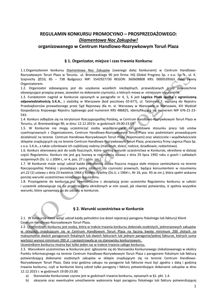 REGULAMIN KONKURSU PROMOCYJNO – PROSPRZEDAŻOWEGO: Diamentowa Noc Zakupów! organizowanego w Centrum Handlowo-Rozrywkowym Toruń Plaza § 1. Organizator, miejsce i czas trwania Konkursu 1.1.Organizatorem konkursu Diamentowa Noc Zakupów (zwanego dalej Konkursem) w Centrum HandlowoRozrywkowym Toruń Plaza w Toruniu ul. Broniewskiego 90 jest firma: HQ Global Progress Sp. z o.o. Sp. k., ul. K. Szajnochy 2/210, 85 – 738 Bydgoszcz NIP: 5542927730 REGON: 360608808 KRS: 0000539563 dalej zwany Organizatorem. 1.2. Organizator zobowiązany jest do uzyskania wszelkich niezbędnych, przewidzianych przez powszechnie obowiązujące przepisy prawa, zezwoleń na dokonanie czynności, o których mowa w niniejszym regulaminie. 1.3. Fundatorem nagród w Konkursie opisanych w paragrafie nr 4, 5, 6 jest Legnica Plaza spółka z ograniczoną odpowiedzialnością S.K.A., z siedzibą w Warszawie (kod pocztowy 02-677), ul. Taśmowa 7, wpisaną do Rejestru Przedsiębiorców prowadzonego przez Sąd Rejonowy dla m. st. Warszawy w Warszawie w Warszawie, XIII Wydział Gospodarczy Krajowego Rejestru Sądowego pod numerem KRS 486825, identyfikującą się numerem NIP 676-21-23543. 1.4. Konkurs odbędzie się na terytorium Rzeczypospolitej Polskiej, w Centrum Handlowo-Rozrywkowym Toruń Plaza w Toruniu, ul. Broniewskiego 90, w dniu: 12.12.2015r. w godzinach 19.00-23.00. 1.5. W Konkursie nie mogą uczestniczyć osoby współpracujące na podstawie stosunku pracy lub umów cywilnoprawnych z Organizatorem, Centrum Handlowo-Rozrywkowym Toruń Plaza oraz podmiotami prowadzącymi działalność na terenie Centrum Handlowo-Rozrywkowym Toruń Plaza (Najemcami) oraz właściciele i współwłaściciele sklepów znajdujących się na terenie Centrum Handlowo-Rozrywkowym Toruń Plaza, pracownicy firmy Legnica Plaza Sp. z o.o. S.K.A., a także członkowie ich najbliższej rodziny (małżonek, dzieci, rodzice, dziadkowie, rodzeństwo). 1.6. Konkurs skierowany jest do osób fizycznych, które spełnią warunki uczestnictwa w Konkursie, określone w dalszej części Regulaminu. Konkurs nie jest grą losową w rozumieniu ustawy z dnia 29 lipca 1992 roku o grach i zakładach wzajemnych (Dz. U. z 2004 r., nr 4, poz. 27 z późn. zm.). 1.7. W Konkursie może wziąć udział każda pełnoletnia osoba fizyczna mająca stałe miejsce zamieszkania na terenie Rzeczpospolitej Polskiej i posiadająca pełną zdolność do czynności prawnych, będąca konsumentem w rozumieniu art.22 (1) ustawy z dnia 23 kwietnia 1964 r. Kodeks cywilny (Dz.U. z 1964 r., Nr 16, poz. 93 ze zm.), która spełni wskazne poniżej warunki uczestnictwa niniejszego regulaminu. 1.8. Przystąpienie do konkursu jest równoznaczne z akceptacją przez uczestnika Regulaminu konkursu w całości i uczestnik zobowiązuje się do przestrzegania określonych w nim zasad, jak również potwierdza, iż spełnia wszystkie warunki, które uprawniają go do udziału w konkursie. § 2. Warunki uczestnictwa w Konkursie 2.1. W Konkursie może wziąć udział każdy pełnoletni (na dzień rejestracji paragonu fiskalnego lub faktury) Klient Centrum Handlowo-Rozrywkowym Toruń Plaza. 2.2. Uczestnikiem Konkursu jest osoba, która w trakcie trwania konkursu dokonała osobistych, jednorazowych zakupów w sklepach znajdującym się w Centrum Handlowym Toruń Plaza na łączną kwotę minimum 200 złotych na maksymalnie dwóch paragonach fiskalnych lub dwóch fakturach lub jednym paragonie/jednej fakturze, których suma wartości wynosi minimum 200 zł i zarejestrowała je na stanowisku konkursowym. Uczestnikiem konkursu można być tylko jeden raz w trakcie trwania całego konkursu. 2.3. Warunkiem uczestnictwa w Konkursie jest: zgłoszenie się do Stanowiska Konkursowego zlokalizowanego w okolicy Punktu Informacyjnego na terenie Centrum Handlowo-Rozrywkowym Toruń Plaza z paragonem fiskalnym lub fakturą potwierdzającą dokonanie osobistych zakupów w sklepie znajdującym się na terenie Centrum HandlowoRozrywkowym Toruń Plaza. Data oraz godzina zakupu na paragonie lub fakturze musi być zgodna z datą i godziną trwania konkursu, czyli w konkursie biorą udział tylko paragony i faktury potwierdzające dokonanie zakupów w dniu 12.12.2015 r. w godzinach 19.00-23.00. a) Stanowisko Konkursowe czynne jest w godzinach trwania konkursu, opisanych w §1. pkt. 1.4. b) okazanie oraz ewentualne umożliwienie wykonania kopii paragonu fiskalnego lub faktury potwierdzającej 1 dokonanie zakupów na terenie Centrum Handlowo-Rozrywkowym Toruń Plaza na kwotę min. 200 zł na maksymalnie 2 paragonach fiskalnych lub fakturach (w konkursie biorą udział wszystkie sklepy znajdujące się w CHR Toruń Plaza z wyłączeniem kantoru). Rejestracji nie podlegają rachunki, noty obciążeniowe, etc. a także paragony fiskalne i faktury potwierdzające zakup napojów alkoholowych, wyrobów tytoniowych, produktów leczniczych, materiałów medycznych, zakładów bukmacherskich, gier losowych oraz doładowań telefonów komórkowych. c) podpisanie Karty Zgłoszeniowej - co jest równoznaczne z podaniem niezbędnych danych, m.in.: imię, nazwisko, kod pocztowy, nr telefonu, adres email, numer i wartość zgłoszonego paragonu lub faktury oraz sklep z którego pochodzi zgłoszony paragon lub faktura oraz złożenie własnoręcznego podpisu. Tylko tak wypełnione i podpisane przez Uczestnika zgłoszenie uważa się za prawidłowe, ważne i uprawniające do wzięcia udziału w Konkursie. 2.3.1. Po rejestracji paragonu fiskalnego lub faktury, uczestnik Konkursu uprawniony jest do odbioru 1 sztuki nagrody promocyjnej, z zastrzeżeniem pkt. 2.4 poniżej. Co oznacza, że 1 uczestnik uprawniony jest do udziału w konkursie tylko 1 raz w trakcie trwania całego konkursu – zgodnie z pkt. 2.2. 2.4. Wydawanie nagród promocyjnych odbywa się do wyczerpania zapasów – 100 sztuk. Nagrody promocyjne nie wydane w trakcie trwania konkursu pozostają własnością Fundatora. 2.5. Uczestnicy konkursu wyrażają zgodę na wykorzys