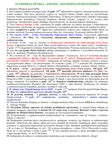 IX NIEDZIELA ZWYKŁA – 29.05.2016. - OGŁOSZENIA DUSZPASTERSKIE 1. Manifest Młodych przed ŚDM. 2. Dziś ostatnia niedziela miesiąca maja. O godz. 1730 nabożeństwo majowe i procesja eucharystyczna wokół świątyni. Dziś przy głównym wyjściu ze świątyni można zakupić płytę ze styczniowego koncertu Andrzeja Koryckiego i Dominiki Żukowskiej. Ta płyta jest jednocześnie cegiełką wspierającą funkcjonowanie Katolickiej Telewizji Serbinów. Można również wesprzeć to ze wszech miar pożyteczne tarnobrzeskie dzieło składając ofiarę do puszki. Za okazaną hojność dziękujemy. 3. Trwa Oktawa Bożego Ciała, codziennie do piątku odbywać się będzie procesja z Najświętszym Sakramentem. Zachęcamy do licznego uczestnictwa, szczególnie prosimy dzieci do sypania kwiatów. 4. Jutro wyjątkowo o godz. 1730 odprawimy nabożeństwo majowe przy kapliczce Matki Bożej na zewnątrz kościoła. Procesja eucharystyczna po Mszy św. wieczornej. Po procesji zbiórka dla LSO. 5. We wtorek 31.05. – święto Nawiedzenia Najświętszej Maryi Panny. Uroczystość odpustowa w Zakrzowie. Po Mszy św. wieczornej zakończenie nabożeństw majowych i procesja eucharystyczna. 6. W środę - 01.06. – wsp. św. Justyna, m. Rozpoczęcie nabożeństw do Najświętszego Serca Pana Jezusa. Codziennie litanią do Serca Pana Jezusa będziemy wyrażać Mu naszą cześć i uwielbienie. O godz. 1700 cotygodniowa adoracja Najświętszego Sakramentu. Procesja eucharystyczna po Mszy św. W tym dniu przypada Dzień Dziecka, dlatego pamiętajmy w modlitwie o wszystkich dzieciach. Po Mszy św. spotkanie Wspólnoty dla Intronizacji. 7. We czwartek 02. 06. – wsp. bł. Męczenników Sadoka i Towarzyszy. Jest to I czwartek miesiąca i zakończenie Oktawy Bożego Ciała. Po procesji do IV ołtarzy błogosławieństwo dzieci oraz poświęcenie wianków, ziół i kwiatów. Zachęcamy do licznego udziału. Prosimy również o pomoc w przygotowaniu ołtarzy i ich przystrojeniu. W czwartek o godz. 1100 w kościele OO. Dominikanów odprawiona zostanie Msza św. w intencji Miasta i Mieszkańców w kolejną rocznicę lokacji miasta. 8. W piątek – 03.06. – przypada uroczystość Najświętszego Serca Pana Jezusa. Od godz. 1400 odwiedziny chorych w mieszkaniach. Od godz. 1700 spowiedź pierwszo piątkowa. Po Mszy św. o godz. 1800 odbędzie się procesja z Najświętszym Sakramentem. W tym dniu przypada Dzień Modlitw o Uświęcenie Kapłanów. Zapraszamy wszystkich do wspólnej modlitwy, szczególnie Straż Honorową NSPJ z racji ich patronalnego święta. W piątek z racji uroczystości nie obowiązuje post od potraw mięsnych. Po południu o godz. 1630 w Katedrze Sandomierskiej odbędzie się spotkanie modlitewno-formacyjne Wspólnot dla Intronizacji NSPJ z całej diecezji. Zachęcamy do udziału, a zainteresowanych wyjazdem, prosimy o kontakt w zakrystii. 9. W sobotę wsp. Niepokalanego Serca NMP. O godz. 1730 spotkanie Koła Przyjaciół Radia Maryja. Po Mszy św. nabożeństwo pierwszo sobotnie do godz. 2000. 10. W przyszłą niedzielę – I miesiąca czerwca, w całej Polsce przeżywać będziemy IX Święto Dziękczynienia. O godz. 1655 comiesięczna prelekcja, nabożeństwo i zmiana tajemnic różańcowych. 11. Rycerze Kolumba dziękują za złożone w ubiegłą niedzielę ofiary w kwocie 1464 zł na rehabilitację 6 – letniego Wojtka. 12. Prezydent Miasta zaprasza na tydzień profilaktyki zdrowotnej, w ramach której odbędą się bezpłatne kampanie zdrowotne w dniach 30 i 31 maja oraz 3 czerwca. Również w dniu 1 czerwca odbędzie się Miejski Dzień Dziecka. Szczegóły na wywieszonych plakatach. 13. Przypominamy o organizowanych pielgrzymkach do Częstochowy oraz do Kalisza i Lichenia. Zapisy w zakrystii. 14. Dziękujemy rodzicom dzieci rocznicowych za sprzątanie świątyni i jej obejścia, za udekorowanie kościoła i ofiarowany dar ołtarza, jakim jest nowy chodnik do kościoła. Dziękujemy także wszystkim za pomoc w organizacji tegorocznej uroczystości Bożego Ciała. Składamy podziękowanie parafianom z bl. nr 4 przy ul. Waryńskiego, m. od 1 -20 za dyżur porządkowy i ofiarę 150 zł. Pracowało 4 osoby. Msza św. w ich intencji w środę o godz. 700. W tym tygodniu prosimy o dyżur porządkowy parafian z tego samego bloku, m. od 21 do końca. 15. Zachęcamy do nabycia i czytania prasy katolickiej, jest czasopismo dla młodych „Droga”.