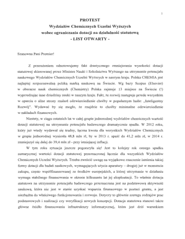 PROTEST Wydziałów Wyższych Chemicznych Uczelni wobec ograniczania dotacji na działalność statutową - LIST OTWARTY - Szanowna Pani Premier! przerażeniem Z Wyższego statutowej skierowanej przez Ministra Nauki i Szkolnictwa naukowego Wydziałów wysokości odnotowujemy fakt drastycznego zmmeJszama Chemicznych Uczelni Wyższych na utrzymanie dotacji potencjału w naszym kraju. Polska CHEMIA jest najlepiej rozpoznawalną polską marką naukową na Świecie. Wg bazy Scopus (Elsevier) w obszarze nauk chemicznych (Chemistry) Polska zajmuje 13 miejsce na Świecie (!) wyprzedzając inne dziedziny nauki w naszym kraju. Fakt, że rozwój w oparciu o silne strony Wydawać Rozwój". by znalazł się odzwierciedlenie mogło , że choćby w popularnym choćby znajdzie to następuje przede wszystkim haśle: „Inteligentny minimalne odzwierciedlenie w nakładach finansowych. Niestety, w ciągu ostatnich lat w dotacji statutowej na utrzymanie który już wtedy wydawał si ę w grupie jednorodnej zmniejszyć się dalej do 39,4 mln wartości łączna 48,8 mln zł zł , wydziałów badawczego dramatycznie kwota dla wszystkich by w 2013 r. spaść chemicznych spadła. wartość W 2012 roku, Wydziałów do 41 ,2 mln Chemicznych zł , w 2014 r. - przy istniejącej inflacji. W tym roku sytuacja jeszcze sumarycznej grupie jednorodnej potencjału trudny, wyniosła całej pogorszyła się! Jest to kolejny rok ostrego spadku dotacji statutowej przeznaczonej łącznie dla wszystkich Wydziałów Chemicznych Uczelni Wyższych. Trzeba zwrócić uwagę na wyjątkowe znaczenie istnienia takiej formy dotacji dla zakupu, badań naukowych, wymagających często współfinansowanej ze środków użycia aparatury - drogiej już europejskich, a której utrzymanie w wymaga stabilnego finansowania w okresie kilkunastu lat jej eksploatacji. To statutowa na utrzymanie potencjału naukową, która nie jest w stanie niezbędna do właściwego badawczego przeznaczana jest na uzyskać w momencie działaniu właśnie dotacja podstawową aktywność wsparcia finansowego w postaci grantu, a jest funkcjonowania i rozwoju. Dotyczy to głównie szeregu rodzajów prac podstawowych i realizacji czy weryfikacji nowych koncepcji. Dotacja statutowa stanowi główne źródło finansowania infrastruktury informatycznej , która jest dziś także warunkiem 2 koniecznym prowadzenia jakiejkolwiek sfinansować przypomnieć, CHEMII istnieje pojęta rzecz dla nas współczesne informatyka, także , przemysł rolnictwo, przemysł farmaceutyków, lekami przeciw chorobom, które medycynie Są skuteczną broń. opierającą się Trudno rozwoju, fundamentem cywilizacji. To przemysł odzieżowy, przemysł obronny i maszynowy, warunkujący uporały chemia jest jednym się przemysł materiałów nasze istnienie, ciągle goniący od podstawowych środków na UTRZYMANIE (o rozwoju nie przemawiają badawczego. Nie środków do agencji do nas argumenty finansujących naukę ściśle określone jednostki naukowej. projekty, nie Jeśli można z nich finansować są to utrzymania środki powstające, piękne przedsi ębiorczości , pochłonęła olbrzymie Wyższe badań światowym nowoczesną nauką. poziomie w sposób Nie będzie umożliwiający po prostu nowych nie poprzez oczywiście przeznaczone potencjału centra technologiczne, transferu technologii, inkubatory puste. Uczelnie nas wspominając) potencjału w trybie konkursowym. Jest to sytuacja nie ulegnie zmianie, licznie środki pozostaną odcinająca zwiększania konkurencyjności niezmiernie istotny filar finansowania nauki w Polsce. Jednak z dający na CHEMII. jest dla nas decyzja Ministerstwa tak radykalnie na za nowymi codziennego, czy techniki nie niepojęta przesuwanie budowlanych z lekami dotychczas stosowanymi, dziś wskazać dziedzinę życia dzięki tworzyw sztucznych, Tym bardziej na można to cele, których nie oczywistą, że współcześnie wymagającym ciągłego z najistotniejszych a a naukowej. z dotacji dydaktycznej ani z grantów badawczych czy rozwojowych. Chcemy szeroko działalności badawczego i nowoczesne których budowa będą mogły prowadzić naszym studentom kontakt pomysłów by powstało coś nowego i przełomowego. Szanowna Pani Premier - w naszym przekonaniu, sytuacja jest na tyle dramatyczna, że rozważamy, zwanego w naszej desperacji, 'Czarną procesją ' zasadność przyłączenia się do protestu przedstawicieli nauki i dlatego apelujemy o pomoc, aby nie dopuścić do zniweczenia najlepszej polskiej marki naukowej, jaką jest CHEMIA. w imieniu sygnatariuszy wymienionych poniżej 2 lipca 2015 r. prof. dr h b. Henryk Koroniak, Dziekan Wydziału Chemii, Uniw rsytetu im. Adama Mickiewicza w Poznaniu