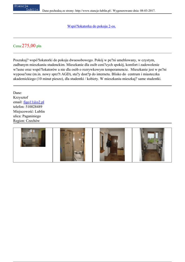 Dane pochodzą ze strony: http://www.stancje-lublin.pl/. Wygenerowano dnia: 08-03-2017. Wspó?lokatorka do pokoju 2-os. Cena:275,00 pln Poszukuj? wspó?lokatorki do pokoju dwuosobowego. Pokój w pe?ni umeblowany, w czystym, zadbanym mieszkaniu studenckim. Mieszkanie dla osób ceni?cych spokój, komfort i zadowolenie w?asne oraz wspó?lokatorów a nie dla osób o rozrywkowym temperamencie. Mieszkanie jest w pe?ni wyposa?one (m.in. nowy sprz?t AGD), sta?y dost?p do internetu. Blisko do centrum i miasteczka akademickiego (10 minut pieszo), dla studentki / kobiety. W mieszkaniu mieszkaj? same studentki. Dane: Krzysztof email: [email protected] telefon: 510028489 Miejscowość: Lublin ulica: Paganiniego Region: Czechów