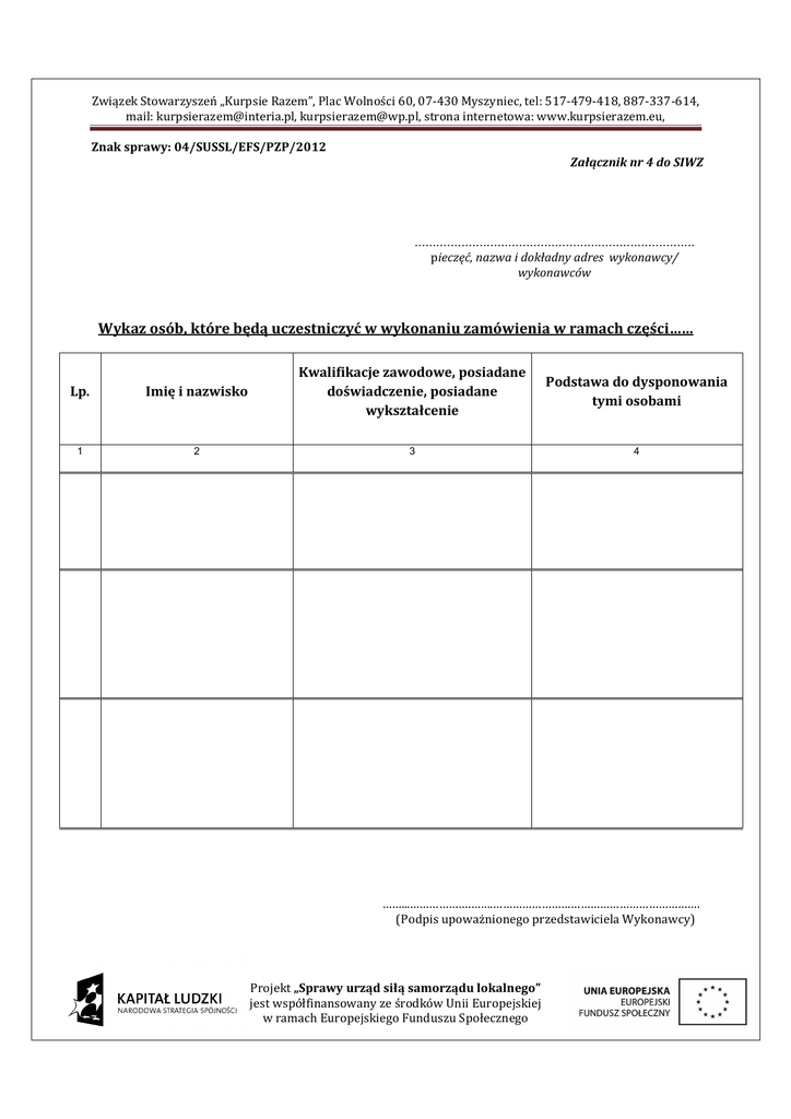 Związek Stowarzyszeń „Kurpsie Razem”, Plac Wolności 60, 07-430 Myszyniec, tel: 517-479-418, 887-337-614, mail: [email protected], [email protected], strona internetowa: www.kurpsierazem.eu, Znak sprawy: 04/SUSSL/EFS/PZP/2012 Załącznik nr 4 do SIWZ .............................................................................. pieczęć, nazwa i dokładny adres wykonawcy/ wykonawców Wykaz osób, które będą uczestniczyć w wykonaniu zamówienia w ramach części…… Lp. Imię i nazwisko Kwalifikacje zawodowe, posiadane doświadczenie, posiadane wykształcenie 1 2 3 Podstawa do dysponowania tymi osobami 4 ……...……………….…….………………………………………………………. (Podpis upoważnionego przedstawiciela Wykonawcy) Projekt „Sprawy urząd siłą samorządu lokalnego” jest współfinansowany ze środków Unii Europejskiej w ramach Europejskiego Funduszu Społecznego