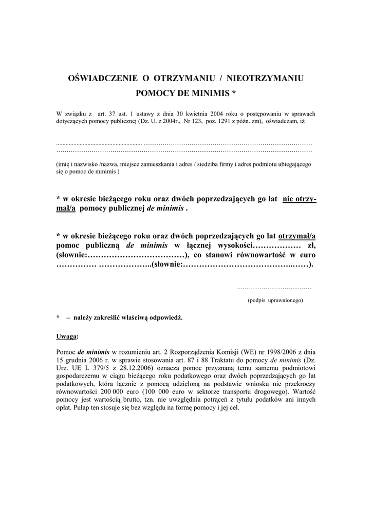 oświadczenie o otrzymaniu / nieotrzymaniu pomocy de minimis