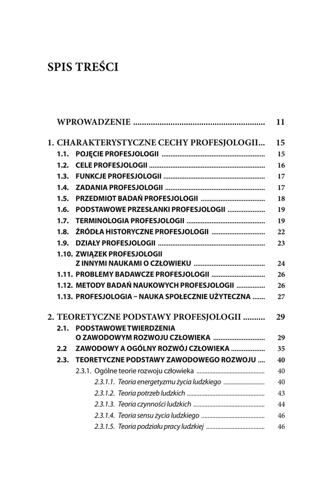 SPIS TREŚCI WPROWADZENIE ............................................................ 11 1. CHARAKTERYSTYCZNE CECHY PROFESJOLOGII... 15 1.1. 1.2. 1.3. 1.4. 1.5. 1.6. 1.7. 1.8. 1.9. 1.10. POJĘCIE PROFESJOLOGII .......................................................... CELE PROFESJOLOGII ................................................................. FUNKCJE PROFESJOLOGII ......................................................... ZADANIA PROFESJOLOGII ........................................................ PRZEDMIOT BADAŃ PROFESJOLOGII .................................... PODSTAWOWE PRZESŁANKI PROFESJOLOGII ..................... TERMINOLOGIA PROFESJOLOGII ............................................ ŹRÓDŁA HISTORYCZNE PROFESJOLOGII .............................. DZIAŁY PROFESJOLOGII ............................................................ ZWIĄZEK PROFESJOLOGII Z INNYMI NAUKAMI O CZŁOWIEKU ........................................ 1.11. PROBLEMY BADAWCZE PROFESJOLOGII .............................. 1.12. METODY BADAŃ NAUKOWYCH PROFESJOLOGII ................ 1.13. PROFESJOLOGIA – NAUKA SPOŁECZNIE UŻYTECZNA ....... 15 16 17 17 18 19 19 22 23 2. TEORETYCZNE PODSTAWY PROFESJOLOGII .......... 29 2.1. PODSTAWOWE TWIERDZENIA O ZAWODOWYM ROZWOJU CZŁOWIEKA ............................. 2.2 ZAWODOWY A OGÓLNY ROZWÓJ CZŁOWIEKA ................... 2.3. TEORETYCZNE PODSTAWY ZAWODOWEGO ROZWOJU .... 2.3.1. Ogólne teorie rozwoju człowieka ........................................... 2.3.1.1. Teoria energetyzmu życia ludzkiego .......................... 2.3.1.2. Teoria potrzeb ludzkich ................................................. 2.3.1.3. Teoria czynności ludzkich ............................................. 2.3.1.4. Teoria sensu życia ludzkiego ........................................ 2.3.1.5. Teoria podziału pracy ludzkiej ..................................... 29 35 40 40 40 43 44 46 46 24 26 26 27 6 Profesjologia 2.3.2. Szczegółowe teorie zawodowego rozwoju ......................... 2.3.2.1. Teorie wyboru zawodu .................................................. 2.3.2.2. Teorie uczenia się zawodu ............................................ 2.3.2.3. Teorie pracy zawodowej ............................................... 2.3.3. Dynamiczne teorie zawodowego rozwoju .......................... 2.3.3.1. Teoria ciągłości rozwojowej ......................................... 2.3.3.2. Teoria miejsca i przestrzeni społeczno-zawodowej człowieka w podziale zawodów i pracy ludzkiej ...... 48 48 52 58 61 61 3. WARUNKI ZAWODOWEGO ROZWOJU ...................... 71 3.1. WPROWADZENIE ......................................................................... 3.2. PODMIOTOWE UWARUNKOWANIA ROZWOJU .................... 3.2.1. Biologiczne uwarunkowania rozwoju ................................... 3.2.2. Fizyczne uwarunkowania rozwoju ......................................... 3.2.3. Psychiczne uwarunkowania rozwoju ..................................... 3.3. PRZEDMIOTOWE UWARUNKOWANIA ROZWOJU ............... 3.3.1. Historyczne uwarunkowania rozwoju ................................... 3.3.2. Ekonomiczne uwarunkowania rozwoju ................................ 3.3.3. Techniczne uwarunkowania rozwoju .................................... 3.3.4. Kulturowe uwarunkowania rozwoju ...................................... 3.3.5. Społeczne uwarunkowania rozwoju ...................................... 3.3.6. Pedagogiczne uwarunkowania rozwoju .............................. 3.3.7. Integracyjny wpływ warunków na zawodowy rozwój człowieka .............................................. 71 73 73 80 81 83 84 85 87 89 91 95 4. PROCES ZAWODOWEGO ROZWOJU .......................... 99 4.1. PERIODYZACJA ROZWOJU CZŁOWIEKA ................................ 4.1.1. Okresy, stadia i fazy rozwoju ogólnego ................................. 4.1.2. Narodziny stadialności zawodowego rozwoju .................... 4.1.2.1. Okresy rozwojowe wyboru zawodu ........................... 4.1.2.2. Okresy przebiegu pracy zawodowej ........................... 4.1.2.3. Stadia biegu życia zawodowego ................................ 99 99 102 102 103 103 63 96 SPIS TREŚCI 4.2. OKRESY ZAWODOWEGO ROZWOJU I ICH CHARAKTERYSTYKA ........................................................ 4.2.1. Charakterystyka okresu preorientacji zawodowej dzieci .... 4.2.1.1. Ustalenia terminologiczne ........................................... 4.2.1.2. Charakterystyka okresu ................................................ 4.2.1.3. Właściwości prozawodowego rozwoju dzieci .......... 4.2.2. Charakterystyka okresu zawodowej orientacji młodzieży 4.2.2.1. Ustalenia terminologiczne ........................................... 4.2.2.2. Charakterystyka okresu ................................................ 4.2.2.3. Właściwości zawodowego rozwoju młodzieży ........ 4.2.3. Charakterystyka szkolnego okresu uczenia się zawodu ... 4.2.3.1. Ustalenia terminologiczne ........................................... 4.2.3.2. Charakterystyka okresu ................................................ 4.2.3.3. Właściwości zawodowego rozwoju uczniów szkół zawodowych ......................................................... 4.2.4. Charakterystyka okresu zawodowej pracy dorosłych ....... 4.2.4.1. Ustalenia terminologiczne ........................................... 4.2.4.2. Charakterystyka okresu ................................................ 4.2.4.3. Właściwości zawodowego rozwoju pracujących .... 4.2.5. Charakterystyka okresu reminiscencji i refleksji społeczno-zawodowej emerytów .............................................................. 4.2.5.1. Ustalenia terminologiczne ........................................... 4.2.5.2. Charakterystyka okresu ................................................ 4.2.5.3. Właściwości życia pozawodowego emerytów ......... 7 104 106 106 107 108 118 118 120 121 122 122 123 124 141 141 142 143 157 157 158 158 5. WYNIKI 