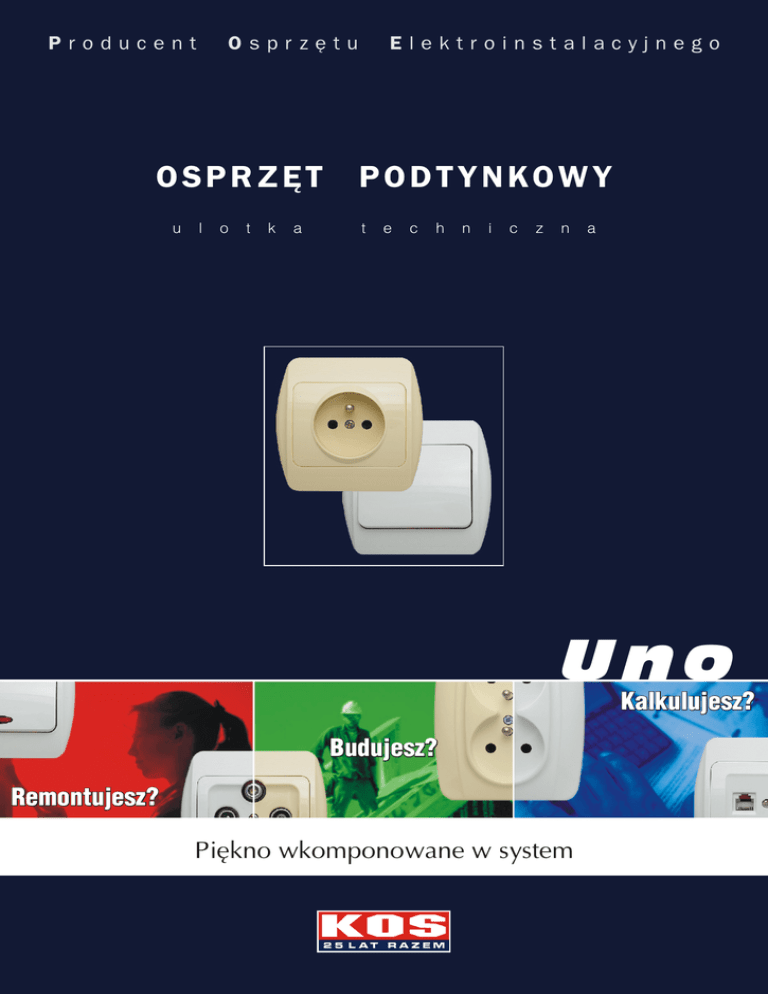 Producent Osprzętu OSPRZĘT u l o t k a Elektroinstalacyjnego PODTYNKOWY t e c h n i c z n a Uno Kalkulujesz? Budujesz? Remontujesz? Piękno wkomponowane w system Uno - system Uno podtynkowy Łączniki, przyciski, ściemniacze Tabela pomaga w precyzjnym przygotowaniu zapotrzebowania oraz określeniu dokładnych kosztów nr katalogowy cena* nr katalogowy cena* Nazwa i dane znamionowe wyrobu ilość sztuk 2104 01 4,00 zł 2105 01 4,50 zł Łącznik pojedynczy, 10AX, 250V~ x szt. = 2304 01 5,50 zł 2305 01 6,00 zł Łącznik pojedynczy, 10AX, 250V~ - PODŚWIETLANY x szt. = 2104 05 4,50 zł 2105 05 5,00 zł Łącznik podwójny (świecznikowy), 10AX, 250V~ x szt. = 2304 05 6,00 zł 2305 05 6,50 zł Łącznik podwójny (świecznikowy), 10AX, 250V~ - PODŚWIETLANY x szt. = 2304 03 5,50 zł 2305 03 6,00 zł Przycisk „światło”, x szt. = 2304 04 5,50 zł 2305 04 6,00 zł Przycisk „dzwonek”, x szt. = 2104 06 4,50 zł 2105 06 5,00 zł Łącznik schodowy, 10AX, 250V~ x szt. = 2304 06 6,00 zł 2305 06 6,50 zł Łącznik schodowy, 10AX, 250V~ - PODŚWIETLANY x szt. = 2104 07 5,50 zł 2105 07 6,00 zł Łącznik krzyżowy, x szt. = 2104 51 25,00 zł 2105 51 25,00 zł Ściemniacz - sterownik oświetlenia, sterowany ręcznie, x szt. = 10AX, 250V~ - PODŚWIETLANY 10AX, 250V~ - PODŚWIETLANY 10AX, 250V~ 400W, 250V~ Suma Gniazda tradycyjne i specjalistyczne nr katalogowy cena* nr katalogowy cena* 2104 31 3,35 zł 2105 31 3,85 zł Gniazdo pojedyncze 2P, 2104 32 3,65 zł 2105 32 4,15 zł Gniazdo pojedyncze 2P+Z, 2104 41 3,65 zł 2105 41 4,15 zł Gniazdo pojedyncze 2P+Z typu Schuko, 2104 35 4,65 zł 2105 35 5,15 zł Gniazdo podwójne 2 x 2P, 2104 36 4,85 zł 2105 36 5,35 zł Gniazdo podwójne 2 x 2P + Z, 2104 73 18,00 zł 2105 73 18,50 zł Gniazdo antenowe RTv końcowe, 2104 74 19,00 zł 2105 74 19,50 zł Gniazdo antenowe RTv przelotowe, 2104 75 19,00 zł 2105 75 19,50 zł Gniazdo antenowe RTv przelotowe, 2104 76 24,00 zł 2105 76 24,50 zł Gniazdo antenowe RTv Sat końcowe, 2104 63 8,00 zł 2105 63 8,50 zł 2104 64 9,00 zł 2105 64 9,50 zł 2104 65 14,00 zł 2105 65 14,50 zł Gniazda komputerowe pojedyncze, RJ 45, kat. 5 E 2114 39 5,50 zł 2105 39 6,00 zł Wyroby w kolorze białym Wyroby w kolorze beżowym projekt: Marek Holewiński 2105 01 - Łącznik pojedynczy 10 AX, 250V~ Nazwa i dane znamionowe wyrobu ilość sztuk 16A, 250V~, x szt. = x szt. = x szt. = x szt. = x szt. = x szt. = Tv: 8 dB, R: 8 dB x szt. = Tv: 13 dB, R: 13 dB x szt. = x szt. = Gniazdo telefoniczne RJ11 pojedyncze x szt. = Gniazdo telefoniczne RJ11 podwójne x szt. = x szt. = x szt. = 16A, 250V~ 16A, 250V~ 16A, 250V~ 16A, 250V~ Tv: 0,3 dB, R: 0,6 dB Tv: 0,5 dB, R: 0,5 dB, F: 1,5 dB Gniazdo pojedyncze 2P+Z, bryzgoszczelne, IP44, klapka w kolorze wyrobu, 16A, 250V~ 2104 51 - Ściemniacz sterownik oświetlenia, sterowany ręcznie, 250V~ KOS Elektro System Sp. z o.o. Razem 2105 32 - Gniazdo pojedyncze 2P+Z, 16A, 250V~ Oferta i ceny zawarte w katalogu stanowią zaproszenie do rokowań w rozumieniu art. 71 KC, natomiast nie stanowią oferty w rozumieniu art. 66 KC. * - sugerowana cena hurtowa netto, należy doliczyć 22% podatku VAT Autoryzowany dystrybutor: 62-300 Września, ul. Wrocławska 43 tel. (061) 438 65 29, fax (061) 438 63 60 Sekretariat: [email protected] Dział handlowy: (061) 640 36 71-72, [email protected] Suma 2104 36 - Gniazdo podwójne 2 x 2P + Z, 16A, 250V~ www.kos.pl