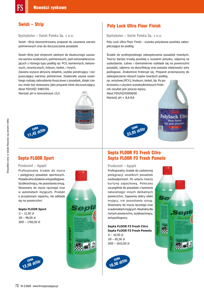 Wszystkie ceny w dziale Nowości są cenami netto Nowości rynkowe Swish – Strip Poly Lock Ultra Floor Finish Dystrybutor – Swish Polska Sp. z o.o. Dystrybutor – Swish Polska Sp. z o.o. Swish –Strip skoncentrowany preparat do usuwania warstw polimerowych oraz do doczyszczania posadzek Poly Lock Ultra Floor Finish - wysoko połyskowa powłoka zabezpieczająca do podłóg Swish–Strip jest striperem zdolnym do skutecznego usuwania warstw woskowych, polimerowych, past samonabłyszczających z różnego typu podłóg np: PCV, kamiennych, betonowych, ceramicznych, linleum, tarket, i innych. Zawiera wysoce aktywny składnik, szybko penetrujący i rozpuszczający warstwy polimerowe. Doskonale usuwa wszelkiego rodzaju zabrudzenia tłuszczowe z posadzek, dzięki czemu może być stosowany jako preparat silnie doczyszczający. Atest PZH/HŻ/ 04857/01 Wartość pH w koncentracie 13,4 Środek do profesjonalnego zabezpieczenia posadzek twardych. Tworzy bardzo trwałą powłokę o wysokim połysku, odporną na uszkodzenia. Łatwo i równomiernie rozkłada się na powierzchni posadzki, odporny na dezynfekcję oraz posiada właściwości anty poślizgowe. Znakomicie froteruje się. Preparat przeznaczony do zabezpieczania różnych typów twardych podłóg np. winylowe (PCV), linoleum, tarket, itp. Po polerowaniu z użyciem wysokoobrotowych froterek rezultat jest jeszcze lepszy. Atest PZH/HŻ/03008/00 Wartość pH = 8,6-8,9 CENA CENA r zł/lit 2 4 , 11 3 23,8 r zł/lit Septa FLOOR Sport Septa FLOOR F3 Fresh Citro Septa FLOOR F3 Fresh Pomelo Producent – Agapit Producent – Agapit Profesjonalny środek do mycia i pielęgnacji posadzek sportowych. Posiada silne działanie antypoślizgowe. Szybkoschnący, nie pozostawia smug. Stosowany do mycia ręcznego oraz w automatach myjących. Produkt o przyjemnym zapachu, nie odkłada się na powierzchni. Profesjonalny środek do codziennej pielęgnacji wszelkich posadzek wodoodpornych. Po umyciu tworzy kur t ynę zapac hową. Pole c any szczególnie do posadzek z kamienia naturalnegoi innych delikatnych powierzchni. Zapewnia dobry efekt my jąc y, nie pozostawia smug. Stosowany do mycia ręcznego oraz w automatach myjących. Neutralny dla mytych powierzchni, szybkoschnący, antypoślizgowy. Septa FLOOR Sport 1l – 12,50 zł 10l – 98,00 zł 200l – 1760,50 zł Septa FLOOR F3 Fresh Citro Septa FLOOR F3 Fresh Pomelo 1l – 10,50 zł 10l – 85,50 zł 200l – 1615,00 zł CENA r zł/lit 0 5 , 12 72 Nr 2/2008 www.firmasprzatajaca.pl CENA r lit 0 zł/ 10,5 Nowości rynkowe Maschinen RF40 light Jontec Time Sever Dystrybutor – HCS EUROPE Producent – JohnsonDiversey Polska Nowością w ofercie HCS Europe jest maszyna RF 40 do czyszczenia schodów ruchomych i chodników ruchomych. RF 40 to urządzenie o opatentowanej technologii dostarczane w zestawie ze zmodyfikowanym odkurzaczem przemysłowym. Żmudne i często niedoskonałe czyszczenie schodów i chodników ruchomych należy do przeszłości. Zalety maszyny to; prostota obsługi, doskonałe efekty czyszczenia zarówno na stopniu jak i podstopniu, czyszczenie automatyczne bądź przez operatora, niewielkie, kompaktowe rozmiary. TASKI Jontec Time Sever to nowa na polskim rynku powłoka o zwiększonej wytrzymałości. Dzięki dużej zawartości części stałej (31% polimerów) daje przy dwóch warstwach tak sam efekt jak 3 warstwy tradycyjne powłoki. Dodatkowo charakteryzuje się większą wytrzymałością oraz wysokim połyskiem uzyskanym dzięki efektowi „rozlanej wody”. Mniej intensywny zapach jest dodatkowym atutem tego produktu. Wszystkie ceny w dziale Nowości są cenami netto CENA 00 198, l zł / 5 GV Etna Mop Kentucky Dystrybutor – Precyzja BIT Producent – Vielda Professional Generalnym przedstawicielem firmy Lavorwash na rynku polskim jest Precyzja-BIT. Ten włoski producent specjalizuje się w produkcji sprzętu czyszcząco – myjącego i jest jednym ze światowych liderów w produkcji profesjonalnych maszyn do utrzymania czystości. Firma Lavorwash posiada bardzo szeroką gamę maszyn do utrzymania czystości miedzy, innymi generatory pary. Czyszczenie powierzchni za pomocą gorącej pary nie jest bardzo popularne w Polsce ze względu na koszt maszyny oraz wybór ciśnienia i chemii. Zastosowana technologia zapewnia stałe ciśnienie 6 bar przy stałej temperaturze 158 ˚C. Dzieki temu wydajność generatora pary GV jest zdecydowanie wyższa niż jakiegokolwiek urządzenia w tej samej kategorii. Po zamknięciu pistoletu ciśnienie pary oraz temperatura powracają do górnych wartości w ciągu kilku sekund. Cena promocyjna w miesiącu czerwiec – lipiec 4170 CENA zł zł/netto 0,00 • • • • • gęsty, mięsisty mop bawełniany do mycia na mokro dużych powierzchni mop dostępny w dwóch wersjach luźny i z taśmą uchwyt do mopa wykonany z plastiku odpornego na uderzenia proste i stabilne mocowanie mopa CENA 8,50 zł 417 www.firmasprzatajaca.pl Nr 2/2008 73 Wszystkie ceny w dziale Nowości są cenami netto Wszystkie ceny w dziale Nowości są cenami netto Nowości rynkowe Tork Premium Wet Wipe Hand Cleaning 3M Scotch- Brite™ Pady Diamentowe Plus Producent – SCA Hygiene Products Sp. z o.o. Producent – 3M Tork Premium Wet Wipe Hand Cleaning to rozwiązanie obejmujące miękki materiał non-woven nasączony delikatną dla skóry mikro-emulsją, zamknięty w poręcznym plastikowym wiaderku Handy Bucket, przeznaczone do czyszczenia dłoni. Testowane dermatologicznie, przyjazne dla skóry dłoni, bezzapachowe, nie zawiera alkoholu. Specjalna mikro-emulsja rozpuszcza zabrudzenia, a mocne, ale delikatne czyściwo wchłania brud. Tak oto Tork Premium Wet Wipe Hand Cleaning radzi sobie nawet z najcięższymi zabrudzeniami, jak np. olej, farba czy smar. Rozwiązanie Tork nie wymaga użycia wody i mydła, co sprawia, że jest to prawdziwie przenośne rozwiązanie gwarantujące czyste dłonie w dowolnej chwili i miejscu. Praktyczna zamykana zatyczka oraz szczelny silikonowy otwór c