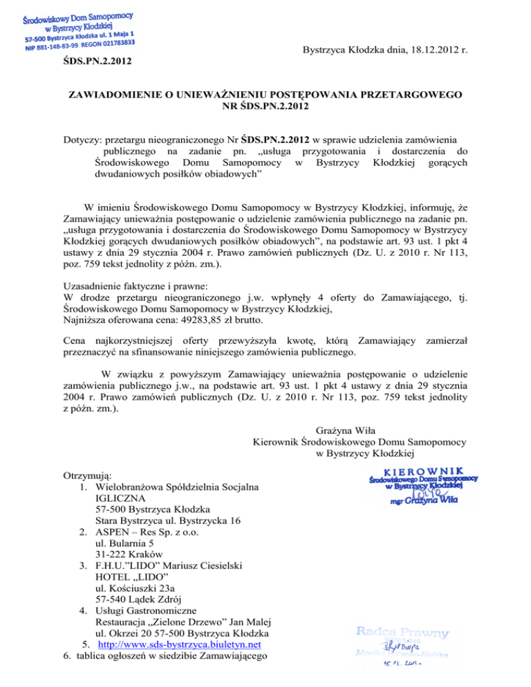 Bystrzyca Kłodzka dnia, 18.12.2012 r. ŚDS.PN.2.2012 ZAWIADOMIENIE O UNIEWAŻNIENIU POSTĘPOWANIA PRZETARGOWEGO NR ŚDS.PN.2.2012 Dotyczy: przetargu nieograniczonego Nr ŚDS.PN.2.2012 w sprawie udzielenia zamówienia publicznego na zadanie pn. „usługa przygotowania i dostarczenia do Środowiskowego Domu Samopomocy w Bystrzycy Kłodzkiej gorących dwudaniowych posiłków obiadowych” W imieniu Środowiskowego Domu Samopomocy w Bystrzycy Kłodzkiej, informuję, że Zamawiający unieważnia postępowanie o udzielenie zamówienia publicznego na zadanie pn. „usługa przygotowania i dostarczenia do Środowiskowego Domu Samopomocy w Bystrzycy Kłodzkiej gorących dwudaniowych posiłków obiadowych”, na podstawie art. 93 ust. 1 pkt 4 ustawy z dnia 29 stycznia 2004 r. Prawo zamówień publicznych (Dz. U. z 2010 r. Nr 113, poz. 759 tekst jednolity z późn. zm.). Uzasadnienie faktyczne i prawne: W drodze przetargu nieograniczonego j.w. wpłynęły 4 oferty do Zamawiającego, tj. Środowiskowego Domu Samopomocy w Bystrzycy Kłodzkiej, Najniższa oferowana cena: 49283,85 zł brutto. Cena najkorzystniejszej oferty przewyższyła kwotę, którą Zamawiający zamierzał przeznaczyć na sfinansowanie niniejszego zamówienia publicznego. W związku z powyższym Zamawiający unieważnia postępowanie o udzielenie zamówienia publicznego j.w., na podstawie art. 93 ust. 1 pkt 4 ustawy z dnia 29 stycznia 2004 r. Prawo zamówień publicznych (Dz. U. z 2010 r. Nr 113, poz. 759 tekst jednolity z późn. zm.). Grażyna Wiła Kierownik Środowiskowego Domu Samopomocy w Bystrzycy Kłodzkiej Otrzymują: 1. Wielobranżowa Spółdzielnia Socjalna IGLICZNA 57-500 Bystrzyca Kłodzka Stara Bystrzyca ul. Bystrzycka 16 2. ASPEN – Res Sp. z o.o. ul. Bularnia 5 31-222 Kraków 3. F.H.U.”LIDO” Mariusz Ciesielski HOTEL „LIDO” ul. Kościuszki 23a 57-540 Lądek Zdrój 4. Usługi Gastronomiczne Restauracja „Zielone Drzewo” Jan Malej ul. Okrzei 20 57-500 Bystrzyca Kłodzka 5. http://www.sds-bystrzyca.biuletyn.net 6. tablica ogłoszeń w siedzibie Zamawiającego