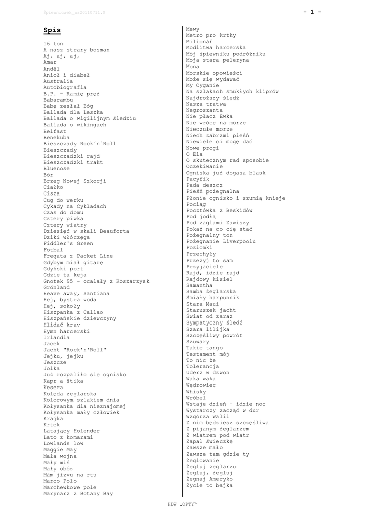 - 1 - Ńpiewniczek_wz20110711.0 Spis 16 ton A nasz strary bosman Aj, aj, aj, Amar Anděl Anioł i diabeł Australia Autobiografia B.P. – Ramię pręż Babarambu Babę zesłał Bóg Ballada dla Leszka Ballada o wigilijnym śledziu Ballada o wikingach Belfast Benekuba Bieszczady Rock´n´Roll Bieszczady Bieszczadzki rajd Bieszczadzki trakt Bluenose Bór Brzeg Nowej Szkocji Ciałko Cisza Cug do werku Cykady na Cykladach Czas do domu Cztery piwka Cztery wiatry Dziesięć w skali Beauforta Dziki włóczęga Fiddler's Green Fotbal Fregata z Packet Line Gdybym miał gitarę Gdyński port Gdzie ta keja Gnotek 95 - ocalały z Koszarzysk Grönland Heave away, Santiana Hej, bystra woda Hej, sokoły Hiszpanka z Callao Hiszpańskie dziewczyny Hlídaĉ krav Hymn harcerski Irlandia Jacek Jacht "Rock'n'Roll" Jejku, jejku Jeszcze Jolka Już rozpaliło się ognisko Kapr a ńtika Kesera Kolęda żeglarska Kolorowym szlakiem dnia Kołysanka dla nieznajomej Kołysanka mały człowiek Krajka Krtek Latający Holender Lato z komarami Lowlands low Maggie May Mała wojna Mały miś Mały obóz Mám jizvu na rtu Marco Polo Marchewkowe pole Marynarz z Botany Bay Mewy Metro pro krtky Milionář Modlitwa harcerska Mój śpiewniku podróżniku Moja stara peleryna Mona Morskie opowieści Może się wydawać My Cyganie Na szlakach smukłych kliprów Najdroższy śledź Nasza tratwa Negroszanta Nie płacz Ewka Nie wrócę na morze Nieczułe morze Niech zabrzmi pieśń Niewiele ci mogę dać Nowe progi O Ela O skutecznym rad sposobie Oczekiwanie Ogniska już dogasa blask Pacyfik Pada deszcz Pieśń pożegnalna Płonie ognisko i szumią knieje Pociąg Pocztówka z Beskidów Pod jodłą Pod żaglami Zawiszy Pokaż na co cię stać Pożegnalny ton Pożegnanie Liverpoolu Poziomki Przechyły Przeżyj to sam Przyjaciele Rajd, idzie rajd Rajdowy kisiel Samantha Samba żeglarska Śmiały harpunnik Stara Maui Staruszek jacht Świat od zaraz Sympatyczny śledź Szara lilijka Szczęśliwy powrót Szuwary Takie tango Testament mój To nic że Tolerancja Uderz w dzwon Waka waka Wędrowiec Whisky Wróbel Wstaje dzień - idzie noc Wystarczy zacząć w dur Wzgórza Walii Z nim będziesz szczęśliwa Z pijanym żeglarzem Z wiatrem pod wiatr Zapal świeczkę Zawsze mało Zawsze tam gdzie ty Żeglowanie Żegluj żeglarzu Żegluj, żegluj Żegnaj Ameryko Życie to bajka HDW „OPTY― - 2 - Ńpiewniczek_wz20110711.0 HDW „OPTY― - 3 - Ńpiewniczek_wz20110711.0 16 ton 1. Ktoś mówił, że z gliny ulepił mnie Pan, e H7 e A7 lecz przecież się składam z kości i krwi, e H7 e A7 z kości i krwi, jarzma na kark, e e7 a a7 i pary rąk, pary silnych rąk. H7 e R: Co dzień szesnaście ton i co z tego mam? e H7 e A7 tym więcej mam długów, im więcej mam lat. e H7 e A7 nie wołaj św. Piotrze, ja nie mogę przyjść, e e7 a a7 bo duszę swoją oddałem za dług. H7 e 2. Gdy matka mnie rodziła, pochmurny był świt, podniosłem więc szuflę, poszedłem pod szyb. nadzorca mi rzekł - "Nie zbawi Cię Pan, załaduj co dzień po szesnaście ton." 3. Czort może dałby radę, a może i nie, szesnastu tonom podołać co dzień. szesnaście ton, szesnaście jak drut, codzień nie da rady nawet i we dwóch. 4. Gdy kiedyś mnie spotkasz, lepiej z drogi mi zejdź, bo byli już tacy - nie pytaj, gdzie są. nie pytaj, gdzie są, bo zawsze jest ktoś, nie ten, to ów, co urządzi Cię. 16 ton HDW „OPTY― A - 4 - Ńpiewniczek_wz20110711.0 A nasz stary bosman siwy 1. A nasz stary bosman siwy nad kieliszkiem wina drży, Ciągle śpiewa wiara słucha, Co on dziś opowie im. Stary bosman fajkę pyka I wspomnienia dalej mkną, Ciągle oko swe przymyka I zaczyna piosnkę tą. C F G C C F G C R: I wspominaj te czasy, gdy byłeś matrosem amigo Aj, aj, aj, aj, aj, aj, aj, aj, aj, karamba. C F C G C 2. I choć nie raz była bieda, Niespokojne były dni, Wtedy fajka ma jedyna Odwagi dodała mi. Stary bosman fajkę pyka I wspomnienia dalej mkną, Ciągle oko swe przymyka I zaczyna piosnkę tą: R: I przeklinaj te czasy,... A nasz stary bosman siwy HDW „OPTY― - 5 - Ńpiewniczek_wz20110711.0 Aj, aj, aj 1. Noc się rozsiada w lesie, D Echo po wodzie niesie aj, aj , aj, aj, aj! A7 Jasna księżyca pełnia, Krajobraz uzupełnia aj, aj, aj, aj, aj! D A my znów spać nie możemy, D7 Przyjdzie druh, może zaśniemy G A teraz wszyscy razem D Śpiewajmy pełnym głosem tak: aj aj aj aj aj A7D 2. Ogień wesoło płonie, Polana w blasku płonie aj, aj, aj, aj, aj! Księżyc rozpuszcza oko, Ale jest za wysoko aj, aj, aj, aj, aj! Chciałby on łysinę schylić, Złapać ton i nie pomylić, Gdy w kręgu wszyscy razem Śpiewamy pełnym głosem tak: aj aj aj aj aj Aj, aj, aj HDW „OPTY― A - 6 - Ńpiewniczek_wz20110711.0 Amar 1. Być może mają urok oceany i złota plaż, I groźnie bywa, gdy szkwał rozhukany uderza w twarz I piękne są wyprawy Hayerdala, Teligi szlak, Lecz zanim nas uniesie morska fala śpiewajmy tak: R: Amar, amar oto okrzyk nasz! Amar, amar już to hasło znasz! Badajmy jezior tajemnice i potoków bieg, Aż w przygodę wszystko zmieni nasz młodzieńczy wiek. 2. Na pewno gdzieś są palmy i atole i gniazda burz, Na pewno miło patrzeć na busolę i trzymać kurs. Na pewno jest przyjemnie w morską ciszę wyzywać wiatr, Lecz nim nas fale morskie rozkołyszą śpiewajmy tak: 3. Czy są Ci znane małych rzek sekrety, strumyków nurt, Czy nocą ci śpiewały oczerety i żabi chór, Czy widziałeś białe żagle i wioseł ruch, Jak nie, to z nami śpiewać możesz z całego tchu: Amar HDW „OPTY― - 7 - Ńpiewniczek_wz20110711.0 Anděl 1. Z rozmlácenýho kostela C a v krabici s kusem mýdla C G7 přinesl jsem si anděla polámali mu křídla díval se na mě oddaně já měl jsem trochu trému, tak vtiskl jsem mu do dlaně lahviĉku od parfému R: A proto prosím věř mi C a chtěl jsem ho žádat C G7 aby mi mezi dveřmi pomohl hádat C a G7 C co mě ĉeká a nemine_ C a G7 C co mě ĉeká a nemine_ C a G7 C 2. Pak hlídali sme oblohu pozorujíce