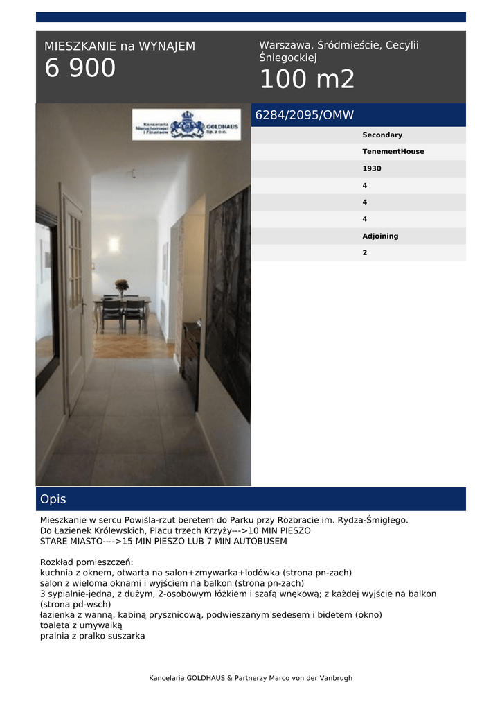 MIESZKANIE na WYNAJEM 6 900 Warszawa, Śródmieście, Cecylii Śniegockiej 100 m2 6284/2095/OMW Secondary TenementHouse 1930 4 4 4 Adjoining 2 Opis Mieszkanie w sercu Powiśla-rzut beretem do Parku przy Rozbracie im. Rydza-Śmigłego. Do Łazienek Królewskich, Placu trzech Krzyży--->10 MIN PIESZO STARE MIASTO---->15 MIN PIESZO LUB 7 MIN AUTOBUSEM Rozkład pomieszczeń: kuchnia z oknem, otwarta na salon+zmywarka+lodówka (strona pn-zach) salon z wieloma oknami i wyjściem na balkon (strona pn-zach) 3 sypialnie-jedna, z dużym, 2-osobowym łóżkiem i szafą wnękową; z każdej wyjście na balkon (strona pd-wsch) łazienka z wanną, kabiną prysznicową, podwieszanym sedesem i bidetem (okno) toaleta z umywalką pralnia z pralko suszarka Kancelaria GOLDHAUS & Partnerzy Marco von der Vanbrugh pomieszczenie gospodarcze Mieszkanie po gruntownym remoncie zakończonym w marcu 2012 r., z zachowaną oryginalną podłogą drewnianą, dwuskrzydłowymi drzwiami, drzwiami zewnętrznymi oraz innymi oryginalnymi elementami przedwojennymi. Wysokość 3,05 m. W sypialni łóżko małżeńskie i szafa-garderoba o szerokości 2,5 m. Nowa kuchnia, pralko-suszarka, zmywarka, lodówka, zamrażarka i wyposażenie łazienki. Do mieszkania przynależy piwnica o powierzchni kilkunastu metrów. DODATKOWE ZALETY:piwnica ponad 10m2, strych, taras, garaż lub miejsce parkingowe dodatkowo płatne **ZAPRASZAM DO OBEJRZENIA** 109/ Beata Drab tel. +48/602-442-408 email: [email protected] Kancelaria GOLDHAUS & Partnerzy Marco von der Vanbrugh Powered by TCPDF (www.tcpdf.org)