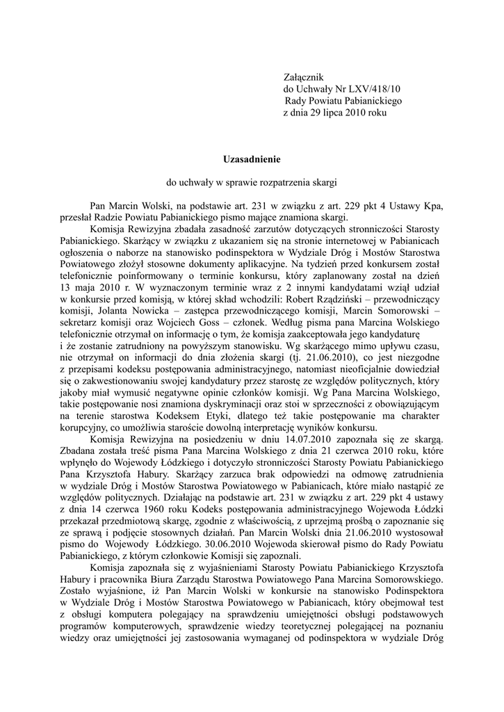 Załącznik do Uchwały Nr LXV/418/10 Rady Powiatu Pabianickiego z dnia 29 lipca 2010 roku Uzasadnienie do uchwały w sprawie rozpatrzenia skargi Pan Marcin Wolski, na podstawie art. 231 w związku z art. 229 pkt 4 Ustawy Kpa, przesłał Radzie Powiatu Pabianickiego pismo mające znamiona skargi. Komisja Rewizyjna zbadała zasadność zarzutów dotyczących stronniczości Starosty Pabianickiego. Skarżący w związku z ukazaniem się na stronie internetowej w Pabianicach ogłoszenia o naborze na stanowisko podinspektora w Wydziale Dróg i Mostów Starostwa Powiatowego złożył stosowne dokumenty aplikacyjne. Na tydzień przed konkursem został telefonicznie poinformowany o terminie konkursu, który zaplanowany został na dzień 13 maja 2010 r. W wyznaczonym terminie wraz z 2 innymi kandydatami wziął udział w konkursie przed komisją, w której skład wchodzili: Robert Rządziński – przewodniczący komisji, Jolanta Nowicka – zastępca przewodniczącego komisji, Marcin Somorowski – sekretarz komisji oraz Wojciech Goss – członek. Według pisma pana Marcina Wolskiego telefonicznie otrzymał on informację o tym, że komisja zaakceptowała jego kandydaturę i że zostanie zatrudniony na powyższym stanowisku. Wg skarżącego mimo upływu czasu, nie otrzymał on informacji do dnia złożenia skargi (tj. 21.06.2010), co jest niezgodne z przepisami kodeksu postępowania administracyjnego, natomiast nieoficjalnie dowiedział się o zakwestionowaniu swojej kandydatury przez starostę ze względów politycznych, który jakoby miał wymusić negatywne opinie członków komisji. Wg Pana Marcina Wolskiego, takie postępowanie nosi znamiona dyskryminacji oraz stoi w sprzeczności z obowiązującym na terenie starostwa Kodeksem Etyki, dlatego też takie postępowanie ma charakter korupcyjny, co umożliwia staroście dowolną interpretację wyników konkursu. Komisja Rewizyjna na posiedzeniu w dniu 14.07.2010 zapoznała się ze skargą. Zbadana została treść pisma Pana Marcina Wolskiego z dnia 21 czerwca 2010 roku, które wpłynęło do Wojewody Łódzkiego i dotyczyło stronniczości Starosty Powiatu Pabianickiego Pana Krzysztofa Habury. Skarżący zarzuca brak odpowiedzi na odmowę zatrudnienia w wydziale Dróg i Mostów Starostwa Powiatowego w Pabianicach, które miało nastąpić ze względów politycznych. Działając na podstawie art. 231 w związku z art. 229 pkt 4 ustawy z dnia 14 czerwca 1960 roku Kodeks postępowania administracyjnego Wojewoda Łódzki przekazał przedmiotową skargę, zgodnie z właściwością, z uprzejmą prośbą o zapoznanie się ze sprawą i podjęcie stosownych działań. Pan Marcin Wolski dnia 21.06.2010 wystosował pismo do Wojewody Łódzkiego. 30.06.2010 Wojewoda skierował pismo do Rady Powiatu Pabianickiego, z którym członkowie Komisji się zapoznali. Komisja zapoznała się z wyjaśnieniami Starosty Powiatu Pabianickiego Krzysztofa Habury i pracownika Biura Zarządu Starostwa Powiatowego Pana Marcina Somorowskiego. Zostało wyjaśnione, iż Pan Marcin Wolski w konkursie na stanowisko Podinspektora w Wydziale Dróg i Mostów Starostwa Powiatowego w Pabianicach, który obejmował test z obsługi komputera polegający na sprawdzeniu umiejętności obsługi podstawowych programów komputerowych, sprawdzenie wiedzy teoretycznej polegającej na poznaniu wiedzy oraz umiejętności jej zastosowania wymaganej od podinspektora w wydziale Dróg i Mostów oraz test z wiedzy ogólnej polegający na sprawdzeniu wiedzy związanej z funkcjonowaniem administracji publicznej, otrzymał największą liczbę punktów spośród trzech kandydatów, którzy spełnili wymogi formalne. Tym samym Pan Marcin Wolski został dopuszczony do ostatniego etapu kwalifikacji tj. selekcji końcowej kandydatów. Wynik głosowania członków komisji rekrutacyjnej: 1 głos za, 1 przeciw, 2 wstrzymujące się. Starosta odmówił zatrudnienia powyższego kandydata w Wydziale Dróg i Mostów Starostwa Powiatowego w Pabianicach. Jednocześnie skarżący został poinformowany, że zasady rekrutacji nie podlegają pod przepisy kodeksu postępowania administracyjnego i w związku z tym nie istnieje konieczność powiadomienia o powodzie niezatrudnienia na stanowisku. Komisja Rewizyjna na posiedzeniu w dniu 14.07.2010 zapoznała się z treścią skargi dotyczącą stronniczości Starosty Pabianickiego w sprawie rekrutacji na stanowisko podinspektora w wydziale Dróg i Mostów, a w szczególności: niezatrudnienia skarżącego na wyżej wymienionym stanowisku mimo uzyskania w procesie rekrutacyjnym największej liczby punktów, nie powiadomienia o powodach odmowy zatrudnienia a także o względach politycznych tej decyzji. Wyżej wymienione zarzuty nie znalazły potwierdzenia w dokumentach. Komisja Rewizyjna w głosowaniu uznała skargę na działalność Starosty za bezzasadną. Przewodniczący Rady Powiatu Pabianickiego /-/ Florian Wlaźlak
