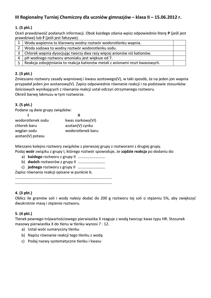 III Regionalny Turniej Chemiczny dla uczniów gimnazjów – klasa II – 15.06.2012 r. 1. (5 pkt.) Oceń prawdziwość podanych informacji. Obok każdego zdania wpisz odpowiednio literę P (jeśli jest prawdziwe) lub F (jeśli jest fałszywe). 1 Woda wapienna to klarowny wodny roztwór wodorotlenku wapnia. 2 Woda sodowa to wodny roztwór wodorotlenku sodu. 3 Chlorek wapnia dysocjując tworzy dwa razy więcej anionów niż kationów. 4 pH wodnego roztworu amoniaku jest większe od 7. 5 Reakcja zobojętniania to reakcja kationów metali z anionami reszt kwasowych. 2. (3 pkt.) Zmieszano roztwory zasady wapniowej i kwasu azotowego(V), w taki sposób, że na jeden jon wapnia przypadał jeden jon azotanowy(V). Zapisz odpowiednie równanie reakcji i na podstawie stosunków ilościowych wynikających z równania reakcji ustal odczyn otrzymanego roztworu. Określ barwę lakmusu w tym roztworze. 3. (5 pkt.) Podane są dwie grupy związków: I II wodorotlenek sodu kwas siarkowy(VI) chlorek baru azotan(V) cynku węglan sodu wodorotlenek baru azotan(V) potasu Mieszano kolejno roztwory związków z pierwszej grupy z roztworami z drugiej grupy. Podaj wzór związku z grupy I, którego roztwór spowoduje, że zajdzie reakcja po dodaniu do: a) każdego roztworu z grupy II ………………………. b) dwóch roztworów z grupy II ………………………. c) jednego roztworu z grupy II ………………………. Zapisz równania reakcji opisane w punkcie b. ……………………………………………………………………………………… ……………………………………………………………………………………… 4. (3 pkt.) Oblicz ile gramów soli i wody należy dodać do 200 g roztworu tej soli o stężeniu 5%, aby zwiększyć dwukrotnie masę i stężenie roztworu. 5. (4 pkt.) Tlenek pewnego trójwartościowego pierwiastka X reaguje z wodą tworząc kwas typu HR. Stosunek masowy pierwiastka X do tlenu w tlenku wynosi 7 : 12. a) Ustal wzór sumaryczny tlenku b) Napisz równanie reakcji tego tlenku z wodą c) Podaj nazwy systematyczne tlenku i kwasu Klucz odpowiedzi Zad. 1 max.5 pkt. Za każdy poprawny wpis 1 2 3 P F P 1 pkt. 4 P 5 F Zad. 2 max.3 pkt. Za poprawny zapis równania reakcji – 1 pkt. Za ustalenie odczynu roztworu – 1 pkt. Za podanie barwy lakmusu w tym roztworze – 1 pkt. Ca(OH)2 + 2HNO3 → Ca(NO3)2 + 2H2O 1Ca2+ - 1NO3− → 2OH− - 1H+ → odczyn zasadowy Barwa lakmusu w roztworze – niebieska Zad. 3 max. 5 pkt. Za podanie prawidłowych wzorów po 1 pkt. a) Na2CO3 b) NaOH c) BaCl2 Za zapisanie równań reakcji po 1 pkt. H2SO4 + 2NaOH → Na2SO4 + 2H2O Zn(NO3)2 + 2NaOH → Zn(OH)2↓ +2NaNO3 – 3x 1 pkt. = 3 pkt. – 2 x 1 pkt. = 2 pkt. Zad. 4 max. 3 pkt. Za ustalenie masy i stężenia procentowego roztworu drugiego – 1 pkt. mrII = 2 ∙ 200g = 400g cpII = 10% obliczenie masy substancji w pierwszym i drugim roztworze oraz ich różnicy (ustalenie ile należy dodać substancji) – 1 pkt. msI = 5% z 200 g = 10 g msII = 10% z 400 g = 40 g msd = 40 g – 10 g = 30 g za obliczenie masy wody, którą należy dodać – 1 pkt. mwd = 200 g - 30 g = 170 g Zad. 5 max. 4 pkt. Za poprawną metodę obliczania masy atomowej pierwiastka X = x = 14 u Ustalenie wzoru N2O3 Zapisanie równania reakcji N2O3 + H2O → 2HNO2 Za podanie dwóch nazw N2O3 – tlenek azotu(III) HNO2 – kwas azotowy(III) Łączna liczba punktów 20. – 1 pkt. – 1 pkt. – 1 pkt. – 1 pkt.