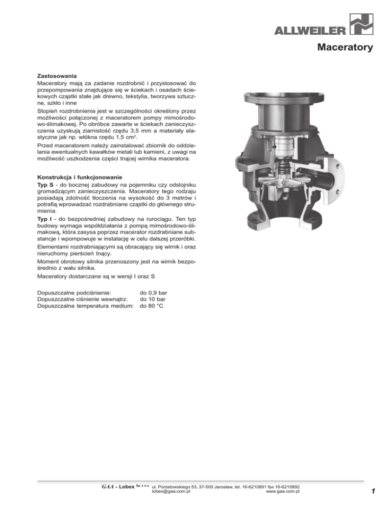 Maceratory Zastosowania Maceratory maj¹ za zadanie rozdrobniæ i przystosowaæ do przepompowania znajduj¹ce siê w ciekach i osadach ciekowych cz¹stki sta³e jak drewno, tekstylia, tworzywa sztuczne, szk³o i inne Stopieñ rozdrobnienia jest w szczególnoci okrelony przez mo¿liwoci po³¹czonej z maceratorem pompy mimorodowo-limakowej. Po obróbce zawarte w ciekach zanieczyszczenia uzyskuj¹ ziarnistoæ rzêdu 3,5 mm a materia³y elastyczne jak np. w³ókna rzêdu 1,5 cm2. Przed maceratorem nale¿y zainstalowaæ zbiornik do oddzielania ewentualnych kawa³ków metali lub kamieni, z uwagi na mo¿liwoæ uszkodzenia czêci tn¹cej wirnika maceratora. Konstrukcja i funkcjonowanie Typ S - do bocznej zabudowy na pojemniku czy odstojniku gromadz¹cym zanieczyszczenia. Maceratory tego rodzaju posiadaj¹ zdolnoæ t³oczenia na wysokoæ do 3 metrów i potrafi¹ wprowadzaæ rozdrabniane cz¹stki do g³ównego strumienia. Typ I - do bezporedniej zabudowy na ruroci¹gu. Ten typ budowy wymaga wspó³dzia³ania z pomp¹ mimorodowo-limakow¹, która zasysa poprzez macerator rozdrabniane substancje i wpompowuje w instalacjê w celu dalszej przeróbki. Elementami rozdrabniaj¹cymi s¹ obracaj¹cy siê wirnik i oraz nieruchomy piercieñ tn¹cy. Moment obrotowy silnika przenoszony jest na wirnik bezporednio z wa³u silnika. Maceratory dostarczane s¹ w wersji I oraz S Dopuszczalne podcinienie: Dopuszczalne cinienie wewn¹trz: Dopuszczalna temperatura medium: do 0,9 bar do 10 bar do 80 °C GAA -Lobex Sp. z o.o. ul. Poniatowskiego 53, 37-500 Jaros³aw, tel. 16-6210891 fax 16-6210892 [email protected] www.gaa.com.pl Typ AM Maceratory Dane techniczne Dopuszczalne podcinienie: Dopuszczalne cinienie wewn¹trz: Dopuszczalna temperatura medium: 0,9 bar 10 bar 80 °C Typ AM..S-1 Przep³yw max. osadu o zawart. Obroty Moc suchej masy 3% Typ AM AM AM AM 10 20 40 80 m3/h 10 20 40 80 S-1 S-1 S-1 S-1 1/min 1500 1500 1000 1000 W³asna Ciê¿ar wysokoæ podnoszenia kW 4,0 5,5 7,5 11,0 m 3,0 kg 124 149 277 300 Typ AM..I-1 Typ AM AM AM AM AM AM GAA -Lobex Sp. z o.o. 10 20 40 80 120 160 I-1 I-1 I-1 I-1 I-1 I-1 Przep³yw max. osadu o zawartoci suchej masy 3% Obroty Moc Ciê¿ar m3/h 10 20 40 80 120 160 1/min 1500 1500 1000 1000 750 750 kW 4,0 5,5 7,5 11,0 15,0 18,5 kg 191 216 352 376 656 738 ul. Poniatowskiego 53, 37-500 Jaros³aw, tel. 16-6210891 fax 16-6210892 [email protected] www.gaa.com.pl Typ AM Wymiary agregatu AM..S-1 z silnikiem kierunek obrotów: w lewo i prawo wymiary w mm rednica piercienia tn¹cego Typ [mm] AM AM AM AM 10 20 40 80 S-1 S-1 S-1 S-1 Ko³nierze Silnik wg DIN 2501, PN 10 wielDN1 D1 bf1 koæ k1 g1 g2 k1 g1 il. DN2 D2 bf2 otw. S-1 S-1 S-1 S-1 k2 g2 il. otw. 112 M 150 282 26 240 22 8 65 185 20 145 18 4 6" 282 26 241 22 8 2 1/2" 185 20 140 19 4 200 132 S 150 282 26 240 22 8 65 185 20 145 18 4 6" 282 26 241 22 8 2 1/2" 185 20 140 19 4 300 160 M 200 343 29 295 22 8 80 196 22 160 18 8 8" 343 29 299 22 8 3" 196 22 152 19 4 300 160 L 200 343 29 295 22 8 80 196 22 160 18 8 8" 343 29 299 22 8 3" 196 22 152 19 4 Wymiary czêci a1 10 20 40 80 k2 il. DN1 D1 bf1 otw. 200 Typ AM AM AM AM wg ANSI B 16.1, Class 125 il. DN2 D2 bf2 otw. a7 a8 a9 a10 b1 300 275 140 210 505 319 824 a2 a3 a4 a5 a6 20 50 180 210 190 270 225 b2 b3 b4 c1 300 314 140 210 525 362 887 8 c2 d1 d2 d3 d4 d5 15 370 286 222 250 13 d6 h1 h2 h3 13 197 112 220 Króæce pomocnicze Wymiar demonta¿owy odpowietrzenie / czujnik cinienia x E1 / M1 S1 300 G 1/4" G 1/4" Zamek wodny 20 50 180 210 216 270 250 8 15 370 265 265 300 13 13 197 132 220 300 G 1/4" G 1/4" 385 391 210 278 668 473 1141 30 65 260 280 254 340 320 8 21 500 323 323 350 13 15 260 160 295 400 G 1/4" G 1/4" 385 391 254 278 668 517 1185 30 65 304 280 254 340 320 8 21 500 323 323 350 13 15 260 160 295 400 G 1/4" G 1/4" GAA -Lobex Sp. z o.o. ul. Poniatowskiego 53, 37-500 Jaros³aw, tel. 16-6210891 fax 16-6210892 [email protected] www.gaa.com.pl ! Typ AM Wymiary agregatu AM..I-1 z silnikiem kierunek obrotów: w lewo i prawo wymiary w mm Typ rednica piercienia tn¹cego mm Ko³nierze Silnik wg DIN 2501, PN 10 wg ANSI B 16.1, Class 125 wielkoæ DN1 D bf k1 g1 il. otw. DN1 D bf k1 g1 il. otw. 8 AM 10 I-1 200 112 M 125 254 26 210 18 8 5" 254 26 216 22 AM 20 I-1 200 132 S 125 254 26 210 18 8 5" 254 26 216 22 8 AM 40 I-1 300 160 M 150 285 26 240 22 8 6" 285 26 241 22 8 AM 8 80 I-1 300 160 L 150 285 26 240 22 8 6" 285 26 241 22 AM 120 I-1 400 200 L 200 343 29 295 22 8 8" 343 29 299 22 8 AM 160 I-1 400 225 S 200 343 29 295 22 8 8" 343 29 299 22 8 Wymiary czêci Typ AM 10 I-1 AM 20 I-1 AM 40 I-1 AM 80 I-1 AM 120 I-1 AM 160 I-1 Króæce pomocnicze Wymiar demonta- Czujnik Odpowie- Zamek ¿owy cinienia trzenie wodny a 500 500 700 700 840 840 b 182 182 200 200 235 235 c 550 570 671 671 775 805 d 370 370 500 500 610 610 e 310 310 310 310 310 310 f 350 350 350 350 350 350 g 470 470 470 470 470 470 h 510 510 510 510 510 510 i 23,5 23,5 23,5 23,5 23,5 23,5 k 22 22 22 22 22 22 o 250 300 350 350 400 450 p 319 362 473 517 640 660 q 286 350 400 400 531 585 r 222 265 323 323 413 460 x 300 300 400 400 500 500 M1 G 1/2" G 1/2" G 1/2" G 1/2" G 1/2" G 1/2" E1 G 1/4" G 1/4" G 1/4" G 1/4" G 1/4" G 1/4" S1 G 1/4" G 1/4" G 1/4" G 1/4" G 1/4" G 1/4" Zastrzegamy mo¿liwoæ zmian konstrukcyjnych bez powiadomienia. " GAA -Lobex Sp. z o.o. ul. Poniatowskiego 53, 37-500 Jaros³aw, tel. 16-6210891 fax 16-6210892 [email protected] www.gaa.com.pl Typ ABM Maceratory Dane techniczne Dopuszczalne podcinienie: Dopuszczalne cinienie wewn¹trz: Dopuszczalna temperatura medium: 0,5 bar 10 bar 80 °C Typ ABM - 2 - S Typ rednica piercienia tn¹cego Przep³yw max. osadu o zawartoci suchej masy 3% mm m3/h 1/min kW m kg 130 2 1500 0,6 2,5 19 ABM-2-S Obroty Moc W³asna wysokoæ Ciê¿ar podnoszenia Typ ABM..S-1 Typ Przep³yw rednica max. osadu W³asna piero zawartoci Obroty Moc wysokoæ Ciê¿ar cienia suchej masy podnoszenia tn¹cego 3% mm m3/h 1/min kW ABM 10 S-1 200 10 1500 4,0 ABM 20 S-1 200 20 1500 5,5 ABM 40 S-1 300 40 1000 7,5 ABM 80 S-1 300 8