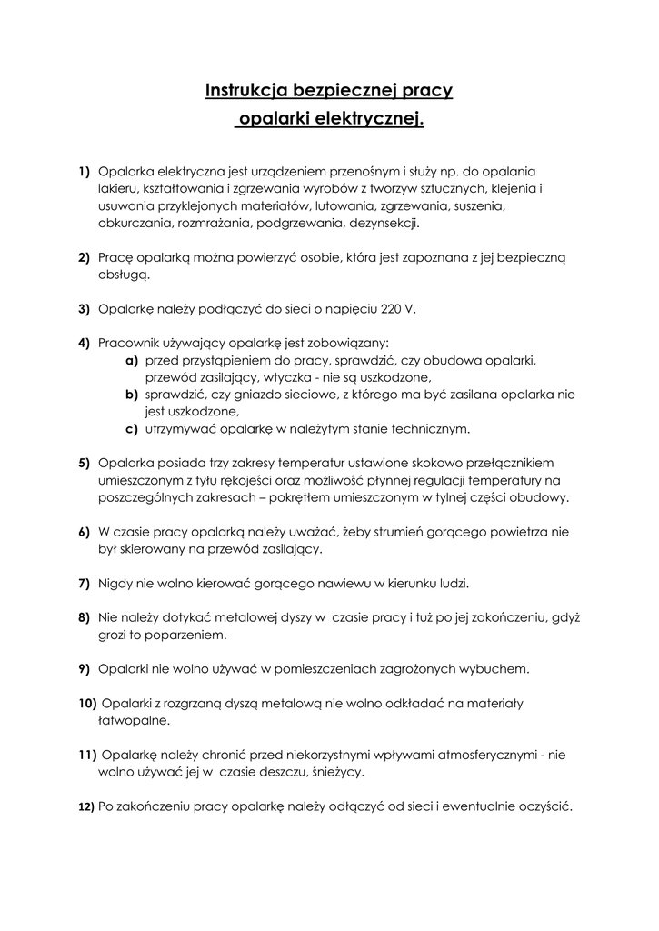 Instrukcja bezpiecznej pracy opalarki elektrycznej. 1) Opalarka elektryczna jest urządzeniem przenośnym i służy np. do opalania lakieru, kształtowania i zgrzewania wyrobów z tworzyw sztucznych, klejenia i usuwania przyklejonych materiałów, lutowania, zgrzewania, suszenia, obkurczania, rozmrażania, podgrzewania, dezynsekcji. 2) Pracę opalarką można powierzyć osobie, która jest zapoznana z jej bezpieczną obsługą. 3) Opalarkę należy podłączyć do sieci o napięciu 220 V. 4) Pracownik używający opalarkę jest zobowiązany: a) przed przystąpieniem do pracy, sprawdzić, czy obudowa opalarki, przewód zasilający, wtyczka - nie są uszkodzone, b) sprawdzić, czy gniazdo sieciowe, z którego ma być zasilana opalarka nie jest uszkodzone, c) utrzymywać opalarkę w należytym stanie technicznym. 5) Opalarka posiada trzy zakresy temperatur ustawione skokowo przełącznikiem umieszczonym z tyłu rękojeści oraz możliwość płynnej regulacji temperatury na poszczególnych zakresach – pokrętłem umieszczonym w tylnej części obudowy. 6) W czasie pracy opalarką należy uważać, żeby strumień gorącego powietrza nie był skierowany na przewód zasilający. 7) Nigdy nie wolno kierować gorącego nawiewu w kierunku ludzi. 8) Nie należy dotykać metalowej dyszy w czasie pracy i tuż po jej zakończeniu, gdyż grozi to poparzeniem. 9) Opalarki nie wolno używać w pomieszczeniach zagrożonych wybuchem. 10) Opalarki z rozgrzaną dyszą metalową nie wolno odkładać na materiały łatwopalne. 11) Opalarkę należy chronić przed niekorzystnymi wpływami atmosferycznymi - nie wolno używać jej w czasie deszczu, śnieżycy. 12) Po zakończeniu pracy opalarkę należy odłączyć od sieci i ewentualnie oczyścić.