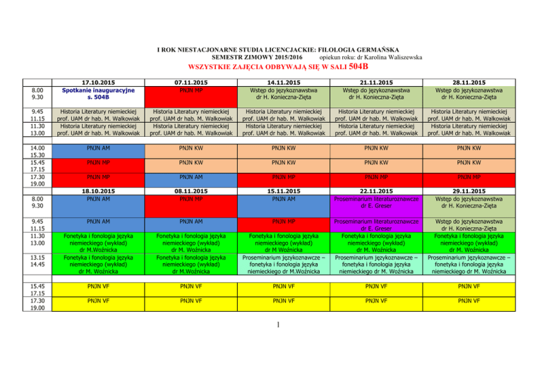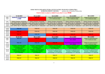 I ROK NIESTACJONARNE STUDIA LICENCJACKIE: FILOLOGIA GERMAŃSKA SEMESTR ZIMOWY 2015/2016 opiekun roku: dr Karolina Waliszewska WSZYSTKIE ZAJĘCIA ODBYWAJĄ SIĘ W SALI 504B 8.00 9.30 17.10.2015 Spotkanie inauguracyjne s. 504B 07.11.2015 PNJN MP 14.11.2015 Wstęp do językoznawstwa dr H. Konieczna-Zięta 21.11.2015 Wstęp do językoznawstwa dr H. Konieczna-Zięta 28.11.2015 Wstęp do językoznawstwa dr H. Konieczna-Zięta 9.45 11.15 11.30 13.00 Historia Literatury niemieckiej prof. UAM dr hab. M. Walkowiak Historia Literatury niemieckiej prof. UAM dr hab. M. Walkowiak Historia Literatury niemieckiej prof. UAM dr hab. M. Walkowiak Historia Literatury niemieckiej prof. UAM dr hab. M. Walkowiak Historia Literatury niemieckiej prof. UAM dr hab. M. Walkowiak Historia Literatury niemieckiej prof. UAM dr hab. M. Walkowiak Historia Literatury niemieckiej prof. UAM dr hab. M. Walkowiak Historia Literatury niemieckiej prof. UAM dr hab. M. Walkowiak Historia Literatury niemieckiej prof. UAM dr hab. M. Walkowiak Historia Literatury niemieckiej prof. UAM dr hab. M. Walkowiak 14.00 15.30 15.45 17.15 17.30 19.00 PNJN AM PNJN KW PNJN KW PNJN KW PNJN KW PNJN MP PNJN KW PNJN KW PNJN KW PNJN KW PNJN MP PNJN AM PNJN MP PNJN MP PNJN MP 18.10.2015 PNJN AM 08.11.2015 PNJN MP 15.11.2015 PNJN AM 22.11.2015 Proseminarium literaturoznawcze dr E. Greser 29.11.2015 Wstęp do językoznawstwa dr H. Konieczna-Zięta PNJN AM PNJN AM PNJN MP Fonetyka i fonologia języka niemieckiego (wykład) dr M.Woźnicka Fonetyka i fonologia języka niemieckiego (wykład) dr M. Woźnicka Fonetyka i fonologia języka niemieckiego (wykład) dr M. Woźnicka Fonetyka i fonologia języka niemieckiego (wykład) dr M.Woźnicka Fonetyka i fonologia języka niemieckiego (wykład) dr M Woźnicka Proseminarium językoznawcze – fonetyka i fonologia języka niemieckiego dr M.Woźnicka Proseminarium literaturoznawcze dr E. Greser Fonetyka i fonologia języka niemieckiego (wykład) dr M. Woźnicka Proseminarium językoznawcze – fonetyka i fonologia języka niemieckiego dr M. Woźnicka Wstęp do językoznawstwa dr H. Konieczna-Zięta Fonetyka i fonologia języka niemieckiego (wykład) dr M. Woźnicka Proseminarium językoznawcze – fonetyka i fonologia języka niemieckiego dr M. Woźnicka PNJN VF PNJN VF PNJN VF PNJN VF PNJN VF PNJN VF PNJN VF PNJN VF PNJN VF PNJN VF 8.00 9.30 9.45 11.15 11.30 13.00 13.15 14.45 15.45 17.15 17.30 19.00 l I ROK NIESTACJONARNE STUDIA LICENCJACKIE: FILOLOGIA GERMAŃSKA SEMESTR ZIMOWY 2015/2016 C.D. 8.00 9.30 9.45 11.15 11.30 13.00 14.00 15.30 15.45 17.15 17.30 19.00 8.00 9.30 9.45 11.15 11.30 13.00 13.15 14.45 15.45 17.15 17.30 19.00 05.12.2015 PNJN MP 12.12.2015 PNJN MP 09.01.2016 PNJN MP 23.01.2016 Wstęp do językoznawstwa dr H. Konieczna-Zięta Historia i kultura niemieckiego Historia i kultura niemieckiego Historia i kultura niemieckiego Historia i kultura niemieckiego obszaru językowego (wykład) obszaru językowego (wykład) obszaru językowego (wykład) obszaru językowego (wykład) dr J. Krauze-Pierz dr J. Krauze-Pierz dr J. Krauze-Pierz dr J. Krauze-Pierz Historia i kultura niemieckiego Historia i kultura niemieckiego Historia i kultura niemieckiego Historia i kultura niemieckiego obszaru językowego (wykład) obszaru językowego (wykład) dr obszaru językowego (wykład) obszaru językowego (wykład) dr J. Krauze-Pierz J. Krauze-Pierz dr J. Krauze-Pierz dr J. Krauze-Pierz 30.01.2016 Wstęp do językoznawstwa dr H. Konieczna-Zięta Historia i kultura niemieckiego obszaru językowego (wykład) dr J. Krauze-Pierz Historia i kultura niemieckiego obszaru językowego (wykład) dr J. Krauze-Pierz PNJN KW PNJN KW PNJN KW PNJN KW PNJN MP PNJN KW PNJN KW PNJN KW PNJN MP PNJN MP PNJN AM PNJN AM PNJN AM PNJN MP PNJN AM 06.12.2015 Proseminarium literaturoznawcze dr E. Greser 13.12.2015 Proseminarium literaturoznawcze dr E. Greser 10.01.2016 Proseminarium literaturoznawcze dr E. Greser 24.01.2016 Proseminarium literaturoznawcze dr E. Greser 31.01.2016 Wstęp do językoznawstwa dr H. Konieczna-Zięta Proseminarium literaturoznawcze dr E. Greser Fonetyka i fonologia języka niemieckiego (wykład) dr M. Woźnicka Proseminarium językoznawcze – fonetyka i fonologia języka niemieckiego dr M. Woźnicka Proseminarium literaturoznawcze dr E. Greser Fonetyka i fonologia języka niemieckiego (wykład) dr M. Woźnicka Proseminarium językoznawcze – fonetyka i fonologia języka niemieckiego dr M. Woźnicka Proseminarium literaturoznawcze dr E. Greser Proseminarium językoznawcze – fonetyka i fonologia języka niemieckiego dr M. Woźnicka Proseminarium językoznawcze – fonetyka i fonologia języka niemieckiego dr M. Woźnicka Wstęp do językoznawstwa dr H. Konieczna-Zięta Proseminarium językoznawcze – fonetyka i fonologia języka niemieckiego dr M. Woźnicka Proseminarium językoznawcze – fonetyka i fonologia języka niemieckiego dr M. Woźnicka Wstęp do językoznawstwa dr H. Konieczna-Zięta Proseminarium językoznawcze – fonetyka i fonologia języka niemieckiego dr M. Woźnicka Proseminarium literaturoznawcze dr E. Greser PNJN VF PNJN VF PNJN VF PNJN AM PNJN AM PNJN VF PNJN VF PNJN AM PNJN AM PNJN AM PRZEDMIOT PROWADZĄCY PNJN PNJN PNJN PNJN Fonetyka i fonologia języka niemieckiego (wykład) Proseminarium językoznawcze – fonetyka i fonologia języka niemieckiego Historia literatury niemieckiej (wykład) Proseminarium literaturoznawcze Historia i kultura niemieckiego obszaru językowego (wykład) dr Karolina Waliszewska - KW dr Violetta Frankowska - VF dr Andrzej Marniok - AM mgr Maria Plucińska - MP Wstęp do językoznawstwa dr Marta Woźnicka dr Marta Woźnicka prof. UAM dr hab.Maciej Walkowiak dr Ewa Greser dr Justyna Krauze-Pierz dr Hanka Konieczna-Zięta