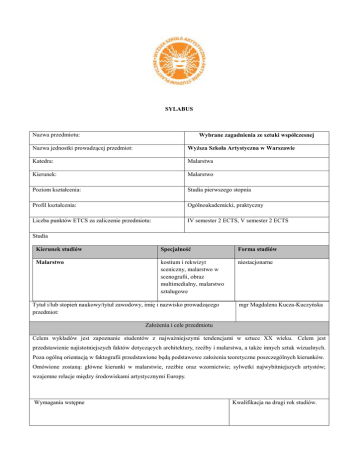 SYLABUS Nazwa przedmiotu: Wybrane zagadnienia ze sztuki współczesnej Nazwa jednostki prowadzącej przedmiot: Wyższa Szkoła Artystyczna w Warszawie Katedra: Malarstwa Kierunek: Malarstwo Poziom kształcenia: Studia pierwszego stopnia Profil kształcenia: Ogólnoakademicki, praktyczny Liczba punktów ETCS za zaliczenie przedmiotu: IV semester 2 ECTS, V semester 2 ECTS Studia Kierunek studiów Specjalność Forma studiów Malarstwo kostium i rekwizyt sceniczny, malarstwo w scenografii, obraz multimedialny, malarstwo sztalugowe niestacjonarne Tytuł i/lub stopień naukowy/tytuł zawodowy, imię i nazwisko prowadzącego przedmiot: mgr Magdalena Kucza-Kuczyńska Założenia i cele przedmiotu Celem wykładów jest zapoznanie studentów z najważniejszymi tendencjami w sztuce XX wieku. Celem jest przedstawienie najistotniejszych faktów dotyczących architektury, rzeźby i malarstwa, a także innych sztuk wizualnych. Poza ogólną orientacją w faktografii przedstawione będą podstawowe założenia teoretyczne poszczególnych kierunków. Omówione zostaną: główne kierunki w malarstwie, rzeźbie oraz wzornictwie; sylwetki najwybitniejszych artystów; wzajemne relacje między środowiskami artystycznymi Europy. Wymagania wstępne Kwalifikacja na drugi rok studiów. Zamierzony efekt kształcenia Symbol efektu kształcenia na poziomie kierunku Opis efektu kształcenia na poziomie przedmiotu Weryfikacja efektu kształcenia K_W06 Ma wiedzę na temat możliwości wyszukiwania oraz docierania do źródeł informacji dotyczących najważniejszych tendencji w sztuce XX wieku. K_W09 Ma wiedze i potrafi swobodnie poruszać się w obrębie podstawowych zagadnień związanych z teorią i historią sztuki współczesnej. K_U17 Potrafi świadomie i umiejętnie wykorzystać swoją wiedzę z historii sztuki XX wieku do realizowania zadań twórczych. K_U21 Ma umiejętność docierania do źródeł informacji, specjalistycznej literatury oraz właściwego twórczego ich interpretowania. - obecność na zajęciach - wygłoszenie referatu wraz z prezentacją multimedialną K_K02 Jest zdolny do gromadzenia i przetwarzania informacji , które mogą być twórczo wykorzystane przy realizacji projektów artystycznych. K_K03 Jest zdolny do zrozumienia i szacunku dla sztuki przez całe życie. K_K08 Jest zdolny do bezstronnej oceny różnorodnych postaw artystycznych , a także zrozumienie i szacunek dla sztuki, efektem kształcenia ma być umiejętność samodzielnej oceny wartości artystycznych dzieł sztuki dzięki znajomości cech stylowych, terminologii. Liczba godzin dydaktycznych i formy zajęć i punkty ECTS: Liczba godzin dydaktycznych (w tym): Przedmioty Forma zajęć: (W - wykład, Ć - ćwiczenia, K konwersatorium) Razem W Ć W+Ć 36 24 12 Wybrane zagadnienia ze sztuki współczensj Rok I W Ć Semestr I ECT K S R W K Rok II Ć Semestr II ECT K S R W Ć Semestr III ECT K S R Rok III W Ć 1 2 6 Semestr IV ECT K S 2 R – rygor (egzamin, - E, zaliczenie z oceną –Zo, zaliczenie – Z 2 R W Zo 12 Ć 6 Semestr V ECT K S 2 R Z o W Rok IV Ć Semestr VI ECT K S R W Semestr VII ECT K S Ć R Treści programowe nauczania [ treść zajęć] SEMESTR IV Wykład 1-4 Polska sztuka XX wieku Wykład stanowi przegląd nowych kierunków w sztuce XX wieku w artystycznej działalności artystów polskich –abstrakcjonizm Strzemioskiego, kubizm Formistów, kubistyczny ekspresjonizm Grupy Krakowskiej , surrealizm i symbolizm Witkacego. Wkład 5-6 Polska Sztuka użytkowa. Spółdzielnia Ład, Zakłady Artystyczno-Badawcze ASP, wzornictwo przemysłowe, projekty mebli i wnętrz Jana Bogusławskiego, Bohdana Pniewskiego. Wykład 7-8 Wykład monograficzny . Malarstwo Jerzego Nowosielskiego jako ewolucja od abstrakcji do sacrum. Fenomen polskiej szkoły grafiki i plakatu. Wykład 9-10. Architektura XX w.– ekspresjonizm konstrukcyjny, brutalizm, architektura organiczna, postmodernizm, high-tech, racjonalizm i minimalizm, dekonstrukcja. Wykład 11-12 Wykład podsumowujący. Synteza dokonań sztuki współczesnej, spojrzenie krytyczne – dyskusja. Ćwiczenie 1-3 Historia wnętrz mieszkalnych. Ewolucja mebla. Analiza historycznego i współczesnego pojęcia komfortu wnętrza – dyskusja. Ćwiczenie 4-6 Sztuka użytkowa i design XX w. Funkcjonalizm i Art Deco, wzornictwo organiczne, pop-art i postmodernizm, funkcjonalizm skandynawski. SEMSTR V Wykład 1-2 Formiści i Kapiści – wprowadzenie do analizypolskiej sztuki współczesnej. Wykład 3-4 Referaty monograficzne – Andrzej Wróblewski, Tadeusz Kantor. Wykład 5-6 Referaty monograficzne – Zbigniew Dwurnik, Nikifor. Wykład 7-8 Referat monograficzny – Jerzy Nowosielski. Wkład 9-10. Referaty monograficzne – Magdalena Abakanowicz. Wykład 11-12 Referaty monograficzne – Hasior, Beksiński. Ćwiczenie 1-3 Przegląd warszawskich galerii sztuki współczesnej. Ćwiczenie 4-6 Muzeum Sztuki Zachęta – wystawa. Zagadnienia programowe nauczania: Narzędzie/ metody dydaktyczne: Większość zajęć ma charakter ćwiczeń polegających na wygłoszeniu przez studentów referatów połączonych z prezentacją multimedialną. Ćwiczenia będą uzupełnione dyskusją ze studentami, pracą grupową przy analizie dzieł sztuki. Forma i sposób zaliczenia oraz wymagania egzaminacyjne: Semestr IV, V zaliczenie składa się z rozmowa na 3 temat omówionych podczas ćwiczeń artystów oraz ocena z referatu Metody i kryteria oceny: aktywność literaturą; na ćwiczeniach, zapoznanie się z Wymagania końcowe: Semestr V, VI – zaliczenie z oceną Całkowity nakład pracy studenta potrzebny do osiągnięcia założonych efektów w godzinach oraz punktach ECTS Wybrane zagadnien ia ze sztuki współczes nej Godziny kontaktow ez nauczyciel em akademic kim 1. Uczestnict wo w zajęciach dydaktycz nych Samodziel na praca studenta 1. Przygotow anie do zaliczeń i egzaminó w 2. Przygotow anie się do zajęć 3. Zapoznani e się ze wskazana literaturą Całkowit y nakład pracy studenta potrze