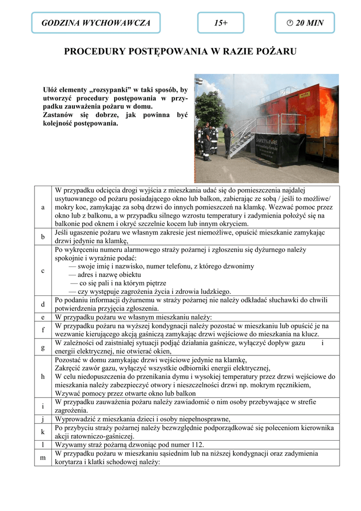 GODZINA WYCHOWAWCZA 15+ 20 MIN PROCEDURY POSTĘPOWANIA W RAZIE POŻARU Ułóż elementy „rozsypanki” w taki sposób, by utworzyć procedury postępowania w przypadku zauważenia pożaru w domu. Zastanów się dobrze, jak powinna być kolejność postępowania. a b c d e f g h i j k l m W przypadku odcięcia drogi wyjścia z mieszkania udać się do pomieszczenia najdalej usytuowanego od pożaru posiadającego okno lub balkon, zabierając ze sobą / jeśli to możliwe/ mokry koc, zamykając za sobą drzwi do innych pomieszczeń na klamkę. Wezwać pomoc przez okno lub z balkonu, a w przypadku silnego wzrostu temperatury i zadymienia położyć się na balkonie pod oknem i okryć szczelnie kocem lub innym okryciem. Jeśli ugaszenie pożaru we własnym zakresie jest niemożliwe, opuścić mieszkanie zamykając drzwi jedynie na klamkę, Po wykręceniu numeru alarmowego straży pożarnej i zgłoszeniu się dyżurnego należy spokojnie i wyraźnie podać: — swoje imię i nazwisko, numer telefonu, z którego dzwonimy — adres i nazwę obiektu — co się pali i na którym piętrze — czy występuje zagrożenia życia i zdrowia ludzkiego. Po podaniu informacji dyżurnemu w straży pożarnej nie należy odkładać słuchawki do chwili potwierdzenia przyjęcia zgłoszenia. W przypadku pożaru we własnym mieszkaniu należy: W przypadku pożaru na wyższej kondygnacji należy pozostać w mieszkaniu lub opuścić je na wezwanie kierującego akcją gaśniczą zamykając drzwi wejściowe do mieszkania na klucz. W zależności od zaistniałej sytuacji podjąć działania gaśnicze, wyłączyć dopływ gazu i energii elektrycznej, nie otwierać okien, Pozostać w domu zamykając drzwi wejściowe jedynie na klamkę, Zakręcić zawór gazu, wyłączyć wszystkie odbiorniki energii elektrycznej, W celu niedopuszczenia do przenikania dymu i wysokiej temperatury przez drzwi wejściowe do mieszkania należy zabezpieczyć otwory i nieszczelności drzwi np. mokrym ręcznikiem, Wzywać pomocy przez otwarte okno lub balkon W przypadku zauważenia pożaru należy zawiadomić o nim osoby przebywające w strefie zagrożenia. Wyprowadzić z mieszkania dzieci i osoby niepełnosprawne, Po przybyciu straży pożarnej należy bezwzględnie podporządkować się poleceniom kierownika akcji ratowniczo-gaśniczej. Wzywamy straż pożarną dzwoniąc pod numer 112. W przypadku pożaru w mieszkaniu sąsiednim lub na niższej kondygnacji oraz zadymienia korytarza i klatki schodowej należy: Rozwiązanie 1 i 2 l 3 c 4 d 5 e 6 j 7 g 8 b 9 a 10 m 11 h 12 f 13 k
