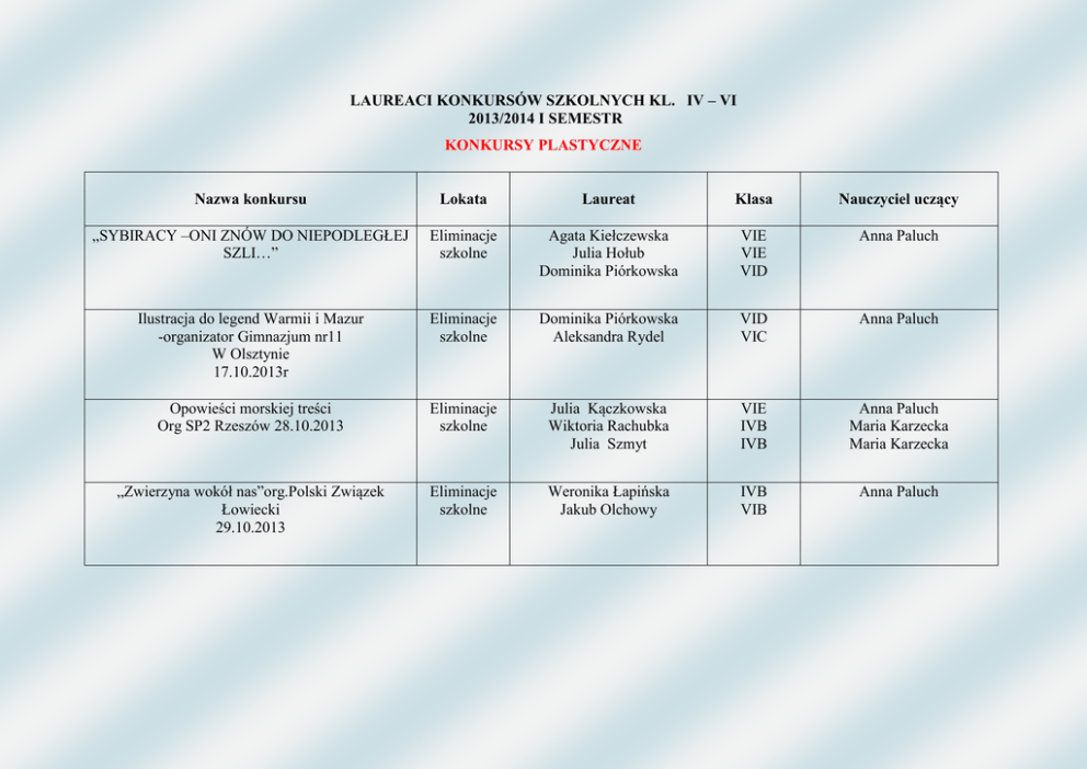 LAUREACI KONKURSÓW SZKOLNYCH KL. IV – VI 2013/2014 I SEMESTR KONKURSY PLASTYCZNE Nazwa konkursu Lokata Laureat Klasa Nauczyciel uczący „SYBIRACY –ONI ZNÓW DO NIEPODLEGŁEJ SZLI…” Eliminacje szkolne Agata Kiełczewska Julia Hołub Dominika Piórkowska VIE VIE VID Anna Paluch Ilustracja do legend Warmii i Mazur -organizator Gimnazjum nr11 W Olsztynie 17.10.2013r Eliminacje szkolne Dominika Piórkowska Aleksandra Rydel VID VIC Anna Paluch Opowieści morskiej treści Org SP2 Rzeszów 28.10.2013 Eliminacje szkolne Julia Kączkowska Wiktoria Rachubka Julia Szmyt VIE IVB IVB Anna Paluch Maria Karzecka Maria Karzecka „Zwierzyna wokół nas”org.Polski Związek Łowiecki 29.10.2013 Eliminacje szkolne Weronika Łapińska Jakub Olchowy IVB VIB Anna Paluch LAUREACI KONKURSÓW POZASZKOLNYCH KL. IV – VI 2012/2013 II SEMESTR KONKURSY PLASTYCZNE Nazwa konkursu Lokata Laureat Klasa Nauczyciel uczący “SYBIRACY –ONI ZNÓW DO NIEPODLEGŁEJ SZLI…” Organizator –Gimnazjum nr 12 w Olsztynie 17.09.2013 r. Ilustracja do legend Warmii i Mazur -organizator Gimnazjum nr11 W Olsztynie 17.10.2013r III MIEJSCE Julia Hołub VI e Anna Paluch WYRÓŻNIENIE Aleksandra Rydel Dominika Piórkowska VIC VI D Anna Paluch KOORDYNATOR KONKURSÓW PLASTYCZNYCH ANNA PALUCH LAUREACI KONKURSÓW SZKOLNYCH KL. IV – VI 2013/2014 II SEMESTR KONKURSY PLASTYCZNE Nazwa konkursu Lokata Laureat Klasa Nauczyciel uczący Moje Anioly –org. Młodzieżowy Dom Kultury w Chodzieży Eliminacje szkolne ZUZANNA BAŁDYGA IV D Anna Paluch Wakacje pod żaglami XV Ogolnopolski Konkurs Plastyczny Org. Bałucki Ośrodek Kultury w Łodzi Eliminacje szkolne ZUZANNA BAŁDYGA IV D Anna Paluch RAZEM – org.ZS2 SP25 Z OI w Elblągu Eliminacje szkolne Eliminacje szkolne 5A 4C 4E 5A 4E 4C 4A 4D 6C 4E 4E 5B 4D 5C 4E Anna Paluch IV Międzynarodowy Konkurs Plastyczny MDK Kraków „Przyroda w Kolorach 2014-Podwodny Swiat” ADAM GASZYK NATALIA GLUSIEC ANNA POLAKOWSKA DOMINIKA NAJMOWICZ JULIA WRÓBLEWSKA KATARZYNA LIBERT ALICJA WOLIŃSKA ZUZANNA BALDYGA ALEKSANDRA RYDEL LISA VAN DER BURGT NIKOLA GRABOWSKA MAGDALENA KURENDA MAJA SZCZEPAŃSKA EDYTA MEJŁUN LAURA SUDZIŃSKA Anna Paluch Moja wymarzona wycieczka w kampanii Jadę nie tankuję 2014 Eliminacje szkolne WIOLETTA FABCZAK WIKTORIA SKÓRNIEWSKA DOMINIKA NAJMOWICZ KLAUDIA GÓRALSKA NIKOLA NOWEK WERONIKA ŁAPIŃSKA NATALIA BOJANOWSKA OLIWIA MALESZEWSKA 4E 5A 5A 5A 6D 4B 5B 4D WIKTORIA SKÓRNIEWSKA DOMINIKA NAJMOWICZ WERONIKA ŁAPIŃSKA ZUZANNA BALDYGA LAURA SUDZIŃSKA ALICJA WOLIŃSKA MARTYNA BARTCZAK WIKTORIA STOPA WIOLETTA FABCZAK LISA VAN DER BURGT JULIA SZMYT 5A 5A 4B 4D 4E 4A 4E 5B 4E 4E 4B Anna Paluch LAUREACI KONKURSÓW POZASZKOLNYCH KL. IV – VI 2013/2014 II SEMESTR KONKURSY PLASTYCZNE Nazwa konkursu Lokata Laureat Klasa Nauczyciel uczący “ Wakacje pod żaglami XV Ogólnopolski Konkurs Plastyczny Org. Bałucki Ośrodek Kultury w Łodzi Moja wymarzona wycieczka w kampanii Jadę nie tankuję 2014 Praca zakwalifikowana na wystawę w galerii Zuzanna Bałdyga 4d Anna Paluch Wyróżnienie Wiktoria Skórniewska 5a Anna Paluch KOORDYNATOR KONKURSÓW PLASTYCZNYCH ANNA PALUCH