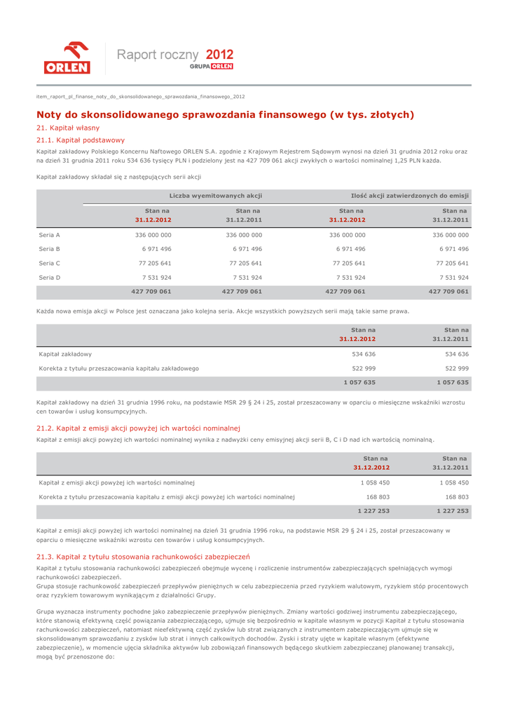item_raport_pl_finanse_noty_do_skonsolidowanego_sprawozdania_finansowego_2012 Noty do skonsolidowanego sprawozdania finansowego (w tys. złotych) 21. Kapitał własny 21.1. Kapitał podstawowy Kapitał zakładowy Polskiego Koncernu Naftowego ORLEN S.A. zgodnie z Krajowym Rejestrem Sądowym wynosi na dzień 31 grudnia 2012 roku oraz na dzień 31 grudnia 2011 roku 534 636 tysięcy PLN i podzielony jest na 427 709 061 akcji zwykłych o wartości nominalnej 1,25 PLN każda. Kapitał zakładowy składał się z następujących serii akcji Liczba wyemitowanych akcji Stan na Stan na Ilość akcji zatwierdzonych do emisji Stan na Stan na 31.12.2012 31.12.2011 31.12.2012 31.12.2011 Seria A 336 000 000 336 000 000 336 000 000 336 000 000 Seria B 6 971 496 6 971 496 6 971 496 6 971 496 Seria C 77 205 641 77 205 641 77 205 641 77 205 641 Seria D 7 531 924 7 531 924 7 531 924 7 531 924 427 709 061 427 709 061 427 709 061 427 709 061 Każda nowa emisja akcji w Polsce jest oznaczana jako kolejna seria. Akcje wszystkich powyższych serii mają takie same prawa. Stan na Stan na 31.12.2012 31.12.2011 Kapitał zakładowy 534 636 534 636 Korekta z tytułu przeszacowania kapitału zakładowego 522 999 522 999 1 057 635 1 057 635 Kapitał zakładowy na dzień 31 grudnia 1996 roku, na podstawie MSR 29 § 24 i 25, został przeszacowany w oparciu o miesięczne wskaźniki wzrostu cen towarów i usług konsumpcyjnych. 21.2. Kapitał z emisji akcji powyżej ich wartości nominalnej Kapitał z emisji akcji powyżej ich wartości nominalnej wynika z nadwyżki ceny emisyjnej akcji serii B, C i D nad ich wartością nominalną. Kapitał z emisji akcji powyżej ich wartości nominalnej Korekta z tytułu przeszacowania kapitału z emisji akcji powyżej ich wartości nominalnej Stan na Stan na 31.12.2012 31.12.2011 1 058 450 1 058 450 168 803 168 803 1 227 253 1 227 253 Kapitał z emisji akcji powyżej ich wartości nominalnej na dzień 31 grudnia 1996 roku, na podstawie MSR 29 § 24 i 25, został przeszacowany w oparciu o miesięczne wskaźniki wzrostu cen towarów i usług konsumpcyjnych. 21.3. Kapitał z tytułu stosowania rachunkowości zabezpieczeń Kapitał z tytułu stosowania rachunkowości zabezpieczeń obejmuje wycenę i rozliczenie instrumentów zabezpieczających spełniających wymogi rachunkowości zabezpieczeń. Grupa stosuje rachunkowość zabezpieczeń przepływów pieniężnych w celu zabezpieczenia przed ryzykiem walutowym, ryzykiem stóp procentowych oraz ryzykiem towarowym wynikającym z działalności Grupy. Grupa wyznacza instrumenty pochodne jako zabezpieczenie przepływów pieniężnych. Zmiany wartości godziwej instrumentu zabezpieczającego, które stanowią efektywną część powiązania zabezpieczającego, ujmuje się bezpośrednio w kapitale własnym w pozycji Kapitał z tytułu stosowania rachunkowości zabezpieczeń, natomiast nieefektywną część zysków lub strat związanych z instrumentem zabezpieczającym ujmuje się w skonsolidowanym sprawozdaniu z zysków lub strat i innych całkowitych dochodów. Zyski i straty ujęte w kapitale własnym (efektywne zabezpieczenie), w momencie ujęcia składnika aktywów lub zobowiązań finansowych będącego skutkiem zabezpieczanej planowanej transakcji, mogą być przenoszone do: - skonsolidowanego sprawozdania z zysków lub strat i innych całkowitych dochodów lub; - wartości początkowej rzeczowych aktywów trwałych i w okresach następnych ujmowane w skonsolidowanym sprawozdaniu z zysków lub strat i innych całkowitych dochodów poprzez odpisy amortyzacyjne. 21.4. Kapitał z aktualizacji wyceny Kapitał z aktualizacji wyceny obejmuje różnicę pomiędzy wartością księgową netto a wartością godziwą nieruchomości na dzień jej przekwalifikowania z nieruchomości zajmowanych przez Grupę do nieruchomości inwestycyjnych. 21.5. Różnice kursowe z przeliczenia jednostek podporządkowanych Różnice kursowe z przeliczenia jednostek podporządkowanych obejmują efekt przeliczenia sprawozdań finansowych zagranicznych spółek Grupy Kapitałowej z walut obcych na PLN na potrzeby konsolidacji oraz różnice kursowe z tytułu wyceny zobowiązań kredytowych w USD ujmowanych jako zabezpieczenie inwestycji netto w podmiocie zagranicznym. Dodatkowe informacje w zakresie rachunkowości zabezpieczeń inwestycji netto w podmiocie zagranicznym przedstawiono w nocie 35.6.3 21.6 Zyski zatrzymane Kapitał zapasowy Pozostałe kapitały Zysk netto okresu przypadający na akcjonariuszy jednostki dominującej Stan na Stan na 31.12.2012 31.12.2011 20 951 298 18 605 124 883 740 883 740 2 344 594 2 363 397 24 179 632 21 852 261 21.7. Kapitał własny przypadający udziałom niekontrolującym Stan na Stan na 31.12.2012 31.12.2011 1 669 234 1 953 228 Grupa Kapitałowa Anwil 35 412 117 532 Grupa Kapitałowa Rafineria Trzebinia 55 150 51 423 Grupa Kapitałowa Rafineria Nafty Jedlicze 69 14 100 Inowrocławskie Kopalnie Soli “Solino" S.A. 56 2 928 - 31 471 67 725 94 228 1 827 646 2 264 910 Grupa Kapitałowa Unipetrol Petrolot Sp. z o.o. Pozostałe spółki W 2012 roku oraz w 2011 roku kapitały własne przypadające udziałowcom niekontrolującym zostały skorygowane o przypadający na nich udział w wyniku poszczególnych spółek Grupy, wypłacone i zadeklarowane dywidendy, odpowiednie części kapitału z tytułu stosowania rachunkowości zabezpieczeń i kapitału z aktualizacji wyceny oraz zmiany wynikające z wykupu akcjonariuszy/udziałowców mniejszościowych (zmiany udziałów jednostki dominującej w liczbie głosów). 21.8. Propozycja podziału zysku Jednostki Dominującej za 2012 rok Zgodnie ze strategią Grupy ORLEN na lata 2013-2017 poziom dywidendy będzie uzależniony od średniego kursu akcji PKN ORLEN za poprzedni rok, z uwzględnieniem realizacji strategicznych celów i zachowaniu bezpiecznych wskaźników finansowych (takich jak dźwignia finansowa netto, wskaźnik dług netto/zysk operacyjny powiększony o amortyzację (EBITDA) i prognoz 