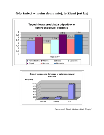 Gdy śmieci w moim domu miej, to Ziemi jest lżej Tygodniowa produkcja odpadów w czteroosobowej rodzinie 4 3,5 3 2,5 2 1,5 1 0,5 0 3,54 3,56 3,12 2,75 2,59 2,42 1,93 kilogramy Poniedziałek Piątek Wtorek Sobota Środa Niedziela Czwartek Śmieci wyrzucane do kosza w czteroosobowej rodzinie kilogramy 1200 1035,32 1000 800 600 400 200 0 19,91 tydzień 79,64 miesiąc rok Opracowali: Kamil Moćkun, Jakub Siergiej Tygodniowa ilość śmieci w rodzinie kg 4 3,5 3 2,5 2 1,5 1 0,5 0 poniedziałek wtorek środa czwartek piątek sobota Roczna ilość śmieci w czteroosobowej rodzinie kg 967,2 1000 800 600 400 200 0 18,6 tydzień 74,4 miesiąc rok niedziela Roczna ilość śmieci wytworzona przez mieszkańców Krasnopola 394996 kg 400000 300000 200000 5673 22692 100000 0 tydzień miesiąc rok Opracowali: Emilia Grygoruk, Tomasz Misiewicz Produkcja odpadów w sześcioosobowej rodzinie w ciągu togodnia 1,8 2 1,5 1 1 1 1 0,6 0,5 0,5 kg 0,4 ek pi ąt to re k śr od a cz w ar te k w so bo ta ni ed zi el a po n ie dz ia łe k 0 Zawartość różnych odpadów w koszu 1,2 Aluminium 0,8 Szkło 0,6 Papier 0,4 Plastik 0,2 Odpady organiczne ni ed zie la a so bo t pi ąt ek cz wa rte k śr od a wt or ek zia łe k 0 Po ni ed kg 1 Tygodniowa ilość różnych odpadów w koszu 0,7 3,05 1,65 Aluminium Szkło Papier Plastik 1,6 1,2 Odpady organiczne Opracowali: Marlena Wiszniewska, Damian Ambrosiewicz