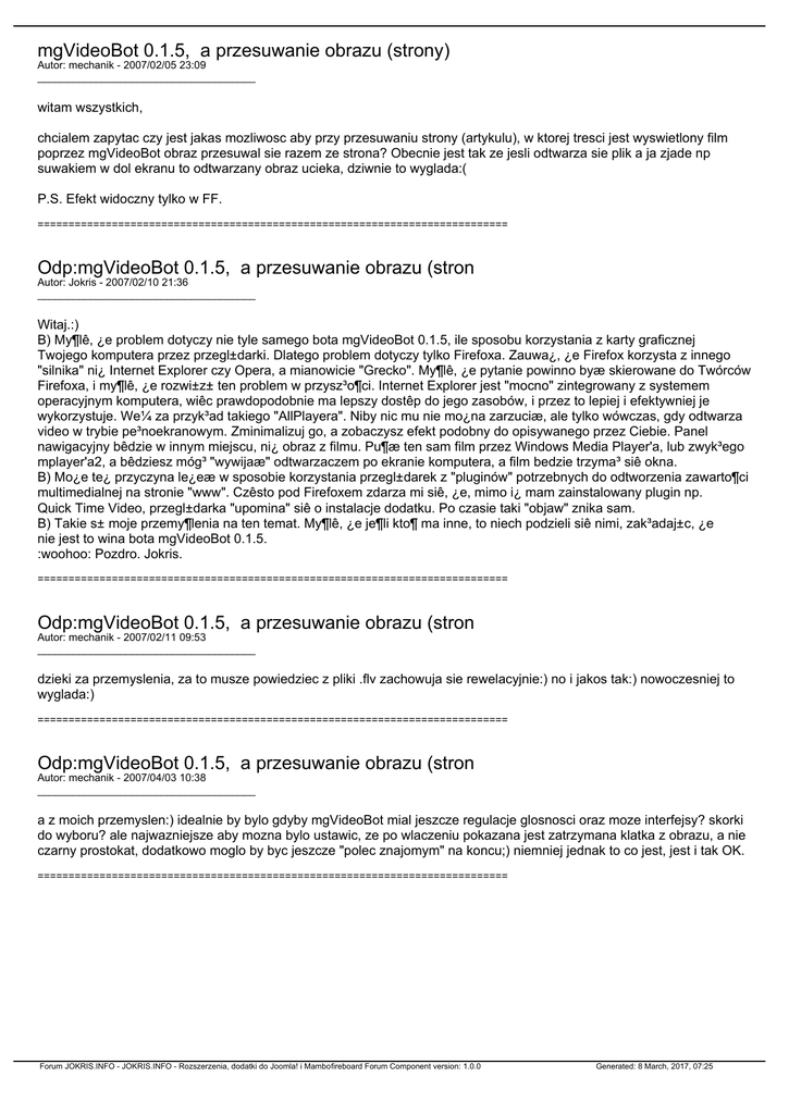 mgVideoBot 0.1.5, a przesuwanie obrazu (strony) Autor: mechanik - 2007/02/05 23:09 _____________________________________ witam wszystkich, chcialem zapytac czy jest jakas mozliwosc aby przy przesuwaniu strony (artykulu), w ktorej tresci jest wyswietlony film poprzez mgVideoBot obraz przesuwal sie razem ze strona? Obecnie jest tak ze jesli odtwarza sie plik a ja zjade np suwakiem w dol ekranu to odtwarzany obraz ucieka, dziwnie to wyglada:( P.S. Efekt widoczny tylko w FF. ============================================================================ Odp:mgVideoBot 0.1.5, a przesuwanie obrazu (stron Autor: Jokris - 2007/02/10 21:36 _____________________________________ Witaj.:) B) My¶lê, ¿e problem dotyczy nie tyle samego bota mgVideoBot 0.1.5, ile sposobu korzystania z karty graficznej Twojego komputera przez przegl±darki. Dlatego problem dotyczy tylko Firefoxa. Zauwa¿, ¿e Firefox korzysta z innego "silnika" ni¿ Internet Explorer czy Opera, a mianowicie "Grecko". My¶lê, ¿e pytanie powinno byæ skierowane do Twórców Firefoxa, i my¶lê, ¿e rozwi±z± ten problem w przysz³o¶ci. Internet Explorer jest "mocno" zintegrowany z systemem operacyjnym komputera, wiêc prawdopodobnie ma lepszy dostêp do jego zasobów, i przez to lepiej i efektywniej je wykorzystuje. We¼ za przyk³ad takiego "AllPlayera". Niby nic mu nie mo¿na zarzuciæ, ale tylko wówczas, gdy odtwarza video w trybie pe³noekranowym. Zminimalizuj go, a zobaczysz efekt podobny do opisywanego przez Ciebie. Panel nawigacyjny bêdzie w innym miejscu, ni¿ obraz z filmu. Pu¶æ ten sam film przez Windows Media Player'a, lub zwyk³ego mplayer'a2, a bêdziesz móg³ "wywijaæ" odtwarzaczem po ekranie komputera, a film bedzie trzyma³ siê okna. B) Mo¿e te¿ przyczyna le¿eæ w sposobie korzystania przegl±darek z "pluginów" potrzebnych do odtworzenia zawarto¶ci multimedialnej na stronie "www". Czêsto pod Firefoxem zdarza mi siê, ¿e, mimo i¿ mam zainstalowany plugin np. Quick Time Video, przegl±darka "upomina" siê o instalacje dodatku. Po czasie taki "objaw" znika sam. B) Takie s± moje przemy¶lenia na ten temat. My¶lê, ¿e je¶li kto¶ ma inne, to niech podzieli siê nimi, zak³adaj±c, ¿e nie jest to wina bota mgVideoBot 0.1.5. :woohoo: Pozdro. Jokris. ============================================================================ Odp:mgVideoBot 0.1.5, a przesuwanie obrazu (stron Autor: mechanik - 2007/02/11 09:53 _____________________________________ dzieki za przemyslenia, za to musze powiedziec z pliki .flv zachowuja sie rewelacyjnie:) no i jakos tak:) nowoczesniej to wyglada:) ============================================================================ Odp:mgVideoBot 0.1.5, a przesuwanie obrazu (stron Autor: mechanik - 2007/04/03 10:38 _____________________________________ a z moich przemyslen:) idealnie by bylo gdyby mgVideoBot mial jeszcze regulacje glosnosci oraz moze interfejsy? skorki do wyboru? ale najwazniejsze aby mozna bylo ustawic, ze po wlaczeniu pokazana jest zatrzymana klatka z obrazu, a nie czarny prostokat, dodatkowo moglo by byc jeszcze "polec znajomym" na koncu;) niemniej jednak to co jest, jest i tak OK. ============================================================================ Forum JOKRIS.INFO - JOKRIS.INFO - Rozszerzenia, dodatki do Joomla! i Mambofireboard Forum Component version: 1.0.0 Generated: 8 March, 2017, 07:25