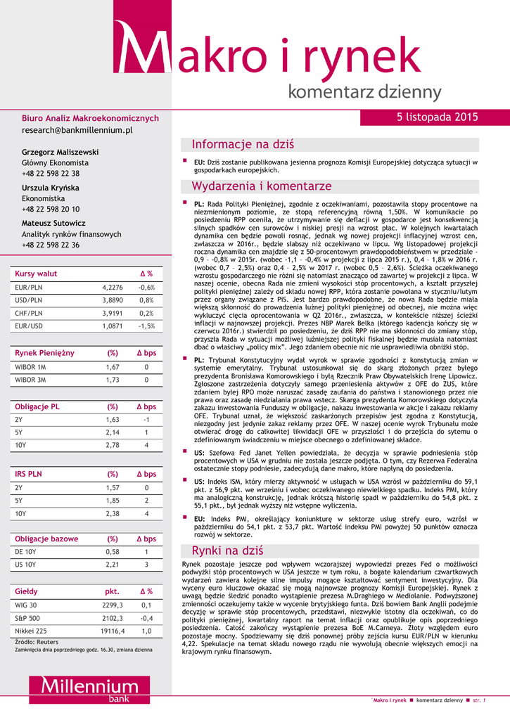 5 listopada 2015 Biuro Analiz Makroekonomicznych [email protected] Informacje na dziś Grzegorz Maliszewski Główny Ekonomista +48 22 598 22 38 EU: Dziś zostanie publikowana jesienna prognoza Komisji Europejskiej dotycząca sytuacji w gospodarkach europejskich. Wydarzenia i komentarze Urszula Kryńska Ekonomistka +48 22 598 20 10 Mateusz Sutowicz Analityk rynków finansowych +48 22 598 22 36 Kursy walut Δ% EUR/PLN 4,2276 -0,6% USD/PLN 3,8890 0,8% CHF/PLN 3,9191 0,2% EUR/USD 1,0871 -1,5% Rynek Pieniężny (%) Δ bps WIBOR 1M 1,67 0 WIBOR 3M 1,73 0 Obligacje PL (%) Δ bps 2Y 1,63 -1 5Y 2,14 1 10Y 2,78 4 IRS PLN (%) Δ bps 2Y 1,57 0 5Y 1,85 2 10Y 2,38 4 Obligacje bazowe (%) Δ bps DE 10Y 0,58 1 US 10Y 2,21 3 Giełdy pkt. Δ% WIG 30 2299,3 0,1 S&P 500 2102,3 -0,4 Nikkei 225 19116,4 1,0 Źródło: Reuters Zamknięcia dnia poprzedniego godz. 16.30, zmiana dzienna PL: Rada Polityki Pieniężnej, zgodnie z oczekiwaniami, pozostawiła stopy procentowe na niezmienionym poziomie, ze stopą referencyjną równą 1,50%. W komunikacie po posiedzeniu RPP oceniła, że utrzymywanie się deflacji w gospodarce jest konsekwencją silnych spadków cen surowców i niskiej presji na wzrost płac. W kolejnych kwartałach dynamika cen będzie powoli rosnąć, jednak wg nowej projekcji inflacyjnej wzrost cen, zwłaszcza w 2016r., będzie słabszy niż oczekiwano w lipcu. Wg listopadowej projekcji roczna dynamika cen znajdzie się z 50-procentowym prawdopodobieństwem w przedziale 0,9 – -0,8% w 2015r. (wobec -1,1 – -0,4% w projekcji z lipca 2015 r.), 0,4 – 1,8% w 2016 r. (wobec 0,7 – 2,5%) oraz 0,4 – 2,5% w 2017 r. (wobec 0,5 – 2,6%). Ścieżka oczekiwanego wzrostu gospodarczego nie różni się natomiast znacząco od zawartej w projekcji z lipca. W naszej ocenie, obecna Rada nie zmieni wysokości stóp procentowych, a kształt przyszłej polityki pieniężnej zależy od składu nowej RPP, która zostanie powołana w styczniu/lutym przez organy związane z PiS. Jest bardzo prawdopodobne, że nowa Rada będzie miała większą skłonność do prowadzenia luźnej polityki pieniężnej od obecnej, nie można więc wykluczyć cięcia oprocentowania w Q2 2016r., zwłaszcza, w kontekście niższej ścieżki inflacji w najnowszej projekcji. Prezes NBP Marek Belka (którego kadencja kończy się w czerwcu 2016r.) stwierdził po posiedzeniu, że dziś RPP nie ma skłonności do zmiany stóp, przyszła Rada w sytuacji możliwej luźniejszej polityki fiskalnej będzie musiała natomiast dbać o właściwy „policy mix”. Jego zdaniem obecnie nic nie usprawiedliwia obniżki stóp. PL: Trybunał Konstytucyjny wydał wyrok w sprawie zgodności z konstytucją zmian w systemie emerytalny. Trybunał ustosunkował się do skarg złożonych przez byłego prezydenta Bronisława Komorowskiego i byłą Rzecznik Praw Obywatelskich Irenę Lipowicz. Zgłoszone zastrzeżenia dotyczyły samego przeniesienia aktywów z OFE do ZUS, które zdaniem byłej RPO może naruszać zasadę zaufania do państwa i stanowionego przez nie prawa oraz zasadę niedziałania prawa wstecz. Skarga prezydenta Komorowskiego dotyczyła zakazu inwestowania Funduszy w obligacje, nakazu inwestowania w akcje i zakazu reklamy OFE. Trybunał uznał, że większość zaskarżonych przepisów jest zgodna z Konstytucją, niezgodny jest jedynie zakaz reklamy przez OFE. W naszej ocenie wyrok Trybunału może otwierać drogę do całkowitej likwidacji OFE w przyszłości i do przejścia do sytemu o zdefiniowanym świadczeniu w miejsce obecnego o zdefiniowanej składce. US: Szefowa Fed Janet Yellen powiedziała, że decyzja w sprawie podniesienia stóp procentowych w USA w grudniu nie została jeszcze podjęta. O tym, czy Rezerwa Federalna ostatecznie stopy podniesie, zadecydują dane makro, które napłyną do posiedzenia. US: Indeks ISM, który mierzy aktywność w usługach w USA wzrósł w październiku do 59,1 pkt. z 56,9 pkt. we wrześniu i wobec oczekiwanego niewielkiego spadku. Indeks PMI, który ma analogiczną konstrukcję, jednak krótszą historię spadł w październiku do 54,8 pkt. z 55,1 pkt., był jednak wyższy niż wstępne wyliczenia. EU: Indeks PMI, określający koniunkturę w sektorze usług strefy euro, wzrósł w październiku do 54,1 pkt. z 53,7 pkt. Wartość indeksu PMI powyżej 50 punktów oznacza rozwój w sektorze. Rynki na dziś Rynek pozostaje jeszcze pod wpływem wczorajszej wypowiedzi prezes Fed o możliwości podwyżki stóp procentowych w USA jeszcze w tym roku, a bogate kalendarium czwartkowych wydarzeń zawiera kolejne silne impulsy mogące kształtować sentyment inwestycyjny. Dla wyceny euro kluczowe okazać się mogą najnowsze prognozy Komisji Europejskiej. Rynek z uwagą będzie śledzić ponadto wystąpienie prezesa M.Draghiego w Mediolanie. Podwyższonej zmienności oczekujemy także w wycenie brytyjskiego funta. Dziś bowiem Bank Anglii podejmie decyzję w sprawie stóp procentowych, przedstawi, niezwykle istotny dla oczekiwań, co do polityki pieniężnej, kwartalny raport na temat inflacji oraz opublikuje opis poprzedniego posiedzenia. Całość zakończy wystąpienie prezesa BoE M.Carneya. Złoty względem euro pozostaje mocny. Spodziewamy się dziś ponownej próby zejścia kursu EUR/PLN w kierunku 4,22. Spekulacje na temat składu nowego rządu nie wywołują obecnie większych emocji na krajowym rynku finansowym. `Makro i rynek komentarz dzienny str. 1 Rynek krajowy Kursy walutowe EUR/PLN i EUR/USD 4,30 1,16 4,25 1,14 4,20 1,12 4,15 1,10 4,10 1,08 EURPLN EURUSD /prawa skala/ Źródło: Reuters Rentowności polskich obligacji [%] 3,4 Środa upłynęła pod znakiem wyraźnego umocnienia złotego wobec euro, które mogło zaskakiwać w kontekście oczekiwania na retorykę posiedzenia RPP, wystąpienie prezes Fed oraz werdykt Trybunału Konstytucyjnego w sprawie OFE. Kurs EUR/PLN przełamał, poprowadzoną po dołkach z września i października, linię wsparcia chroniącą notowania przed nadmiernym spadkiem. W