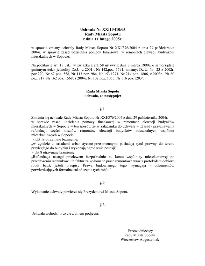 Uchwała Nr XXIII/410/05 Rady Miasta Sopotu z dnia 11 lutego 2005r. w sprawie zmiany uchwały Rady Miasta Sopotu Nr XXI/376/2004 z dnia 29 października 2004r. w sprawie zasad udzielania pomocy finansowej w remontach elewacji budynków mieszkalnych w Sopocie. Na podstawie art. 18 ust.1 w związku z art. 58 ustawy z dnia 8 marca 1990r. o samorządzie gminnym /tekst jednolity Dz.U. z 2001r. Nr 142,poz. 1591, zmiany: Dz.U. Nr 23 z 2002r. poz.220, Nr 62 poz. 558, Nr 113 poz. 984, Nr 153.1271, Nr 214 poz. 1806, z 2003r. Nr 80 poz. 717 Nr 162 poz. 1568, z 2004r. Nr 102 poz. 1055, Nr 116 poz.1203/. Rada Miasta Sopotu uchwala, co następuje: § 1. Zmienia się uchwałę Rady Miasta Sopotu Nr XXI/376/2004 z dnia 29 października 2004r. w sprawie zasad udzielania pomocy finansowej w remontach elewacji budynków mieszkalnych w Sopocie w ten sposób, Ŝe w załączniku do uchwały – „Zasady przyznawania refundacji części kosztów remontów elewacji budynków mieszkalnych wspólnot mieszkaniowych w Sopocie„ - pkt 1c otrzymuje brzmienie: „w zgodzie z zasadami urbanistyczno-przestrzennymi posiadają tytuł prawny do terenu przyległego do budynku i wykonają ogrodzenie posesji” - pkt 8 otrzymuje brzmienie: „Refundacja nastąpi przelewem bezpośrednio na konto wspólnoty mieszkaniowej po przedłoŜeniu rachunków lub faktur za wykonane prace remontowe wraz z protokółem odbioru robót bądź, jeŜeli przepisy Prawa budowlanego tego wymagają - dokumentów potwierdzających formalne zakończenie tych robót.” § 2. Wykonanie uchwały powierza się Prezydentowi Miasta Sopotu. § 3. Uchwała wchodzi w Ŝycie z dniem podjęcia. Przewodniczący Rady Miasta Sopotu Wieczesław Augustyniak Uzasadnienie Uchwała Rady Miasta Sopotu Nr XXI/376/2004 z dnia 29 października 2004r. w sprawie zasad udzielania pomocy finansowej w remontach elewacji budynków mieszkalnych w Sopocie przewiduje, iŜ jednym z warunków otrzymania dofinansowania do remontu elewacji jest wykonanie ogrodzenia posesji w celu zwiększenia ochrony elewacji. Wspólnoty mieszkaniowe, których budynki zostały sprzedane obrysie nie zawsze są zainteresowane regulacją stanu prawnego przyległego do budynku i wykonywaniem ogrodzenia posesji. PoniewaŜ koszty wykonania remontu elewacji są wysokie i stanowią znaczny wysiłek finansowy ze strony mieszkańców i miasta, naleŜy chronić wyremontowane budynki przed zniszczeniem między innymi poprzez ogradzanie posesji. Warunkiem wykonania ogrodzenia jest wykazanie prawa do terenu – w formie własności, uŜytkowania wieczystego bądź dzierŜawy. Dlatego proponuje się, aby wspólnoty mieszkaniowe zwracające się z wnioskiem o udzielenie pomocy finansowej posiadały tytuł prawny do terenu przyległego do budynku w zgodzie z zasadami urbanistyczno-przestrzennymi. Ponadto w związku ze zmianą ustawy – Prawo budowlane proponuje się uszczegółowienie zapisu dotyczącego dokumentów wymaganych przy odbiorze remontów elewacji. Mając na uwadze powyŜsze Prezydent Miasta Sopotu wnioskuje o dokonanie odpowiednich zapisów w Zasadach przyznawania refundacji części kosztów remontów elewacji budynków mieszkalnych wspólnot mieszkaniowych w Sopocie – stanowiących załącznik do uchwały Rady Miasta Sopotu, o której mowa na wstępie.