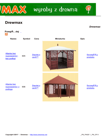Drewmax Drewmax PrzeglÄ…daj Nazwa Symbol Cena Miniaturka Opis Altanka bez wyposazenia i bez podlogi 605 Zapytaj o cenÄ™ Szczegóły produktu Altanka bez wyposazenia i z podloga 606 Zapytaj o cenÄ™ Szczegóły produktu Copyright ©2017 - Drewmax - http://www.drewmax.net _PN_PAGE 1 _PN_OF 6 Altanka szesciokatna komplet z 607 Zapytaj o cenÄ™ Szczegóły produktu Altanka z wyposazeniem 608 Zapytaj o cenÄ™ Szczegóły produktu Altanka z wyposazeniem 610 Zapytaj o cenÄ™ Szczegóły produktu Altanka z wyposazeniem i z 876 podloga Zapytaj o cenÄ™ Szczegóły produktu Copyright ©2017 - Drewmax - http://www.drewmax.net _PN_PAGE 2 _PN_OF 6 Barek sosnowy z 470 ogran nr 30 169.00 zÅ‚ Szczegóły produktu Biblioteczka 39 nieoszklona nr 10 790.00 zÅ‚ Szczegóły produktu Biblioteczka nieoszklona nr 3 38 790.00 zÅ‚ Szczegóły produktu Biblioteczka oszklona nr 1 41 979.00 zÅ‚ Szczegóły produktu Copyright ©2017 - Drewmax - http://www.drewmax.net _PN_PAGE 3 _PN_OF 6 Bielizniarka 2+1 nr 22 92 829.00 zÅ‚ Szczegóły produktu Bielizniarka 2+1 nr 43 89 689.00 zÅ‚ Szczegóły produktu Biurko nr 6 138 609.00 zÅ‚ Szczegóły produktu Biurko duze azurowe nr 3 136 749.00 zÅ‚ Szczegóły produktu Copyright ©2017 - Drewmax - http://www.drewmax.net _PN_PAGE 4 _PN_OF 6 135 789.00 zÅ‚ Szczegóły produktu Biurko narozne nr 137 1 849.00 zÅ‚ Szczegóły produktu Biurko nr 5 901 1 599.00 zÅ‚ Szczegóły produktu Biurko z szufladami nr 4 139 579.00 zÅ‚ Szczegóły produktu Buda M3 611 Zapytaj o cenÄ™ Szczegóły produktu Biurko duze nr 2 Copyright ©2017 - Drewmax - http://www.drewmax.net _PN_PAGE 5 _PN_OF 6 Budka dla szpakow duza G 612 Zapytaj o cenÄ™ Szczegóły produktu • • • • • • • • • • • • • • «« Start « Poprzednia 1 2 3 4 5 6 7 8 9 10 NastÄ™pna » Koniec »» Wyniki 1 - 20 z 607 Copyright ©2017 - Drewmax - http://www.drewmax.net _PN_PAGE 6 _PN_OF 6