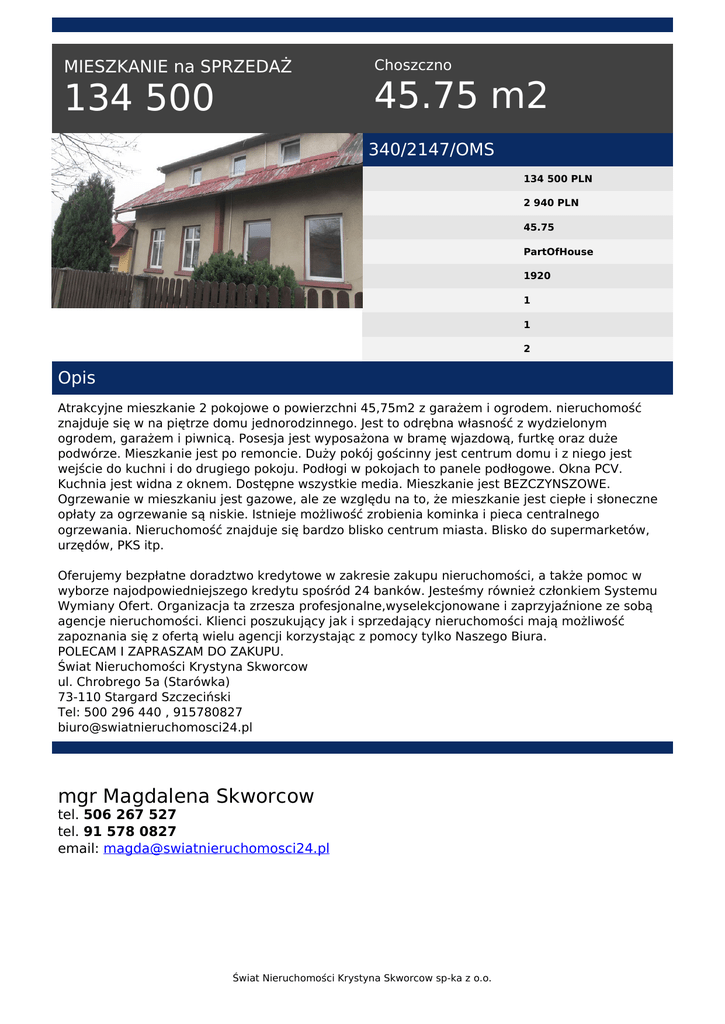 MIESZKANIE na SPRZEDAŻ 134 500 Choszczno 45.75 m2 340/2147/OMS 134 500 PLN 2 940 PLN 45.75 PartOfHouse 1920 1 1 2 Opis Atrakcyjne mieszkanie 2 pokojowe o powierzchni 45,75m2 z garażem i ogrodem. nieruchomość znajduje się w na piętrze domu jednorodzinnego. Jest to odrębna własność z wydzielonym ogrodem, garażem i piwnicą. Posesja jest wyposażona w bramę wjazdową, furtkę oraz duże podwórze. Mieszkanie jest po remoncie. Duży pokój gościnny jest centrum domu i z niego jest wejście do kuchni i do drugiego pokoju. Podłogi w pokojach to panele podłogowe. Okna PCV. Kuchnia jest widna z oknem. Dostępne wszystkie media. Mieszkanie jest BEZCZYNSZOWE. Ogrzewanie w mieszkaniu jest gazowe, ale ze względu na to, że mieszkanie jest ciepłe i słoneczne opłaty za ogrzewanie są niskie. Istnieje możliwość zrobienia kominka i pieca centralnego ogrzewania. Nieruchomość znajduje się bardzo blisko centrum miasta. Blisko do supermarketów, urzędów, PKS itp. Oferujemy bezpłatne doradztwo kredytowe w zakresie zakupu nieruchomości, a także pomoc w wyborze najodpowiedniejszego kredytu spośród 24 banków. Jesteśmy również członkiem Systemu Wymiany Ofert. Organizacja ta zrzesza profesjonalne,wyselekcjonowane i zaprzyjaźnione ze sobą agencje nieruchomości. Klienci poszukujący jak i sprzedający nieruchomości mają możliwość zapoznania się z ofertą wielu agencji korzystając z pomocy tylko Naszego Biura. POLECAM I ZAPRASZAM DO ZAKUPU. Świat Nieruchomości Krystyna Skworcow ul. Chrobrego 5a (Starówka) 73-110 Stargard Szczeciński Tel: 500 296 440 , 915780827 [email protected] mgr Magdalena Skworcow tel. 506 267 527 tel. 91 578 0827 email: [email protected] Świat Nieruchomości Krystyna Skworcow sp-ka z o.o. Powered by TCPDF (www.tcpdf.org)