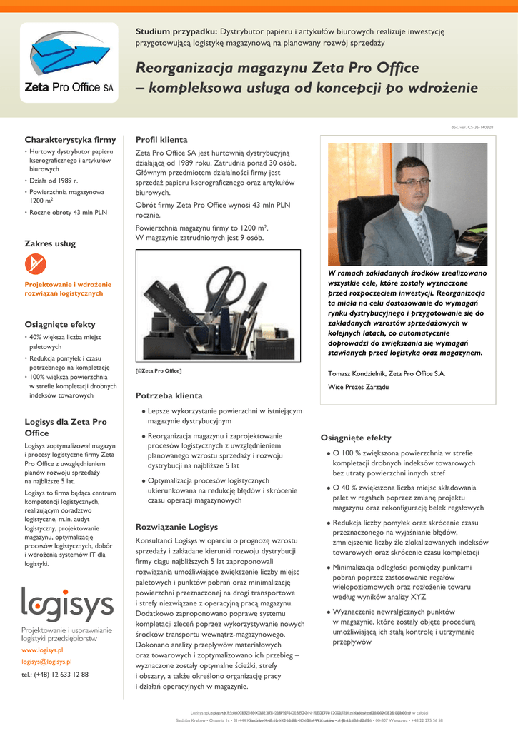 Studium przypadku: Dystrybutor papieru i artykułów biurowych realizuje inwestycję przygotowującą logistykę magazynową na planowany rozwój sprzedaży Reorganizacja magazynu Zeta Pro Office – kompleksowa usługa od koncepcji po wdrożenie doc. ver. CS-35-140328 Charakterystyka firmy Profil klienta • Hurtowy dystrybutor papieru kserograficznego i artykułów biurowych Zeta Pro Office SA jest hurtownią dystrybucyjną działającą od 1989 roku. Zatrudnia ponad 30 osób. Głównym przedmiotem działalności firmy jest sprzedaż papieru kserograficznego oraz artykułów biurowych. • Działa od 1989 r. • Powierzchnia magazynowa 1200 m2 • Roczne obroty 43 mln PLN Zakres usług Obrót firmy Zeta Pro Office wynosi 43 mln PLN rocznie. Powierzchnia magazynu firmy to 1200 m2. W magazynie zatrudnionych jest 9 osób. W ramach zakładanych środków zrealizowano wszystkie cele, które zostały wyznaczone przed rozpoczęciem inwestycji. Reorganizacja ta miała na celu dostosowanie do wymagań rynku dystrybucyjnego i przygotowanie się do zakładanych wzrostów sprzedażowych w kolejnych latach, co automatycznie doprowadzi do zwiększania się wymagań stawianych przed logistyką oraz magazynem. Projektowanie i wdrożenie rozwiązań logistycznych Osiągnięte efekty • 40% większa liczba miejsc paletowych • Redukcja pomyłek i czasu potrzebnego na kompletację • 100% większa powierzchnia w strefie kompletacji drobnych indeksów towarowych Logisys dla Zeta Pro Office Logisys zoptymalizował magazyn i procesy logistyczne firmy Zeta Pro Office z uwzględnieniem planów rozwoju sprzedaży na najbliższe 5 lat. Logisys to firma będąca centrum kompetencji logistycznych, realizującym doradztwo logistyczne, m.in. audyt logistyczny, projektowanie magazynu, optymalizację procesów logistycznych, dobór i wdrożenia systemów IT dla logistyki. www.logisys.pl [email protected] tel.: (+48) 12 633 12 88 [©Zeta Pro Office] Tomasz Kondzielnik, Zeta Pro Office S.A. Potrzeba klienta Wice Prezes Zarządu Lepsze wykorzystanie powierzchni w istniejącym magazynie dystrybucyjnym Reorganizacja magazynu i zaprojektowanie procesów logistycznych z uwzględnieniem planowanego wzrostu sprzedaży i rozwoju dystrybucji na najbliższe 5 lat Optymalizacja procesów logistycznych ukierunkowana na redukcję błędów i skrócenie czasu operacji magazynowych Rozwiązanie Logisys Konsultanci Logisys w oparciu o prognozę wzrostu sprzedaży i zakładane kierunki rozwoju dystrybucji firmy ciągu najbliższych 5 lat zaproponowali rozwiązania umożliwiające zwiększenie liczby miejsc paletowych i punktów pobrań oraz minimalizację powierzchni przeznaczonej na drogi transportowe i strefy niezwiązane z operacyjną pracą magazynu. Dodatkowo zaproponowano poprawę systemu kompletacji zleceń poprzez wykorzystywanie nowych środków transportu wewnątrz-magazynowego. Dokonano analizy przepływów materiałowych oraz towarowych i zoptymalizowano ich przebieg – wyznaczone zostały optymalne ścieżki, strefy i obszary, a także określono organizację pracy i działań operacyjnych w magazynie. Osiągnięte efekty O 100 % zwiększona powierzchnia w strefie kompletacji drobnych indeksów towarowych bez utraty powierzchni innych stref O 40 % zwiększona liczba miejsc składowania palet w regałach poprzez zmianę projektu magazynu oraz rekonfigurację belek regałowych Redukcja liczby pomyłek oraz skrócenie czasu przeznaczonego na wyjaśnianie błędów, zmniejszenie liczby źle zlokalizowanych indeksów towarowych oraz skrócenie czasu kompletacji Minimalizacja odległości pomiędzy punktami pobrań poprzez zastosowanie regałów wielopoziomowych oraz rozłożenie towaru według wyników analizy XYZ Wyznaczenie newralgicznych punktów w magazynie, które zostały objęte procedurą umożliwiającą ich stałą kontrolę i utrzymanie przepływów Logisys sp.Logisys z o.o. •sp. KRS z o.o. 0000232383 • KRS 0000232383 • NIP 676-228-92-61 • NIP 676-228-92-61 • REGON•120027701 REGON 120027701 • Kapitał zakładowy: • Kapitał zakładowy: 625.000,00625.000,00 zł, opłacony zł w całości Siedziba Kraków • Ostatnia 1c • 31-444 Kraków Siedziba• Kraków +48 12 633 • Ostatnia 12 88 •1c Oddział • 31-444 Warszawa Kraków •• al. +48 Jerozolimskie 12 633 12 88 96 • 00-807 Warszawa • +48 22 275 56 58