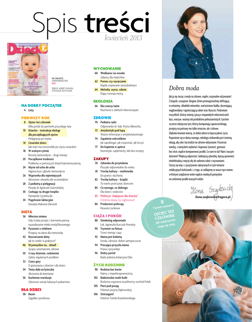 Spis treści kwiecień 2013 WYCHOWANIE NA OKŁADCE: OŚMIOMIESIĘCZNA INEZ ZDJĘCIE: ALBERT ZAWADA STYLIZACJA: EDYTA KILIŚ NA DOBRY POCZĄTEK 4 Listy PIERWSZY ROK 8 Ojciec też człowiek Kilka próśb do partnerki przyszłego taty 10 Dziecko – instrukcja obsługi dla początkujących ojców Pielęgnacja po męsku 14 Cesarskie dzieci Jaki start ma noworodek po cięciu cesarskim 18 W wolnym rytmie Rozwój niemowlęcia – drugi miesiąc 20 Początkowe trudności Problemy w pierwszych dniach karmienia piersią 24 Mycie od ucha do ucha Higiena buzi i główki niemowlęcia 26 Wyprawka dla najmniejszych Akcesoria i ubranka dla wcześniaków 28 Z pediatrą o pielęgnacji Porady dr Agnieszki Gawrońskiej 30 Czekając na drugie lwiątko Pamiętnik Czytelniczki 34 Pogotowie laktacyjne Doradza Malwina Okrzesik DIETA 36 Mleczna zmiana Gdy trzeba przejść z karmienia piersią na podawanie mleka modyfikowanego 38 Pyszności z mlekiem Przepisy na dania dla niemowląt 42 Rozszerzanie diety Jak to zrobić w praktyce? 46 10 pomysłów na... obiad! Sycące, urozmaicone, zdrowe 50 5 razy dziennie, codziennie Zalety regularnych posiłków 52 Czary-gary O gotowaniu z dziećmi i dla dzieci 54 Temu dała na łyżeczkę Akcesoria do karmienia 56 Kuchenne rewolucje Zdrowsze wersje lubianych pokarmów DLA DZIECI 58 Basen Zagadka rysunkowa 60 Wielkanoc na wesoło Zabawy dla maluchów 62 Pomoc czy wyręczanie Mądre wspieranie samodzielności 64 Melodia, wyraz, zdanie Etapy rozwoju mowy Dobra moda Jak ja się cieszę z mody na zdrowe, mądre, racjonalne odżywianie! Z książek, czasopism, blogów, które promują kuchnię obfitującą w witaminy, składniki mineralne, wartościowe białka, doceniającą węglowodany i ograniczającą cukier oraz tłuszcze. Podziwiam wszystkich, którzy mówią i piszą o wspaniałych właściwościach kasz, warzyw, ważnej roli produktów pełnoziarnistych. I jestem szczerze wdzięczna tym, którzy komponują i upowszechniają przepisy na potrawy nie tylko smaczne, ale i zdrowe. Głęboko bowiem wierzę, że dobra dieta to lepsza jakość życia. Pojawienie się w domu nowego, młodego stołownika jest świetną okazją, aby ulec tej modzie na zdrowe odżywianie. Poszerzać wiedzę, z namysłem wybierać i kupować żywność, gotować bez strat, mądrze komponować posiłki. Co nam to da? Nam i naszym dzieciom? Większą odporność, ładniejszą sylwetkę, lepszą sprawność intelektualną i więcej siły do radzenia sobie z wyzwaniami. Cieszę się więc i z pozytywnie zakręconych w tym temacie redakcyjnych koleżanek, i z tego, że oddajemy w wasze ręce numer, w którym znajdziecie wiele mądrze modnych pomysłów na codzienne posiłki waszych rodzin. EKOLOGIA 66 Eko znaczy tanio Rozmowa o zaletach ekorozwiązań ZDROWIE 70 Pediatra radzi Odpowiedzi dr. hab. Piotra Albrechta 72 Antybiotyki pod lupą Ważne informacje o antybiotykoterapii 74 Zapalenie oskrzelików Jak zapobiegać, jak rozpoznać, jak leczyć 77 Do kupienia w aptece Kosmetyki, suplementy, leki bez recepty ZAKUPY 78 Zabawka do przytulania Pluszaki odpowiednie do wieku 81 Trochę kultury – multimedia Do grania i słuchania 82 Trochę kultury – książki To warto przeczytać dzieciom 84 Co nowego, co dobrego Dla dzieci i rodziców 85 Plebiscyt „Najlepsze dla dziecka” Ostatnia okazja, by zagłosować! 86 Producenci polecają Nowości rynkowe CIĄŻA I PORÓD 88 Ginekolog odpowiada Lek. Agnieszka Kurczuk-Powolny 90 Trymestr na finiszu Trzeci miesiąc ciąży 92 Mama jest kobietą Uroda, zdrowie, dobre samopoczucie 94 Pracująca przyszła mama Prawa i przywileje 96 Dobry poród Radzi położna Katarzyna Oleś ŻYCIE RODZINNE 98 Rodzina bez barier Mamy z niepełnosprawnością 102 Białostockie multi-kulti Rodzinna wyprawa na północny wschód Polski 105 Pierś pod presją Felieton Justyny Dąbrowskiej 106 Ostrzegam! Felieton Tomka Kwaśniewskiego 8 [email protected] umeru! Temat n TEŻ OJCIEC IEK W CZŁO czyzna Jak męż tatą ię s staje