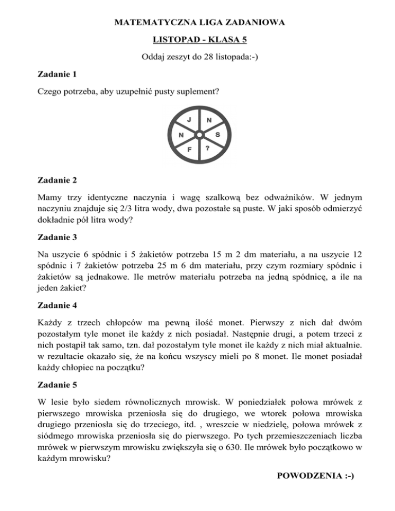 MATEMATYCZNA LIGA ZADANIOWA LISTOPAD - KLASA 5 Oddaj zeszyt do 28 listopada:-) Zadanie 1 Czego potrzeba, aby uzupełnić pusty suplement? Zadanie 2 Mamy trzy identyczne naczynia i wagę szalkową bez odważników. W jednym naczyniu znajduje się 2/3 litra wody, dwa pozostałe są puste. W jaki sposób odmierzyć dokładnie pół litra wody? Zadanie 3 Na uszycie 6 spódnic i 5 żakietów potrzeba 15 m 2 dm materiału, a na uszycie 12 spódnic i 7 żakietów potrzeba 25 m 6 dm materiału, przy czym rozmiary spódnic i żakietów są jednakowe. Ile metrów materiału potrzeba na jedną spódnicę, a ile na jeden żakiet? Zadanie 4 Każdy z trzech chłopców ma pewną ilość monet. Pierwszy z nich dał dwóm pozostałym tyle monet ile każdy z nich posiadał. Następnie drugi, a potem trzeci z nich postąpił tak samo, tzn. dał pozostałym tyle monet ile każdy z nich miał aktualnie. w rezultacie okazało się, że na końcu wszyscy mieli po 8 monet. Ile monet posiadał każdy chłopiec na początku? Zadanie 5 W lesie było siedem równolicznych mrowisk. W poniedziałek połowa mrówek z pierwszego mrowiska przeniosła się do drugiego, we wtorek połowa mrowiska drugiego przeniosła się do trzeciego, itd. , wreszcie w niedzielę, połowa mrówek z siódmego mrowiska przeniosła się do pierwszego. Po tych przemieszczeniach liczba mrówek w pierwszym mrowisku zwiększyła się o 630. Ile mrówek było początkowo w każdym mrowisku? POWODZENIA :-)