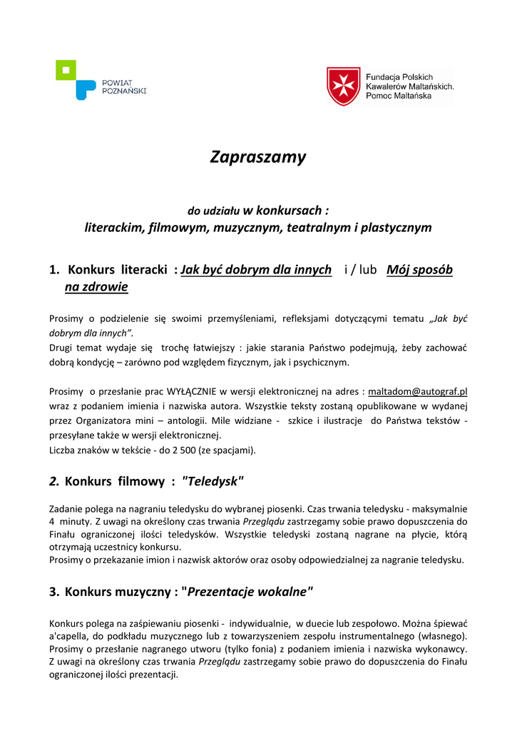 Zapraszamy do udziału w konkursach : literackim, filmowym, muzycznym, teatralnym i plastycznym 1. Konkurs literacki : Jak być dobrym dla innych i / lub Mój sposób na zdrowie Prosimy o podzielenie się swoimi przemyśleniami, refleksjami dotyczącymi tematu „Jak być dobrym dla innych”. Drugi temat wydaje się trochę łatwiejszy : jakie starania Państwo podejmują, żeby zachować dobrą kondycję – zarówno pod względem fizycznym, jak i psychicznym. Prosimy o przesłanie prac WYŁĄCZNIE w wersji elektronicznej na adres : [email protected] wraz z podaniem imienia i nazwiska autora. Wszystkie teksty zostaną opublikowane w wydanej przez Organizatora mini – antologii. Mile widziane - szkice i ilustracje do Państwa tekstów przesyłane także w wersji elektronicznej. Liczba znaków w tekście - do 2 500 (ze spacjami). 2. Konkurs filmowy : "Teledysk" Zadanie polega na nagraniu teledysku do wybranej piosenki. Czas trwania teledysku - maksymalnie 4 minuty. Z uwagi na określony czas trwania Przeglądu zastrzegamy sobie prawo dopuszczenia do Finału ograniczonej ilości teledysków. Wszystkie teledyski zostaną nagrane na płycie, którą otrzymają uczestnicy konkursu. Prosimy o przekazanie imion i nazwisk aktorów oraz osoby odpowiedzialnej za nagranie teledysku. 3. Konkurs muzyczny : "Prezentacje wokalne" Konkurs polega na zaśpiewaniu piosenki - indywidualnie, w duecie lub zespołowo. Można śpiewać a'capella, do podkładu muzycznego lub z towarzyszeniem zespołu instrumentalnego (własnego). Prosimy o przesłanie nagranego utworu (tylko fonia) z podaniem imienia i nazwiska wykonawcy. Z uwagi na określony czas trwania Przeglądu zastrzegamy sobie prawo do dopuszczenia do Finału ograniczonej ilości prezentacji. Czas trwania utworu - maksymalnie 4 minuty. 4. Mała forma teatralna Aktorzy na start (albo raczej na deski) - mają Państwo okazję pochwalić się swoim talentem, aktorskim kunsztem. Podczas "Zlotu Talentów" zaprezentujemy przygotowane przez Państwa mini - spektakle. Czas trwania - maksymalnie 10 minut. Sfilmowane przedstawienie prosimy przesłać do 31 lipca na adres Organizatora (Puszczykowo ul. Dworcowa 16). Z uwagi na określony czas trwania Przeglądu zastrzegamy sobie prawo dopuszczenia do Finału określonej ilości przedstawień. Prosimy także o przesłanie zestawienia elementów wyposażenia, które będą niezbędne do realizacji przedstawienia : stoły, krzesła, liczba mikrofonów itp. 5. Konkurs plastyczny I - "Cztery pory roku" Oczekujemy na prace inspirowane zmieniającą się pod wpływem pór roku przyrodą. Powinny mieć charakter poliptyku (w tym wypadku – składającego się z czterech części) i ukazywać wszystkie pory roku, w ich odmiennych kolorach i kształtach. Wymiary prac : 50 cm x 70cm lub 70cm x 100cm. 6. Konkurs plastyczny II - "Dobro i zło" Dobro i zło istnieją obok siebie. Zadanie polega na zilustrowaniu tej odwiecznej walki. Praca powinna – wykonana techniką dowolną - mieć wymiary: 70cm x 100cm. 50 cm x 70cm 7. Konkurs plastyczny III - "Fantastyczny ptak" Może to być realnie istniejący ptak egzotyczny lub zrodzony w naszej wyobraźni. Do pracy prosimy dołączyć wizytówkę z imieniem i nazwiskiem autora pracy. Forma – praca przestrzenna Technika wykonania i dobór materiałów – dowolne. 8. Konkurs plastyczny IV - "Lampion" Powinien być tak skonstruowany, żeby mógł być bezpiecznie używany w trakcie Gali „Zlotu Talentów” Wielkość lampionu – praktycznie bez ograniczeń lub UWAGI DOTYCZĄCE KONKURSÓW : Szanowni Państwo! Podobnie jak w poprzednich edycjach wybieramy TALENT ROKU. Dlatego też prosimy, żeby prace i utwory zgłaszane do konkursów plastycznych i literackich były wyłącznie dziełami indywidualnymi. "Teledysk", "Mała forma teatralna" oraz "Prezentacje wokalne" mogą być dziełami zespołowymi. Informacje o obowiązujących terminach znajdą Państwo w REGULAMINIE IV PRZEGLĄDU TWÓRCZOŚCI ARTYSTYCZNEJ OSÓB NIEPEŁNOSPRAWNYCH MIESZKANCÓW POWIATU POZNAŃSKIEGO PN. ZLOT TALENTÓW Dodatkowe informacje : 61 819 44 46, 507 117 248, e- mail: [email protected] Serdecznie zapraszamy ! Patronat medialny