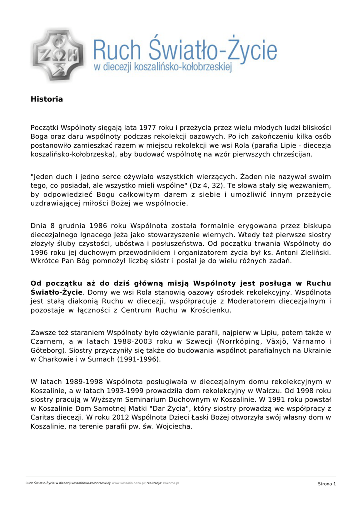 Historia Początki Wspólnoty sięgają lata 1977 roku i przeżycia przez wielu młodych ludzi bliskości Boga oraz daru wspólnoty podczas rekolekcji oazowych. Po ich zakończeniu kilka osób postanowiło zamieszkać razem w miejscu rekolekcji we wsi Rola (parafia Lipie - diecezja koszalińsko-kołobrzeska), aby budować wspólnotę na wzór pierwszych chrześcijan. "Jeden duch i jedno serce ożywiało wszystkich wierzących. Żaden nie nazywał swoim tego, co posiadał, ale wszystko mieli wspólne" (Dz 4, 32). Te słowa stały się wezwaniem, by odpowiedzieć Bogu całkowitym darem z siebie i umożliwić innym przeżycie uzdrawiającej miłości Bożej we wspólnocie. Dnia 8 grudnia 1986 roku Wspólnota została formalnie erygowana przez biskupa diecezjalnego Ignacego Jeża jako stowarzyszenie wiernych. Wtedy też pierwsze siostry złożyły śluby czystości, ubóstwa i posłuszeństwa. Od początku trwania Wspólnoty do 1996 roku jej duchowym przewodnikiem i organizatorem życia był ks. Antoni Zieliński. Wkrótce Pan Bóg pomnożył liczbę sióstr i posłał je do wielu różnych zadań. Od początku aż do dziś główną misją Wspólnoty jest posługa w Ruchu Światło-Życie. Domy we wsi Rola stanowią oazowy ośrodek rekolekcyjny. Wspólnota jest stałą diakonią Ruchu w diecezji, współpracuje z Moderatorem diecezjalnym i pozostaje w łączności z Centrum Ruchu w Krościenku. Zawsze też staraniem Wspólnoty było ożywianie parafii, najpierw w Lipiu, potem także w Czarnem, a w latach 1988-2003 roku w Szwecji (Norrköping, Växjö, Värnamo i Göteborg). Siostry przyczyniły się także do budowania wspólnot parafialnych na Ukrainie w Charkowie i w Sumach (1991-1996). W latach 1989-1998 Wspólnota posługiwała w diecezjalnym domu rekolekcyjnym w Koszalinie, a w latach 1993-1999 prowadziła dom rekolekcyjny w Wałczu. Od 1998 roku siostry pracują w Wyższym Seminarium Duchownym w Koszalinie. W 1991 roku powstał w Koszalinie Dom Samotnej Matki "Dar Życia", który siostry prowadzą we współpracy z Caritas diecezji. W roku 2012 Wspólnota Dzieci Łaski Bożej otworzyła swój własny dom w Koszalinie, na terenie parafii pw. św. Wojciecha. Ruch Światło-Życie w diecezji koszalińsko-kołobrzeskiej: www.koszalin.oaza.pl; realizacja: kokoma.pl Strona 1 Ruch Światło-Życie w diecezji koszalińsko-kołobrzeskiej: www.koszalin.oaza.pl; realizacja: kokoma.pl Strona 2