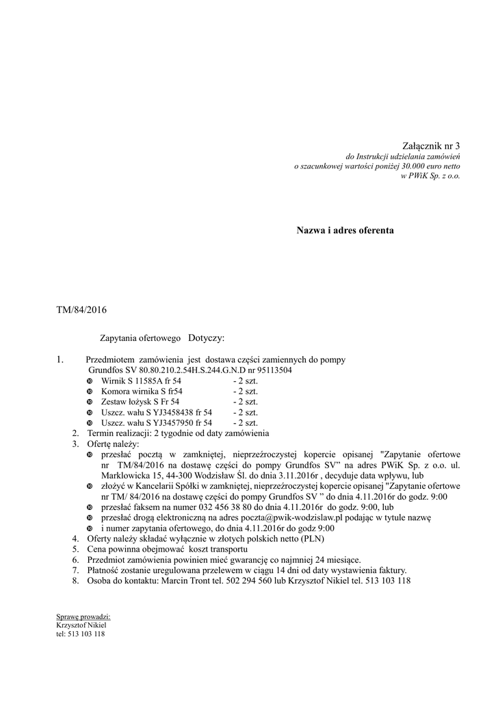 Załącznik nr 3 do Instrukcji udzielania zamówień o szacunkowej wartości poniżej 30.000 euro netto w PWiK Sp. z o.o. Nazwa i adres oferenta TM/84/2016 Zapytania ofertowego Dotyczy: 1. 2. 3. 4. 5. 6. 7. 8. Przedmiotem zamówienia jest dostawa części zamiennych do pompy Grundfos SV 80.80.210.2.54H.S.244.G.N.D nr 95113504 Wirnik S 11585A fr 54 - 2 szt. Komora wirnika S fr54 - 2 szt. Zestaw łożysk S Fr 54 - 2 szt. Uszcz. wału S YJ3458438 fr 54 - 2 szt. Uszcz. wału S YJ3457950 fr 54 - 2 szt. Termin realizacji: 2 tygodnie od daty zamówienia Ofertę należy: przesłać pocztą w zamkniętej, nieprzeźroczystej kopercie opisanej "Zapytanie ofertowe nr TM/84/2016 na dostawę części do pompy Grundfos SV” na adres PWiK Sp. z o.o. ul. Marklowicka 15, 44-300 Wodzisław Śl. do dnia 3.11.2016r , decyduje data wpływu, lub złożyć w Kancelarii Spółki w zamkniętej, nieprzeźroczystej kopercie opisanej "Zapytanie ofertowe nr TM/ 84/2016 na dostawę części do pompy Grundfos SV ” do dnia 4.11.2016r do godz. 9:00 przesłać faksem na numer 032 456 38 80 do dnia 4.11.2016r do godz. 9:00, lub przesłać drogą elektroniczną na adres [email protected] podając w tytule nazwę i numer zapytania ofertowego, do dnia 4.11.2016r do godz 9:00 Oferty należy składać wyłącznie w złotych polskich netto (PLN) Cena powinna obejmować koszt transportu Przedmiot zamówienia powinien mieć gwarancję co najmniej 24 miesiące. Płatność zostanie uregulowana przelewem w ciągu 14 dni od daty wystawienia faktury. Osoba do kontaktu: Marcin Tront tel. 502 294 560 lub Krzysztof Nikiel tel. 513 103 118 Sprawę prowadzi: Krzysztof Nikiel tel: 513 103 118