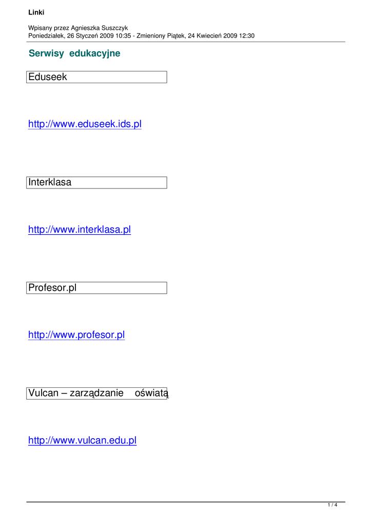 Linki Wpisany przez Agnieszka Suszczyk Poniedziałek, 26 Styczeń 2009 10:35 - Zmieniony Piątek, 24 Kwiecień 2009 12:30 Serwisy edukacyjne Eduseek http://www.eduseek.ids.pl Interklasa http://www.interklasa.pl Profesor.pl http://www.profesor.pl Vulcan – zarządzanie oświatą http://www.vulcan.edu.pl 1/4 Linki Wpisany przez Agnieszka Suszczyk Poniedziałek, 26 Styczeń 2009 10:35 - Zmieniony Piątek, 24 Kwiecień 2009 12:30 Edukus http://www.oeiizk.edu.pl Encyklopedie. Leksykony. Słowniki ernetowa Encyklopedia Multimedialna http://wiem.onet.pl ternetowa Encyklopedia PWN http://encyklopedia.wp.pl Encyklopedia PWN http://encyklopedia.pwn.pl 2/4 Linki Wpisany przez Agnieszka Suszczyk Poniedziałek, 26 Styczeń 2009 10:35 - Zmieniony Piątek, 24 Kwiecień 2009 12:30 lopedia multimedialna PWN Historia http://wm.pwn.pl/historia opedia multimedialna PWN Sztuka http://em.pwn.pl/sztuka opedia multimedialna PWN Nauka http://em.pwn.pl/nauka lopedia multimedialna PWN Biologia http://em.pwn.pl/biologia 3/4 Linki Wpisany przez Agnieszka Suszczyk Poniedziałek, 26 Styczeń 2009 10:35 - Zmieniony Piątek, 24 Kwiecień 2009 12:30 Encyklopedia PRL http://www.eprl.prv.pl ernetowa Encyklopedia zdrowia http://www.zdrowie.med.pl Poczet władców Polski http://www.wiw.pl/historia/poczet 4/4