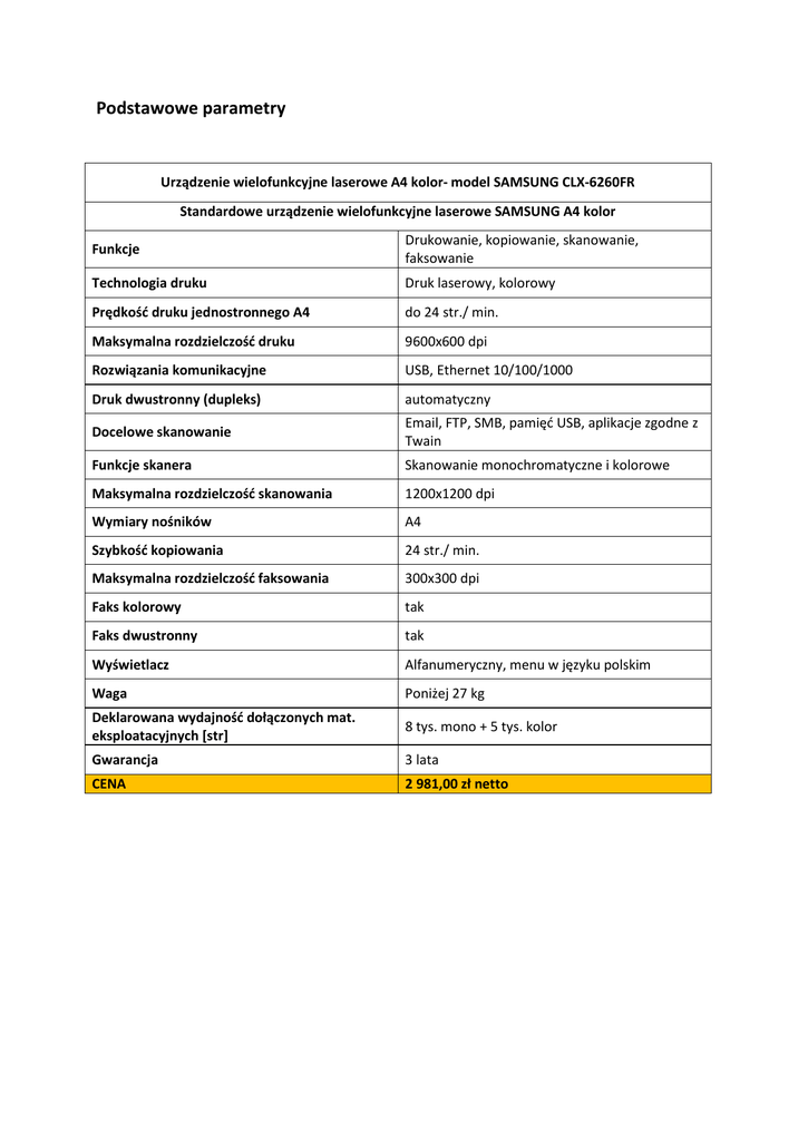 Podstawowe parametry Urządzenie wielofunkcyjne laserowe A4 kolor- model SAMSUNG CLX-6260FR Standardowe urządzenie wielofunkcyjne laserowe SAMSUNG A4 kolor Funkcje Drukowanie, kopiowanie, skanowanie, faksowanie Technologia druku Druk laserowy, kolorowy Prędkość druku jednostronnego A4 do 24 str./ min. Maksymalna rozdzielczość druku 9600x600 dpi Rozwiązania komunikacyjne USB, Ethernet 10/100/1000 Druk dwustronny (dupleks) automatyczny Docelowe skanowanie Email, FTP, SMB, pamięć USB, aplikacje zgodne z Twain Funkcje skanera Skanowanie monochromatyczne i kolorowe Maksymalna rozdzielczość skanowania 1200x1200 dpi Wymiary nośników A4 Szybkość kopiowania 24 str./ min. Maksymalna rozdzielczość faksowania 300x300 dpi Faks kolorowy tak Faks dwustronny tak Wyświetlacz Alfanumeryczny, menu w języku polskim Waga Poniżej 27 kg Deklarowana wydajność dołączonych mat. eksploatacyjnych [str] 8 tys. mono + 5 tys. kolor Gwarancja 3 lata CENA 2 981,00 zł netto