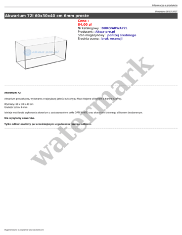 Informacje o produkcie Utworzono 08-03-2017 Akwarium 72l 60x30x40 cm 6mm proste Cena : 84,00 zł Akwarium 72l er m ar k Nr katalogowy : BUKO/AKWA72L Producent : Akwa-pro.pl Stan magazynowy : poniżej średniego Średnia ocena : brak recenzji Akwarium prostokątne, wykonane z najwyższej jakości szkła typu Float klejone silikonem o barwie czarnej. Wymiary: 60 x 30 x 40 cm Grubość szkła: 6 mm Istnieje możliwość wykonania akwarium z zastosowaniem szkła OPTI WHITE oraz akwarium klejonego silikonem bezbarwnym. Nie wysyłamy akwariów. w at Tylko odbiór osobisty po wcześniejszym uzgodnieniu terminu odbioru. Wygenerowano w programie www.oscGold.com