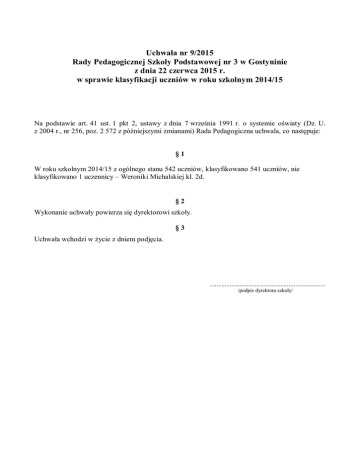 Uchwała nr 9/2015 Rady Pedagogicznej Szkoły Podstawowej nr 3 w Gostyninie z dnia 22 czerwca 2015 r. w sprawie klasyfikacji uczniów w roku szkolnym 2014/15 Na podstawie art. 41 ust. 1 pkt 2, ustawy z dnia 7 września 1991 r. o systemie oświaty (Dz. U. z 2004 r., nr 256, poz. 2 572 z późniejszymi zmianami) Rada Pedagogiczna uchwala, co następuje: §1 W roku szkolnym 2014/15 z ogólnego stanu 542 uczniów, klasyfikowano 541 uczniów, nie klasyfikowano 1 uczennicy – Weroniki Michalskiej kl. 2d. §2 Wykonanie uchwały powierza się dyrektorowi szkoły. §3 Uchwała wchodzi w życie z dniem podjęcia. ..................................................................... /podpis dyrektora szkoły/