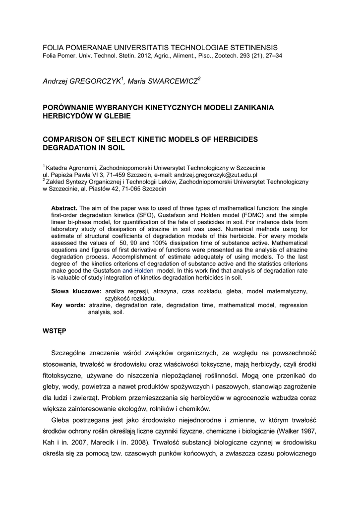 Porównanie wybranych kinetycznych modeli zanikania herbicydów